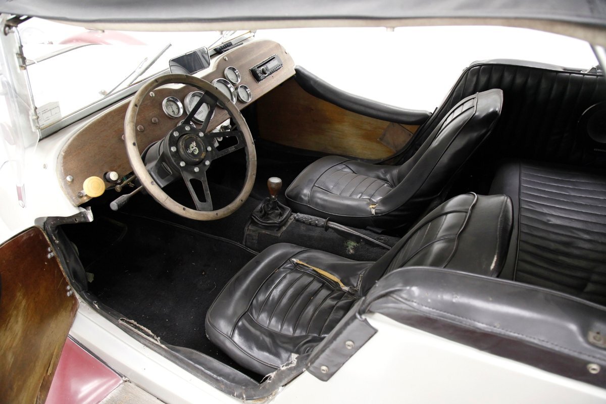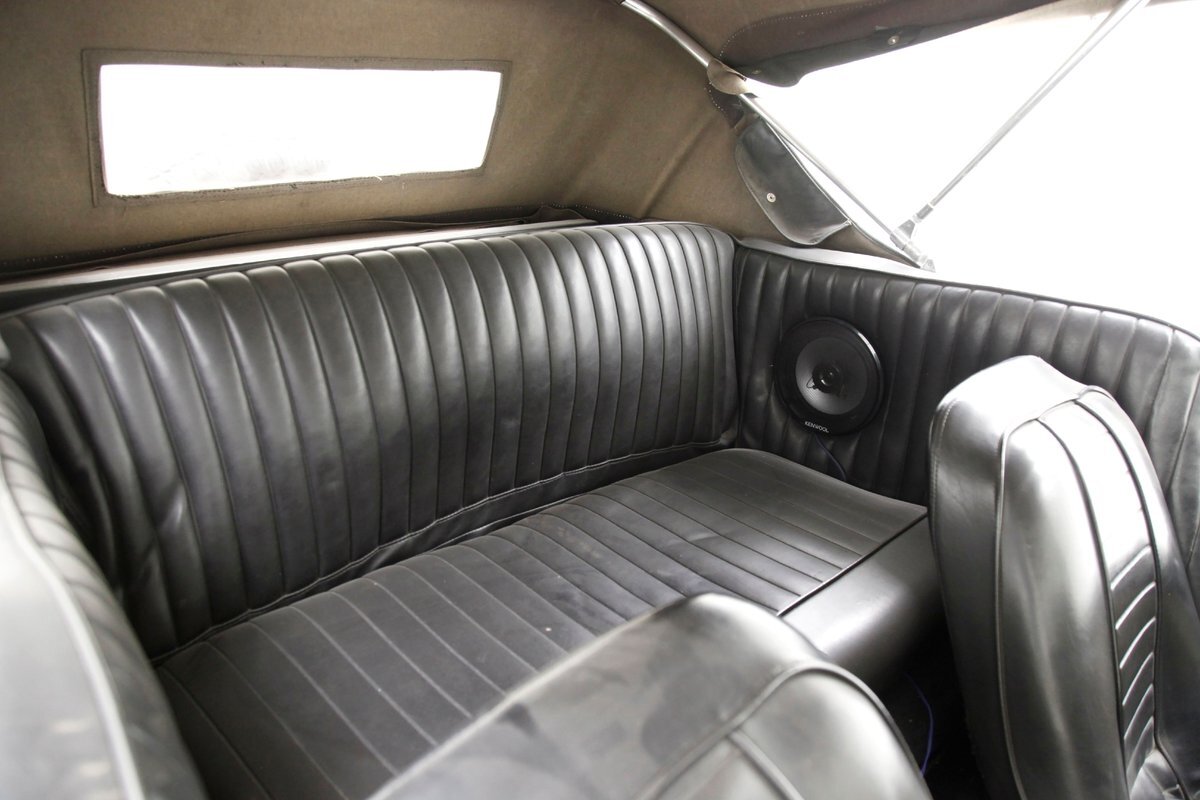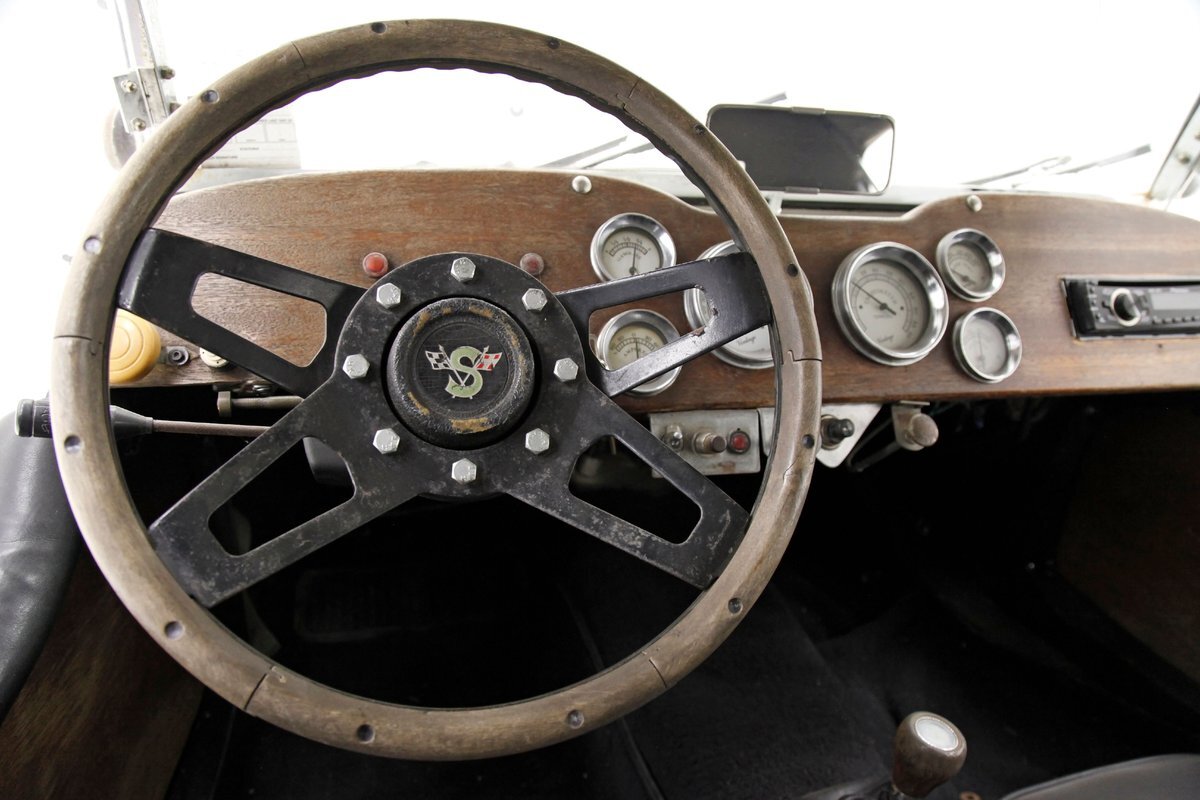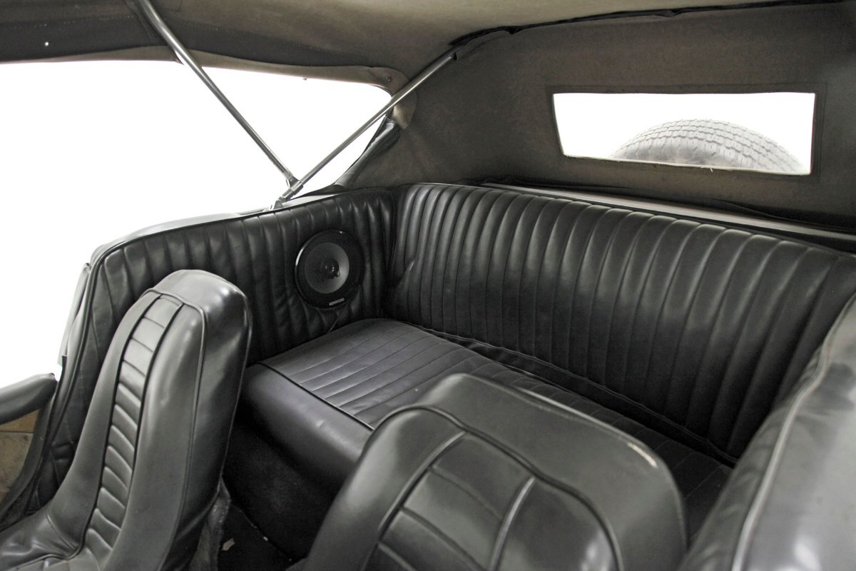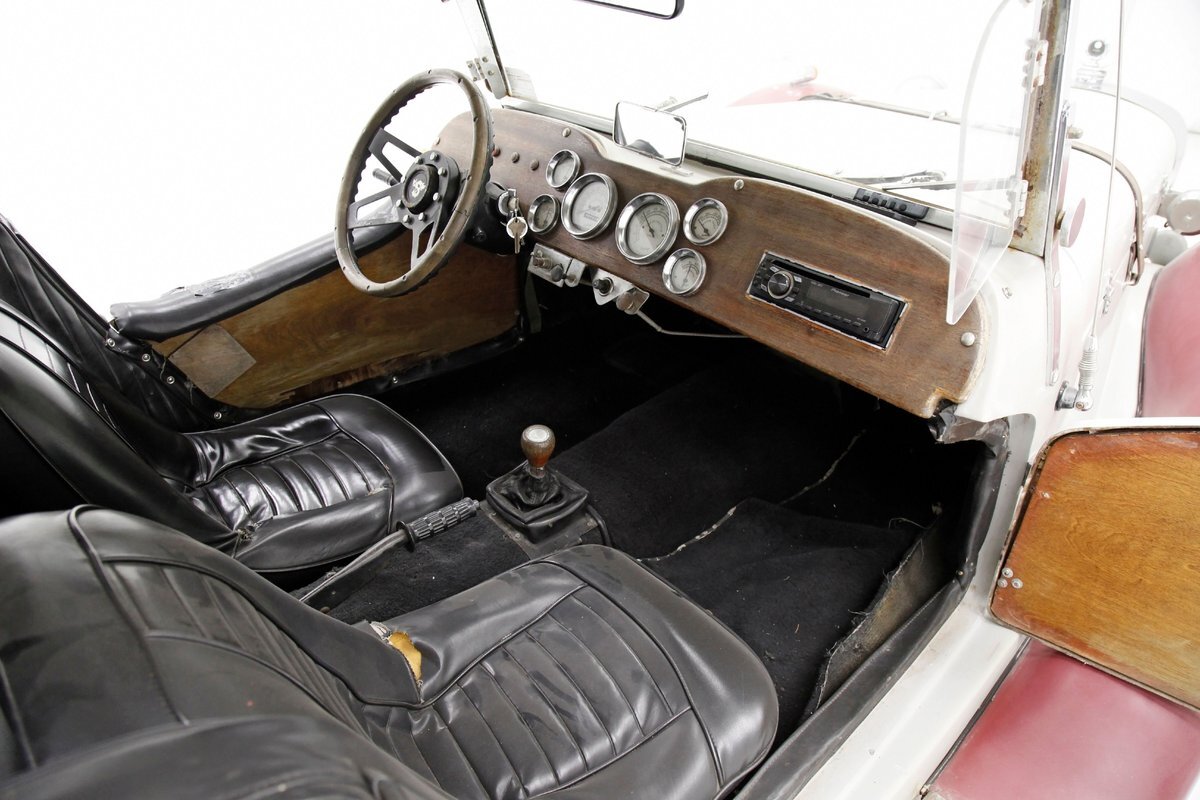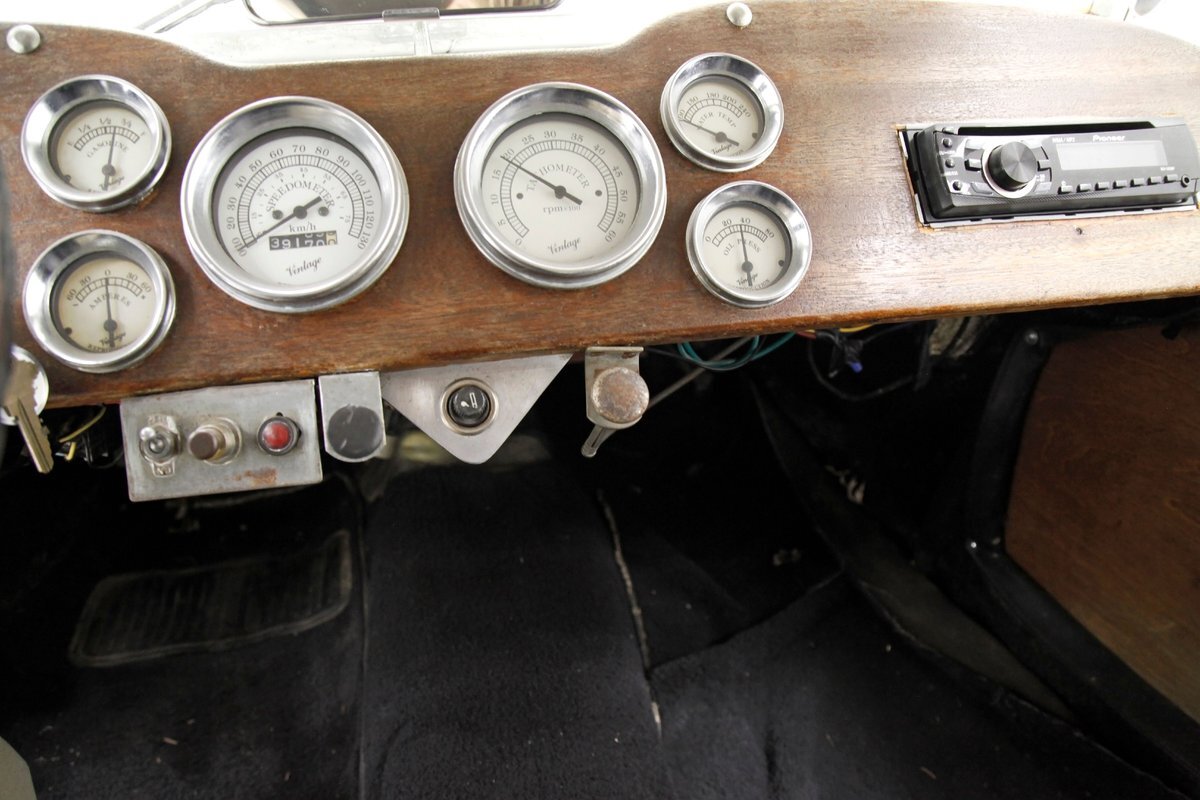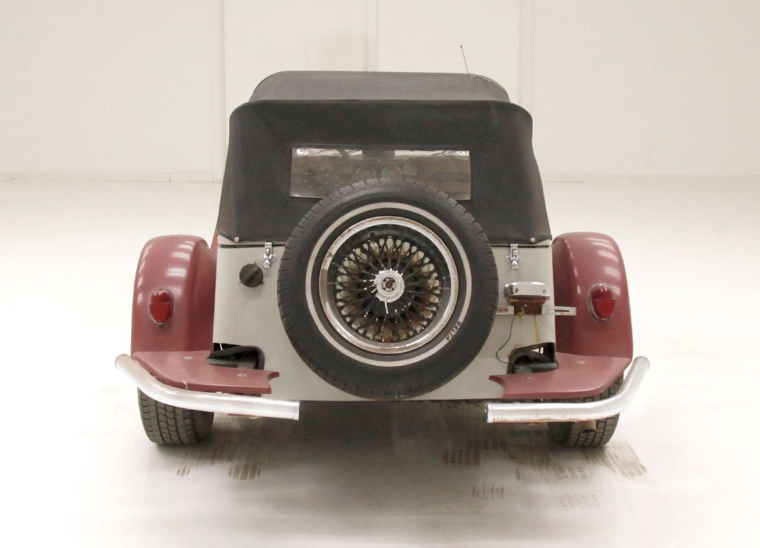 The seats are pure 1980s cool, one-piece black vinyl space age curved buckets that look futuristic, even in the vintage-looking Gazelle bodywork. They have a few tears and cracks in the vinyl. There's a matching rear seat that's probably best reserved for children or your briefcase. A luxurious wood-rimmed wheel gives it an appropriate upscale feel. The custom-made wooden dashboard carries white-faced gauges that proudly spell out that they are "Vintage Reproduction" and there's an AM/FM/CD stereo over there on the passenger's side. Weather protection consists of very 1929-esque folding canvas top, but they actually give the car a very trim appearance and seal up better than a lot of cars of the target era. There's a narrow trunk out back looking the part of the late 20's.