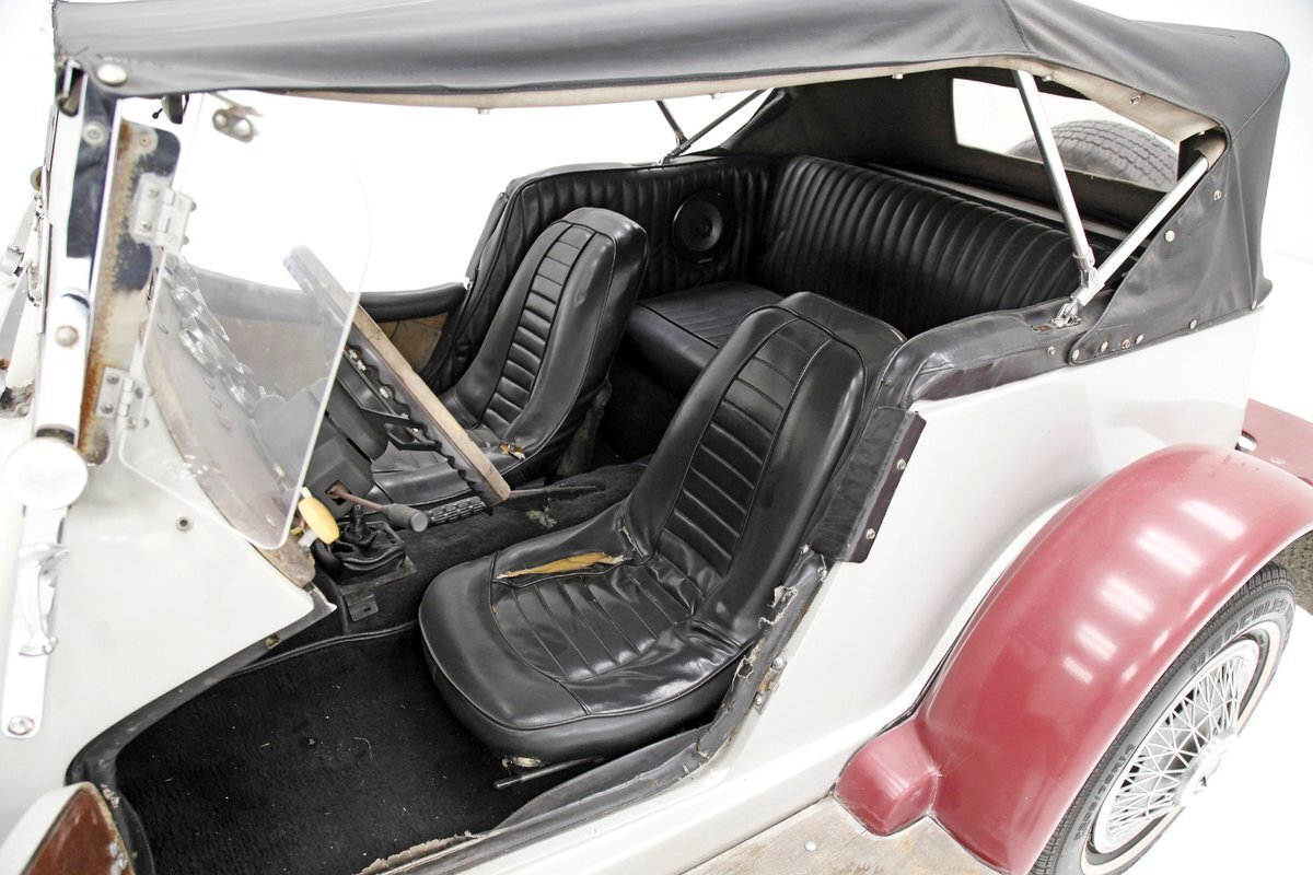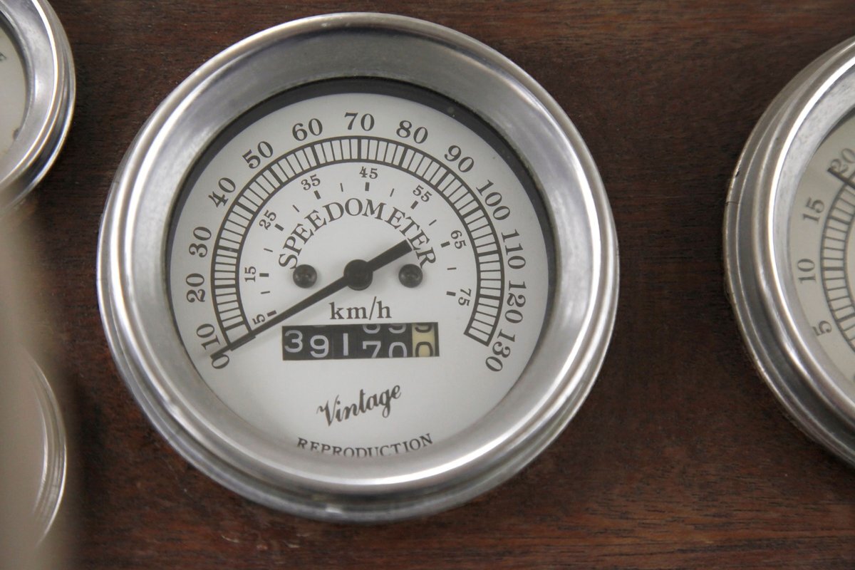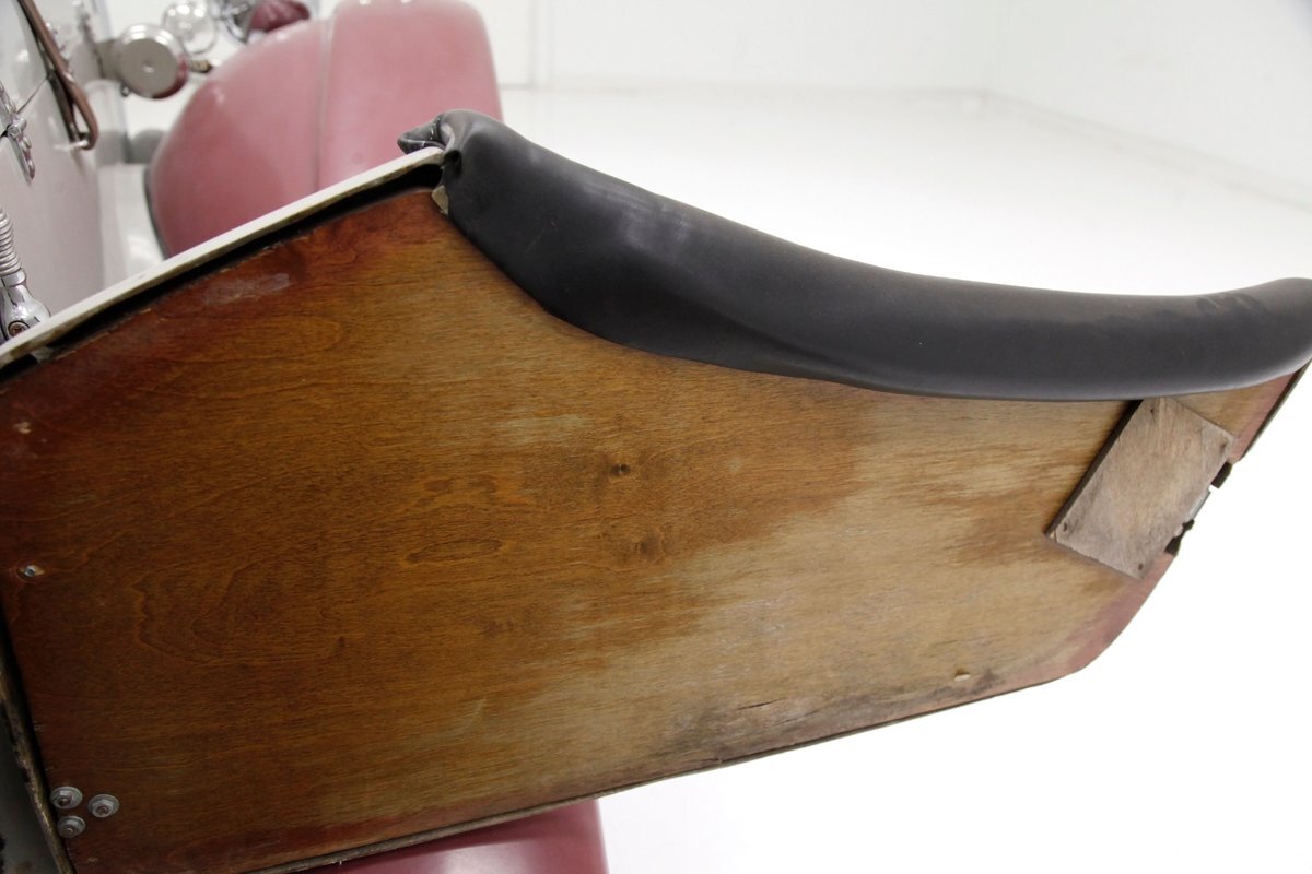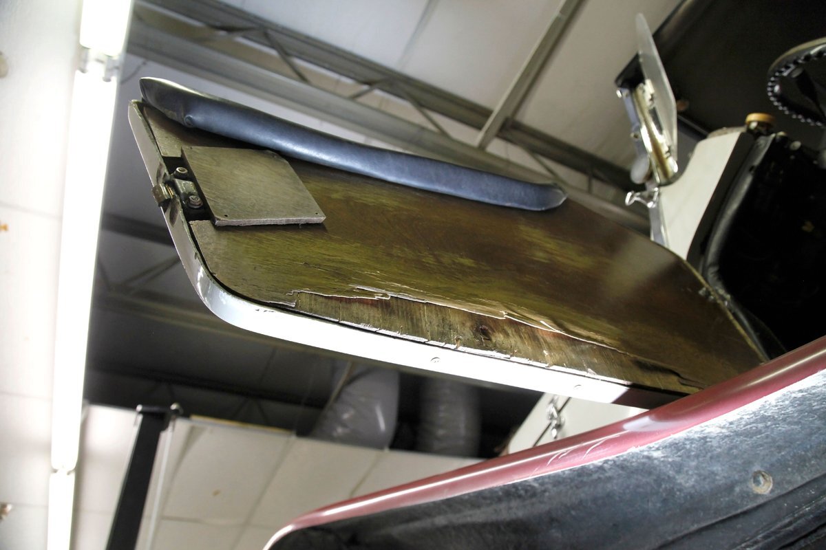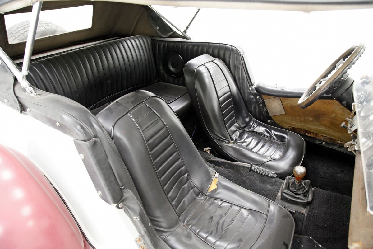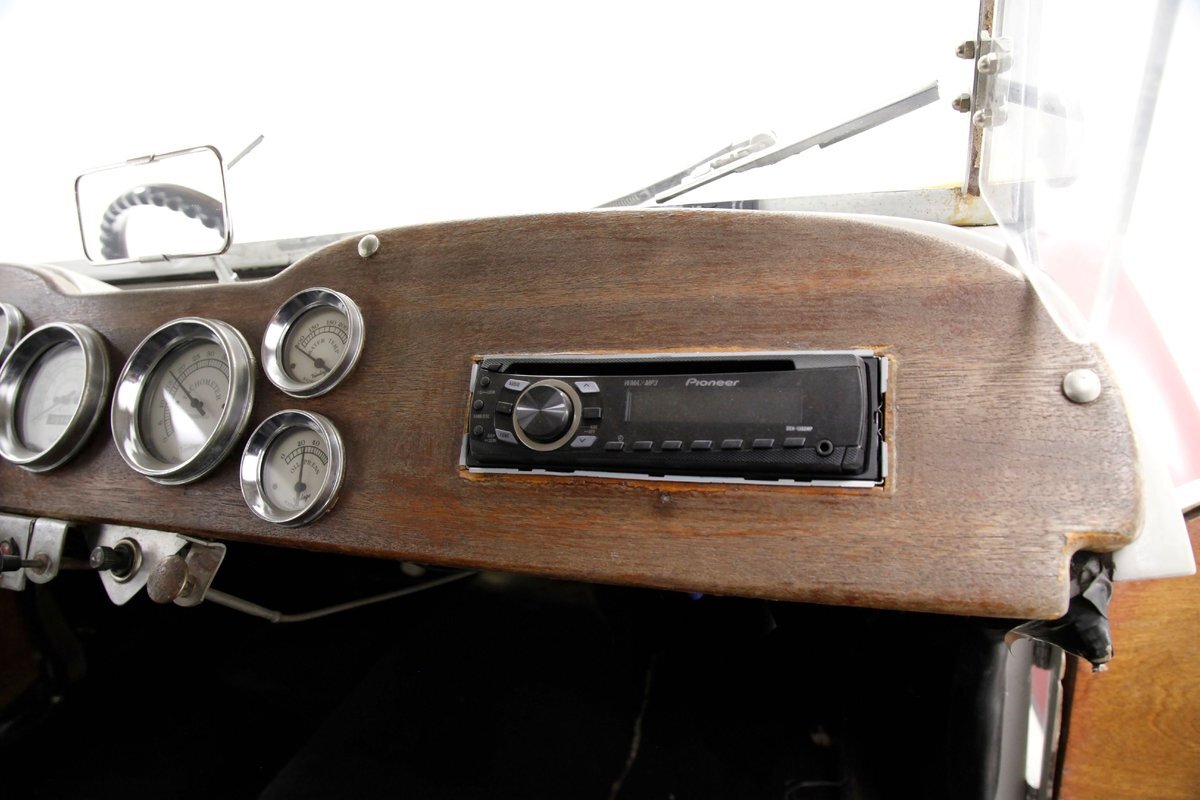 The seats are pure 1980s cool, one-piece black vinyl space age curved buckets that look futuristic, even in the vintage-looking Gazelle bodywork. They have a few tears and cracks in the vinyl. There's a matching rear seat that's probably best reserved for children or your briefcase. A luxurious wood-rimmed wheel gives it an appropriate upscale feel. The custom-made wooden dashboard carries white-faced gauges that proudly spell out that they are "Vintage Reproduction" and there's an AM/FM/CD stereo over there on the passenger's side. Weather protection consists of very 1929-esque folding canvas top, but they actually give the car a very trim appearance and seal up better than a lot of cars of the target era. There's a narrow trunk out back looking the part of the late 20's.