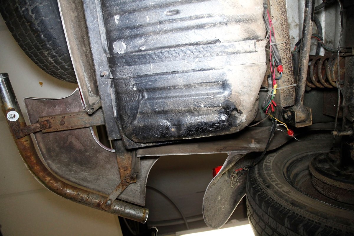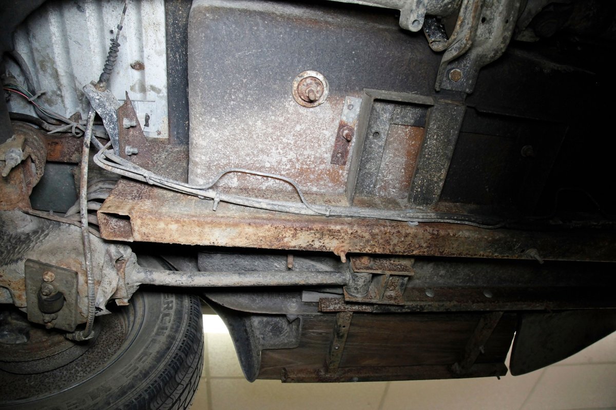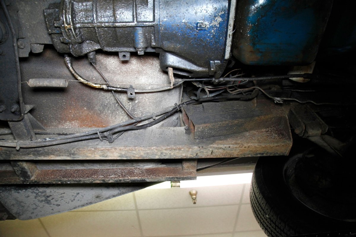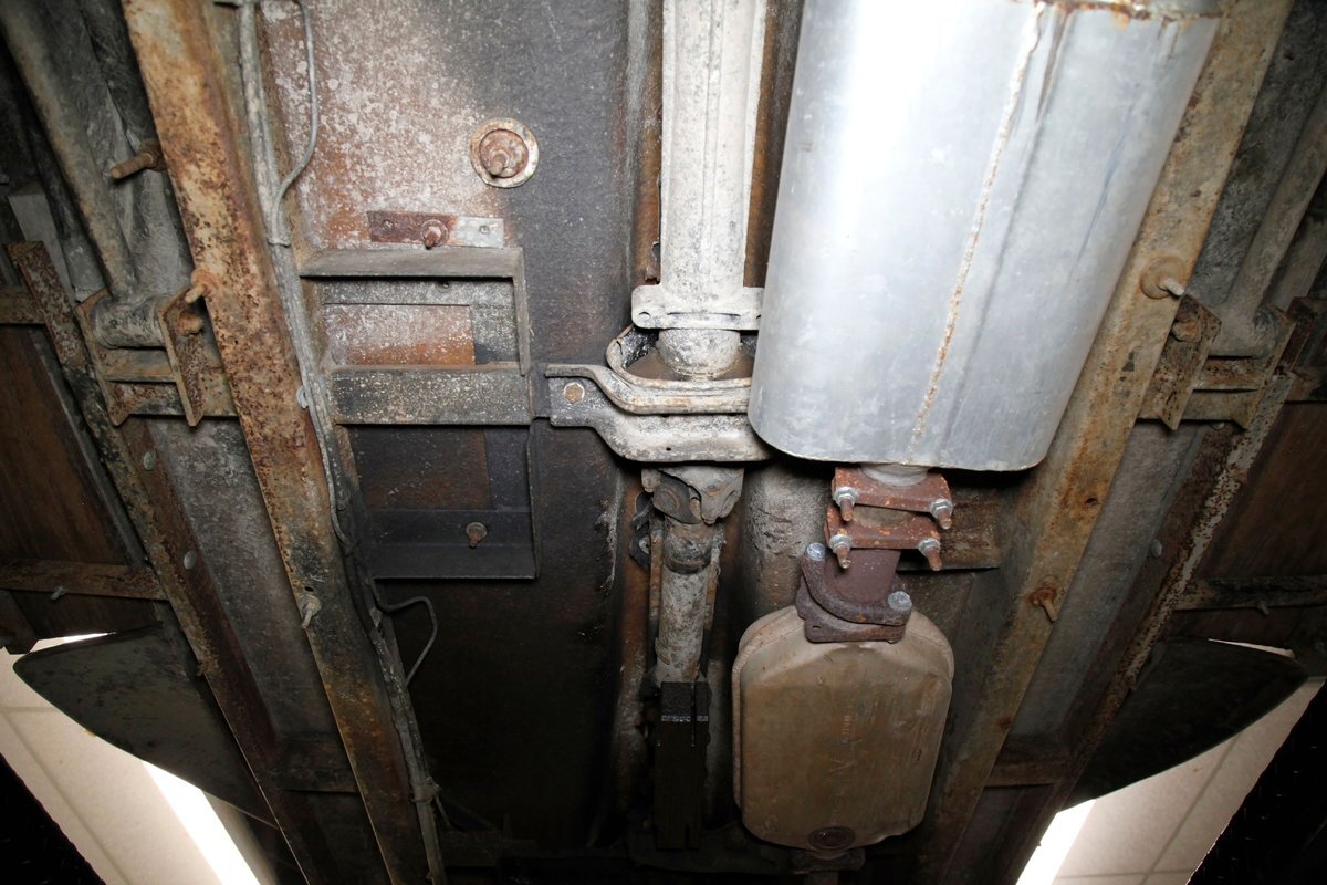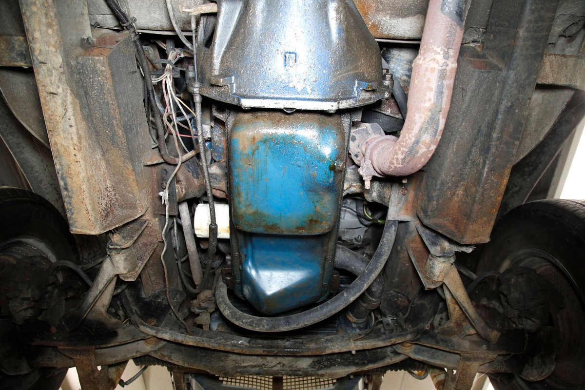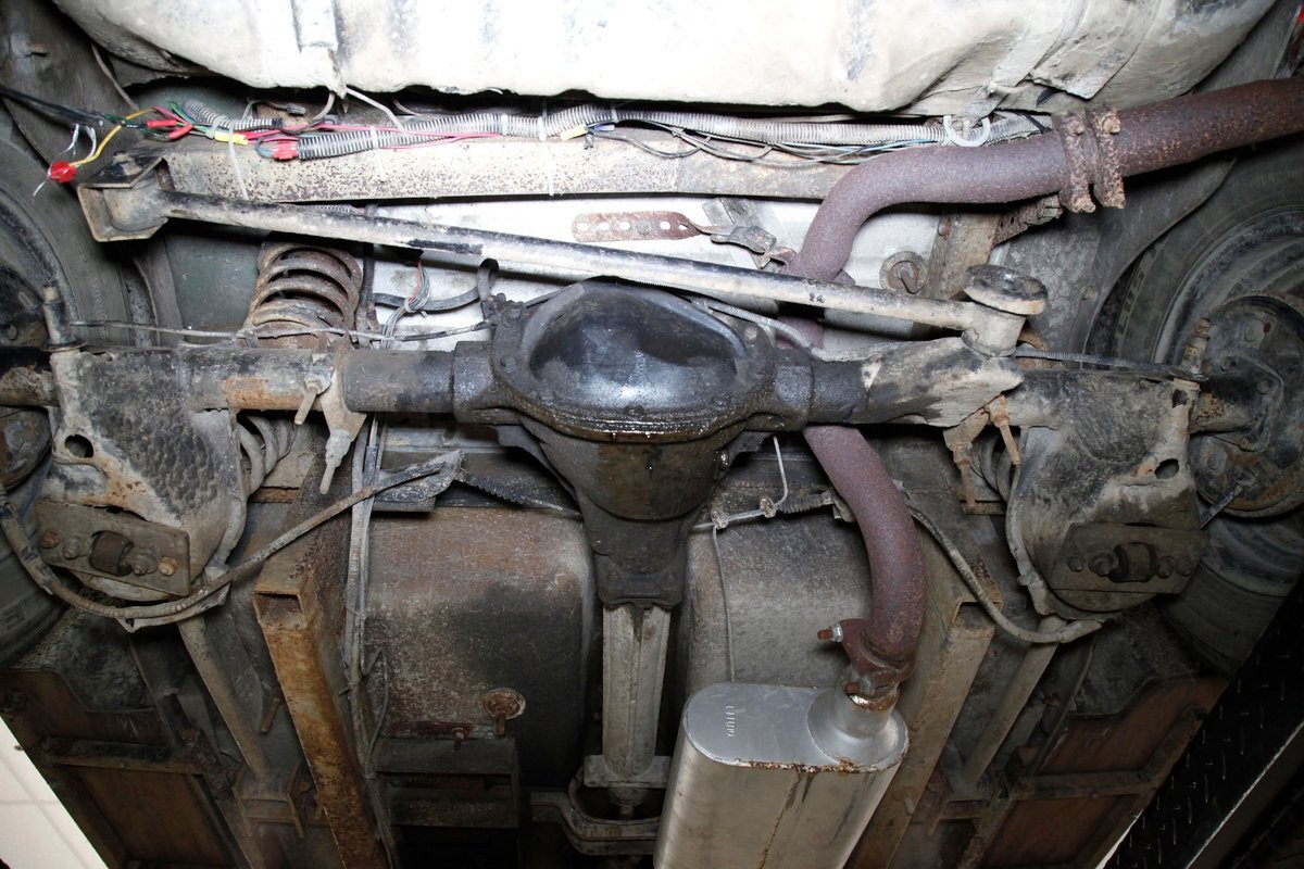 Up on our lift we see over-sprayed black fiberglass tubs and fender wells, a surface rusted square tube stock frame all mounted up and in good solid condition. Mustang II provides the front suspension, and leaf springs for the rear. Disc brakes are on the front and drum brakes on the back. Mostly unremarkable for this undercarriage.