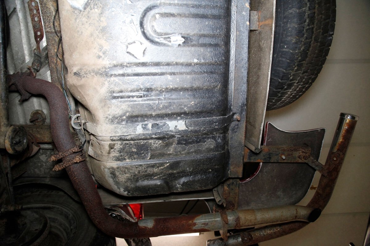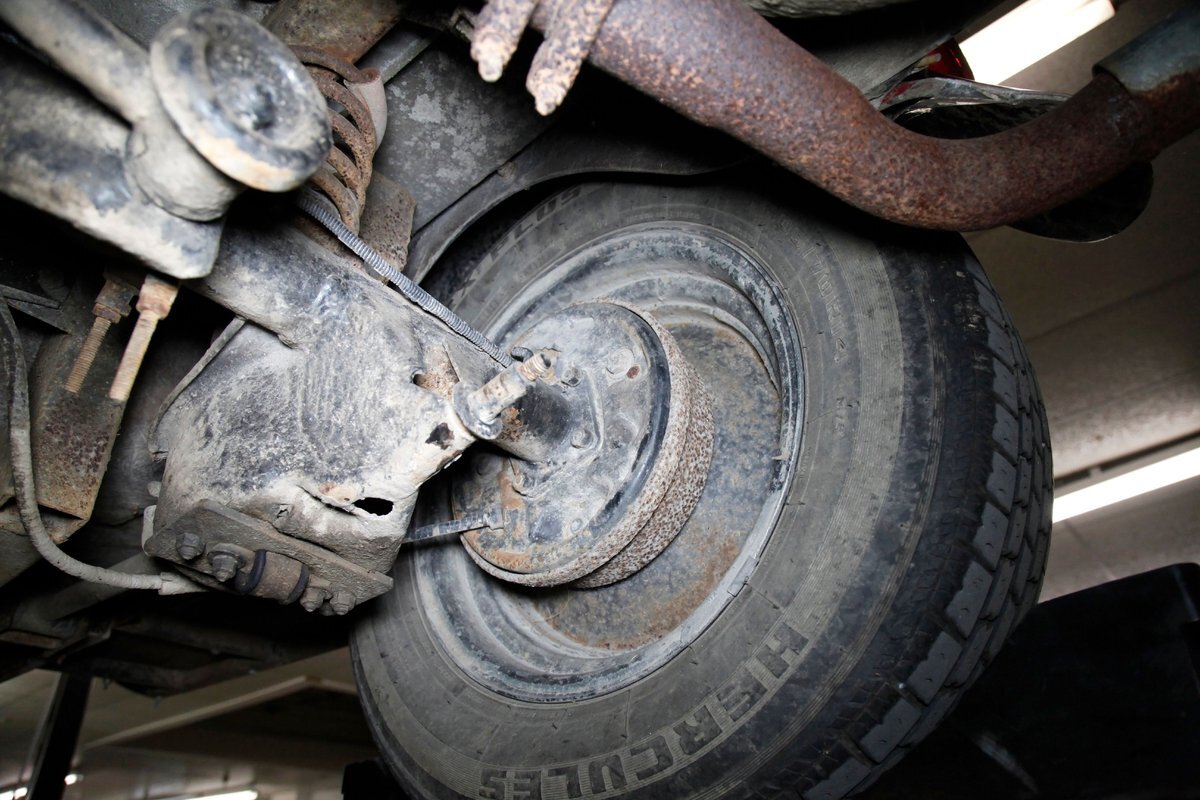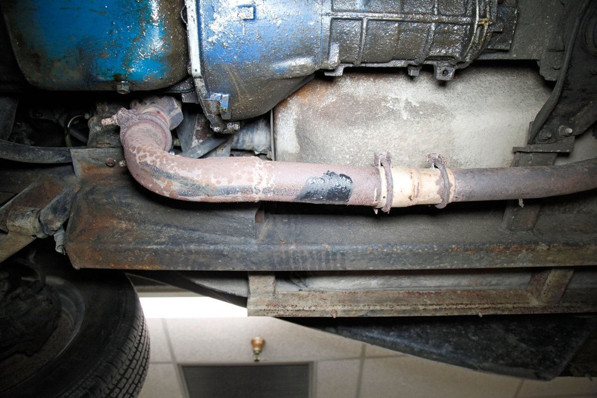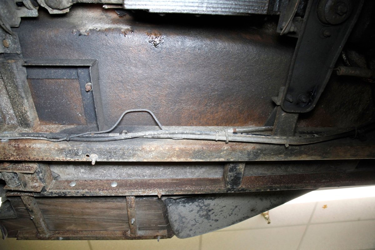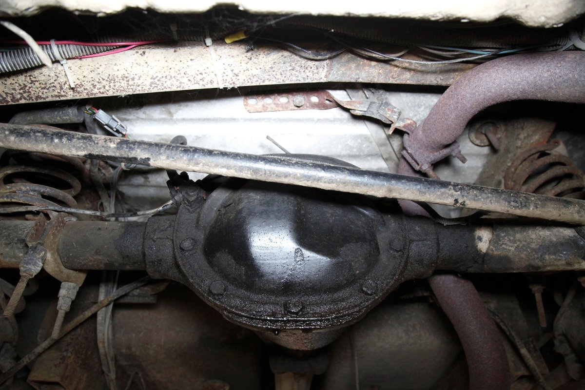 Up on our lift we see over-sprayed black fiberglass tubs and fender wells, a surface rusted square tube stock frame all mounted up and in good solid condition. Mustang II provides the front suspension, and leaf springs for the rear. Disc brakes are on the front and drum brakes on the back. Mostly unremarkable for this undercarriage.