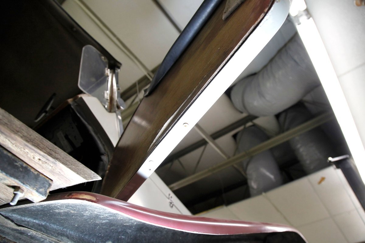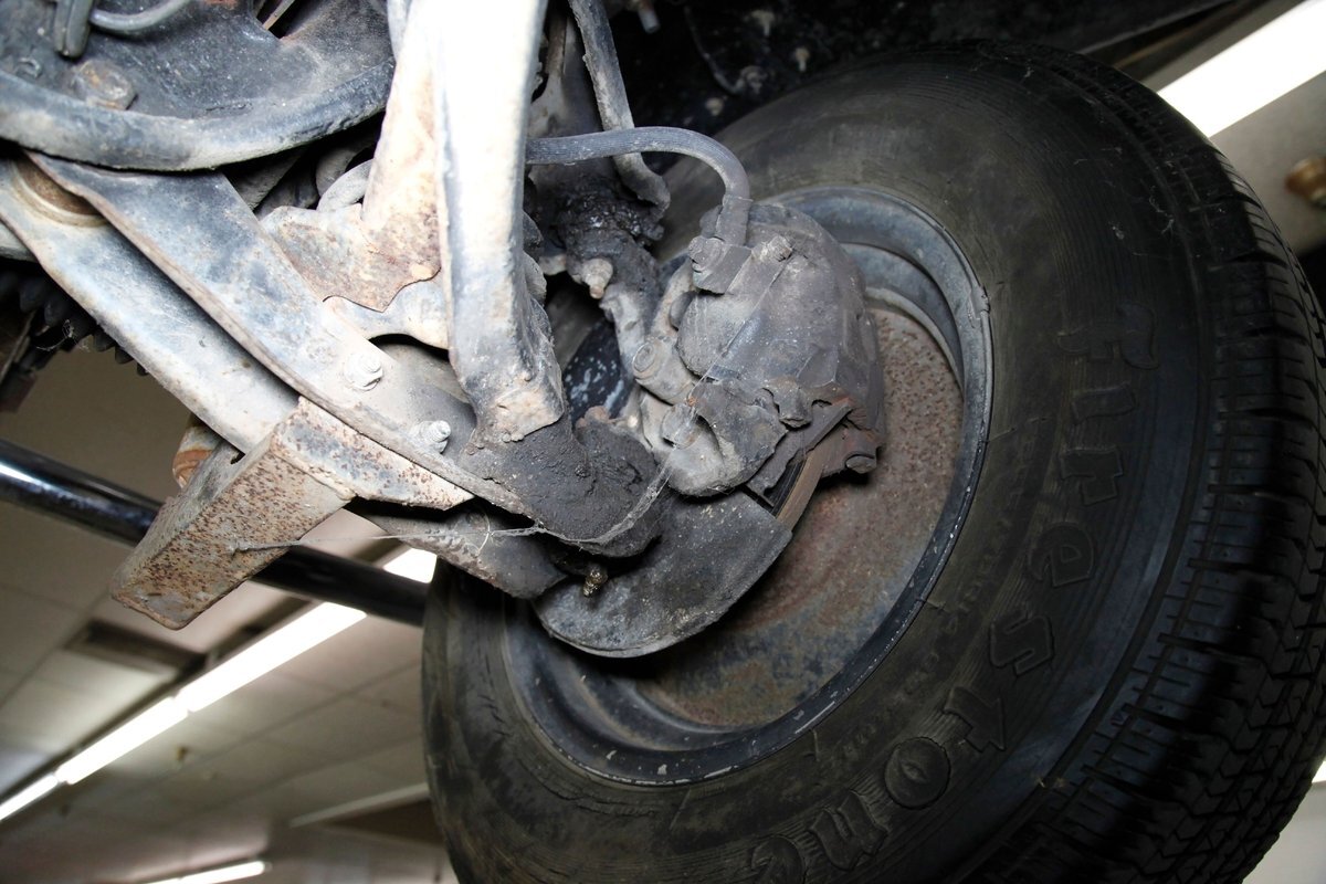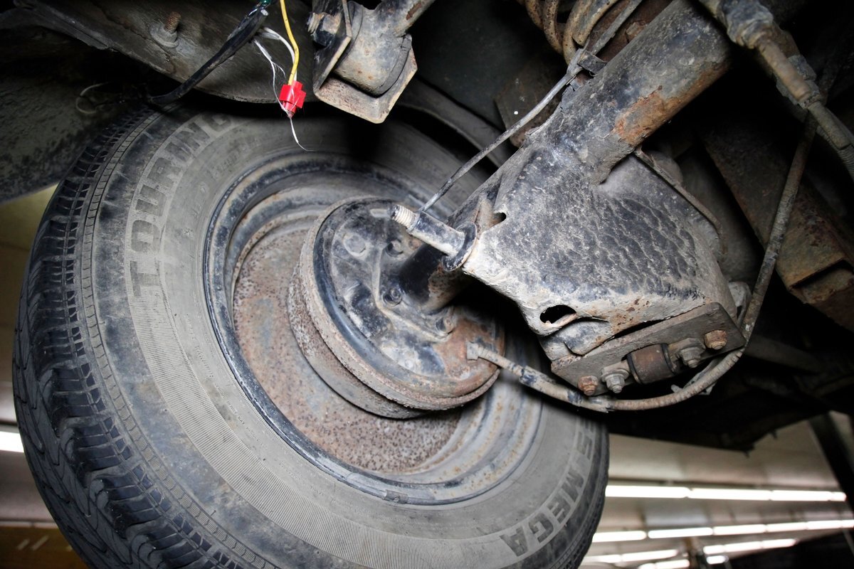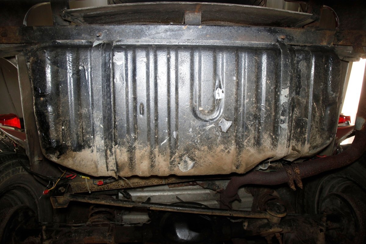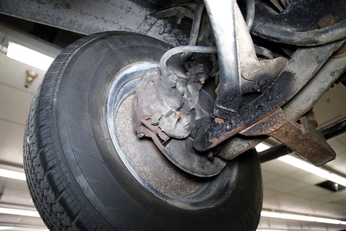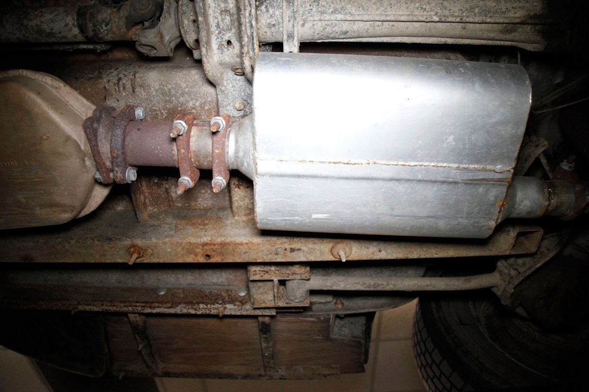 Up on our lift we see over-sprayed black fiberglass tubs and fender wells, a surface rusted square tube stock frame all mounted up and in good solid condition. Mustang II provides the front suspension, and leaf springs for the rear. Disc brakes are on the front and drum brakes on the back. Mostly unremarkable for this undercarriage.