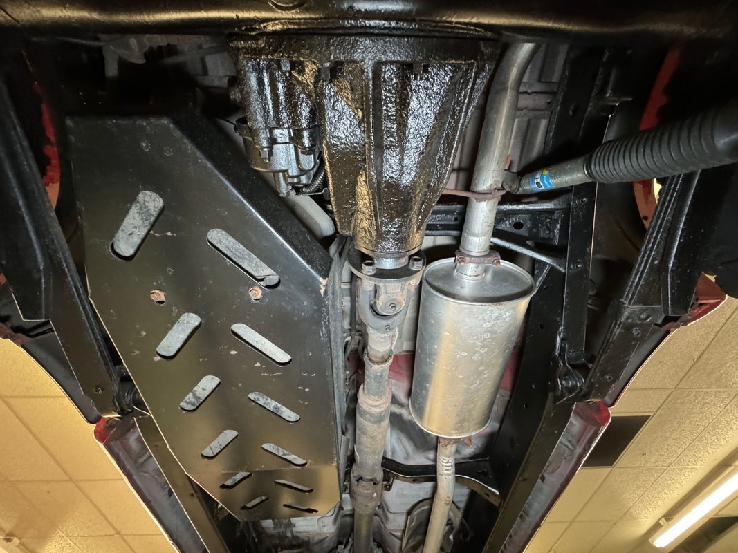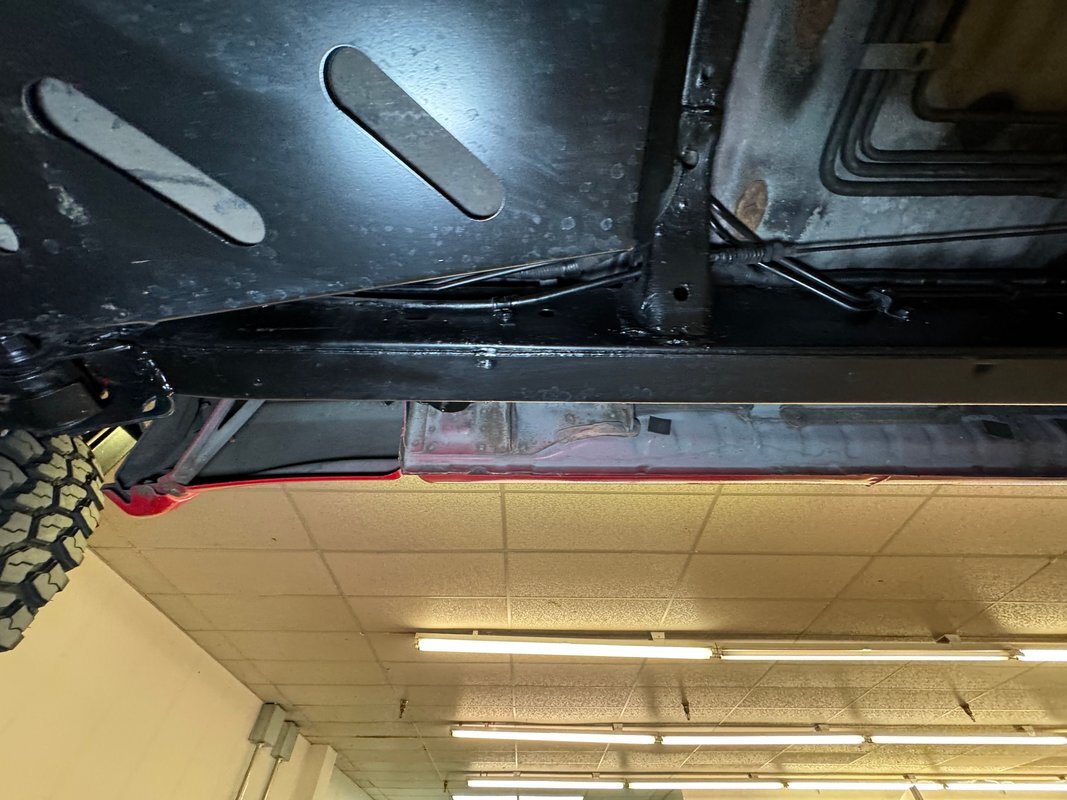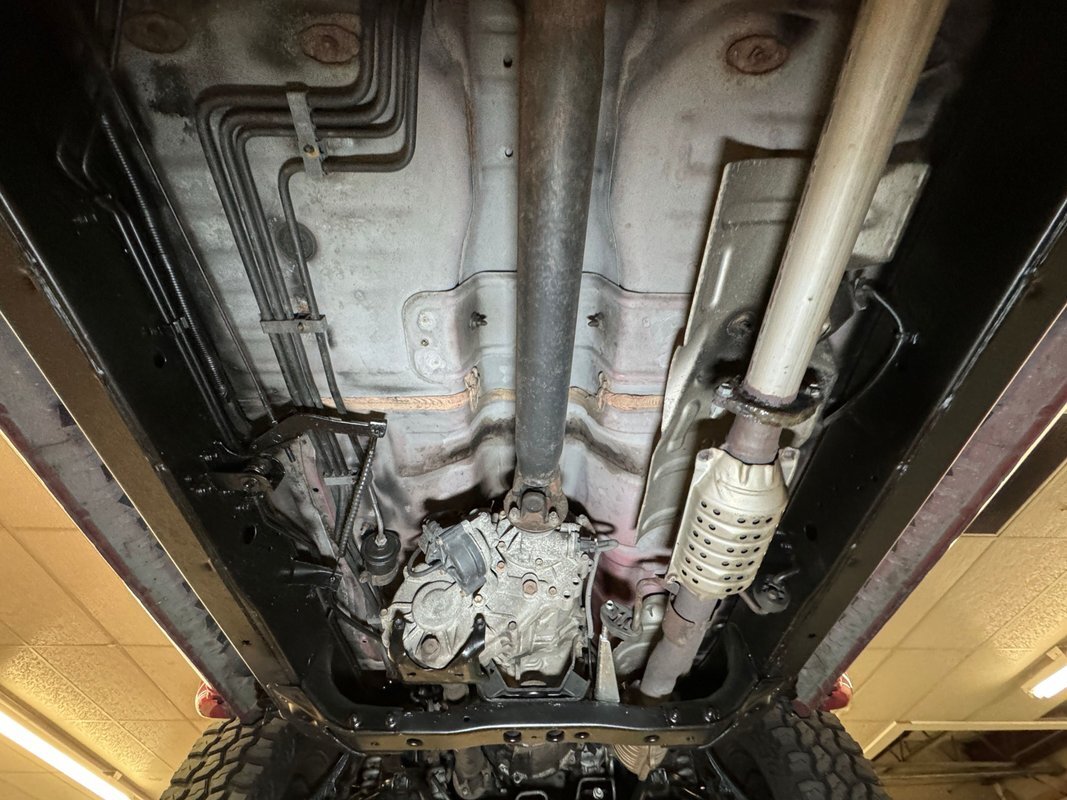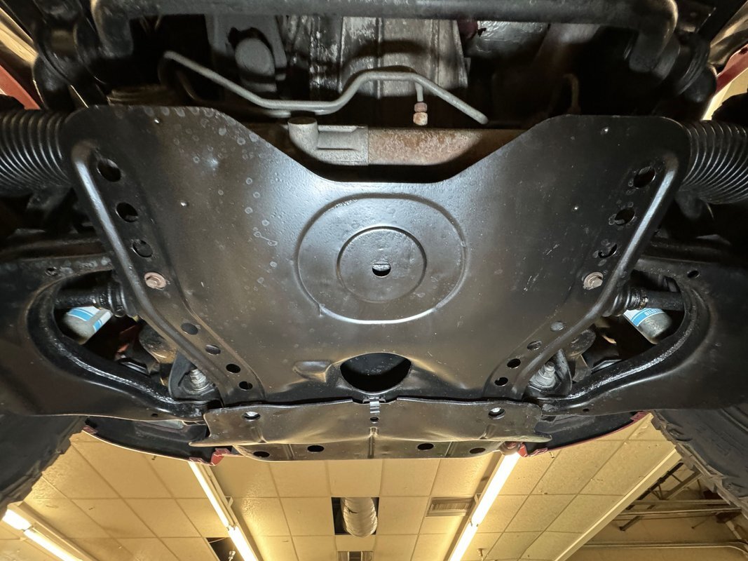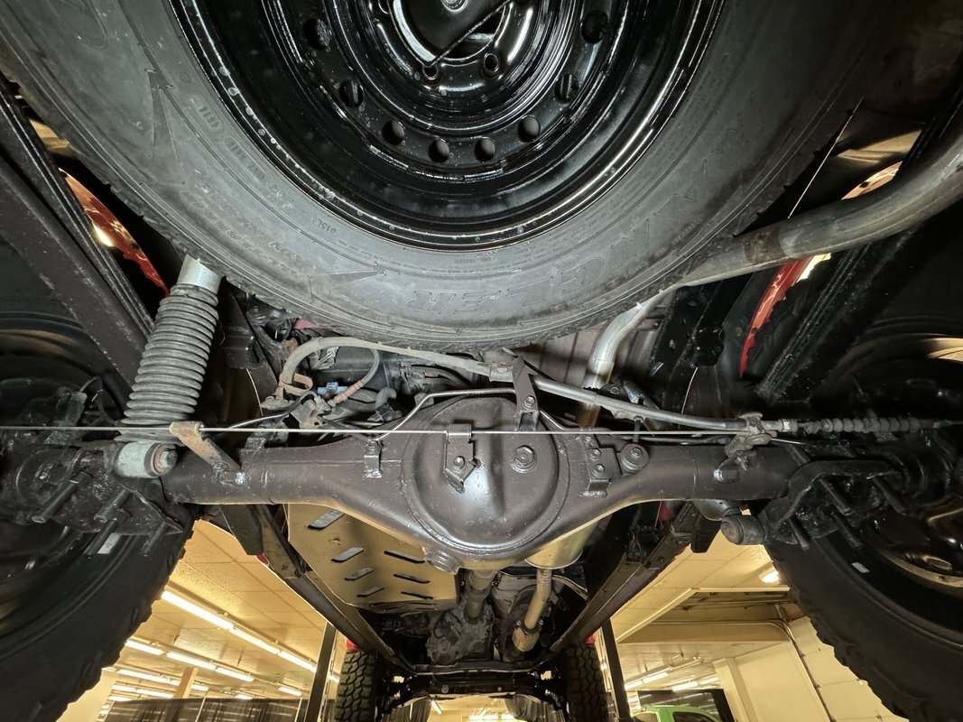 For a truck with such offroad prowess, we're not sure this one has ever seen a trail. Super clean underneath with zero dirt, minimal surface rust, and no grease or leaks. Our consignor says the frame has been sanded and painted so maybe it's dirty days are past it, or ahead of it. Either way, it's clean underneath where a single exhaust finds a stock style muffler before exiting on the right. Double wishbone suspension in front and leaf springs in back move you along the trail with ease.