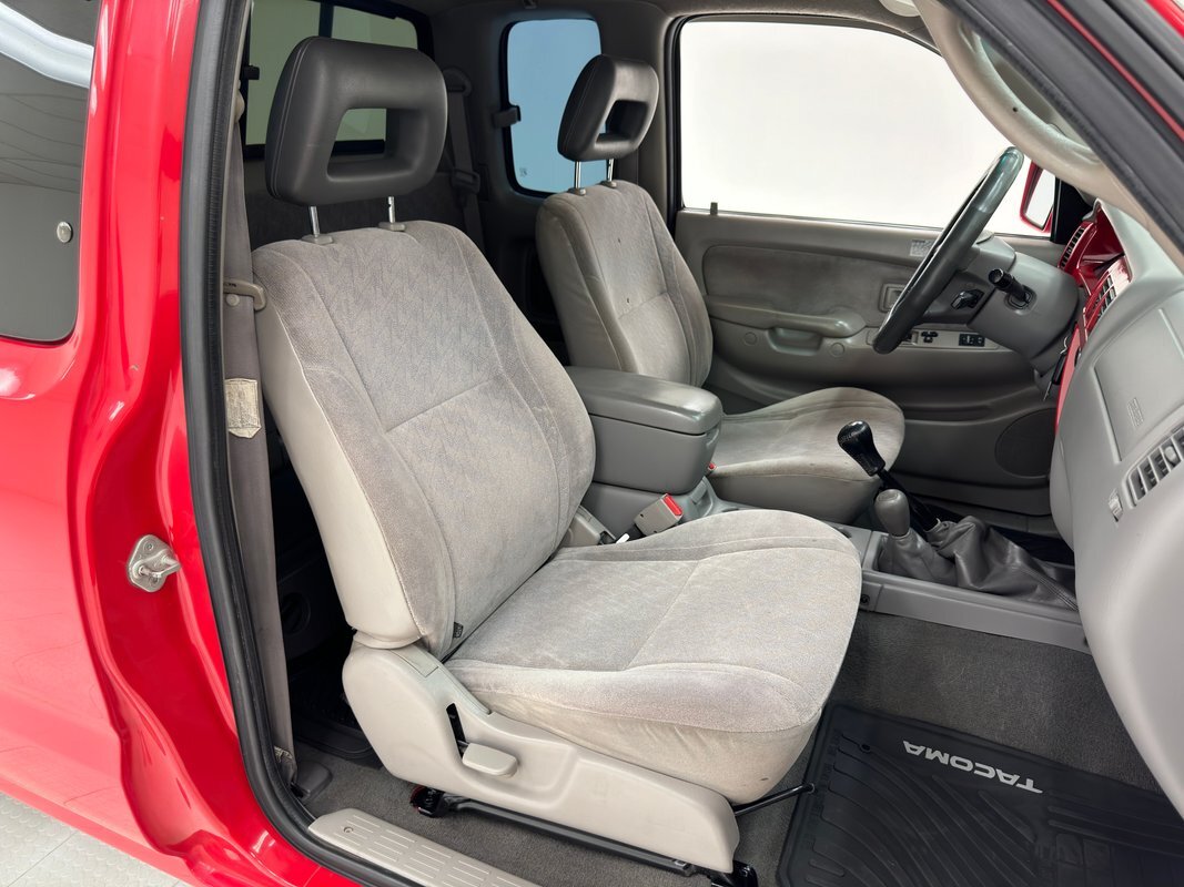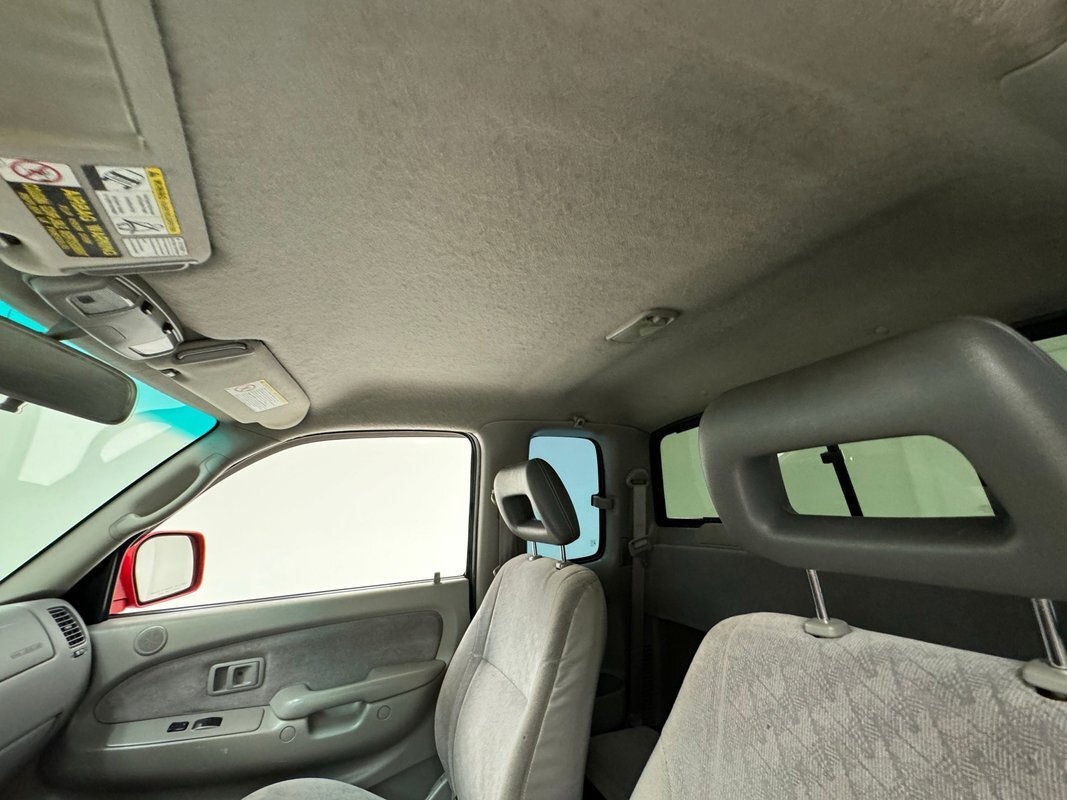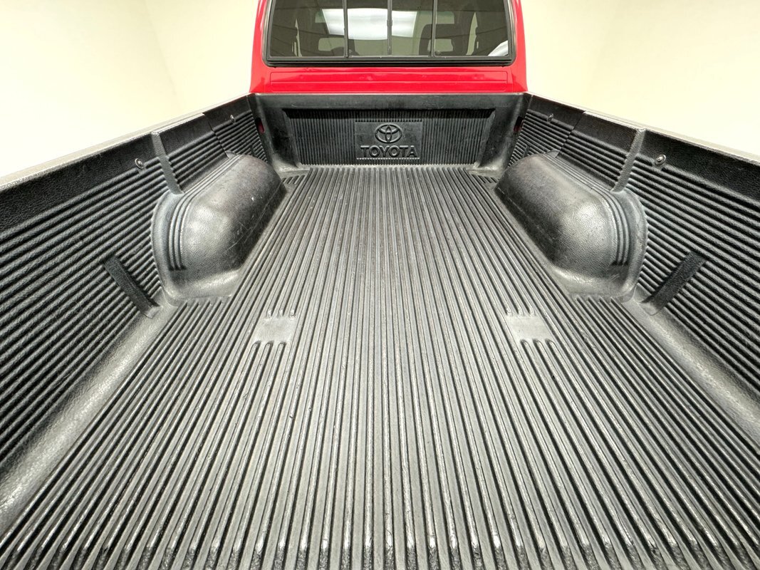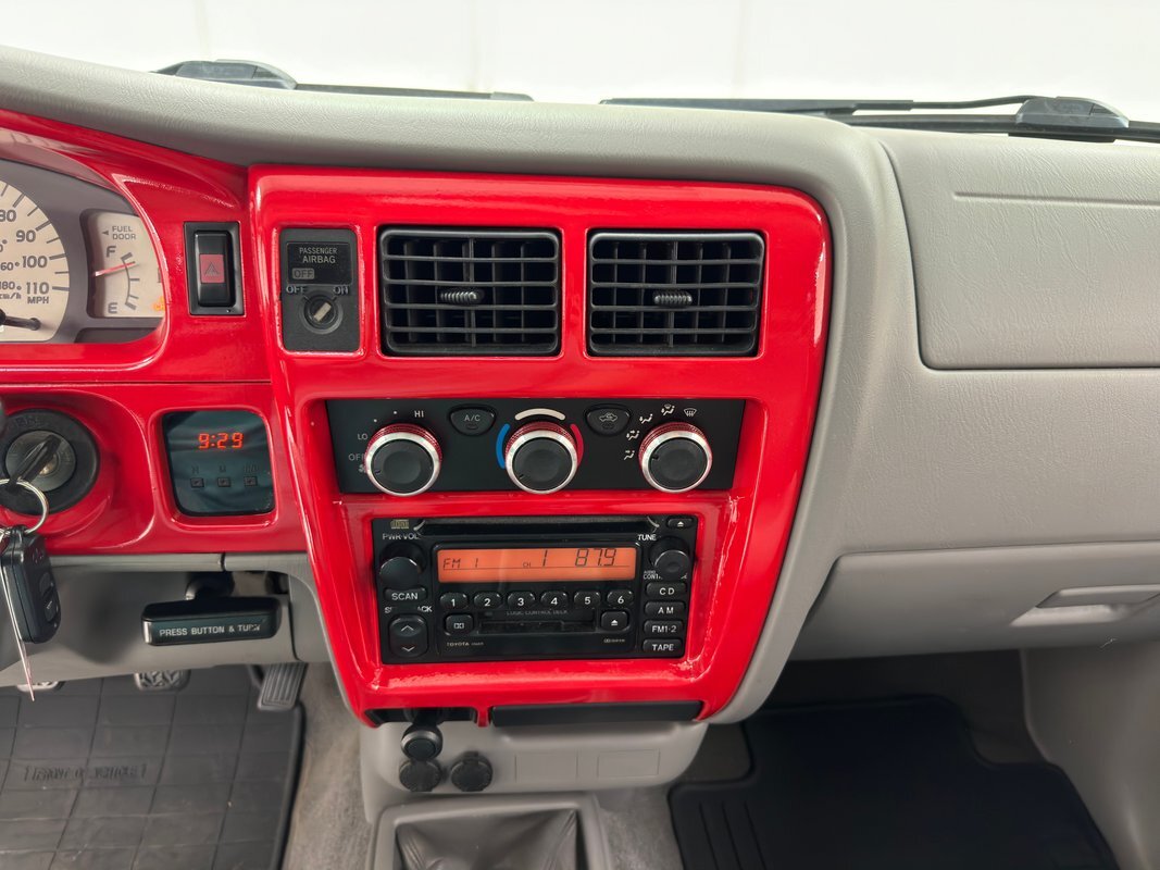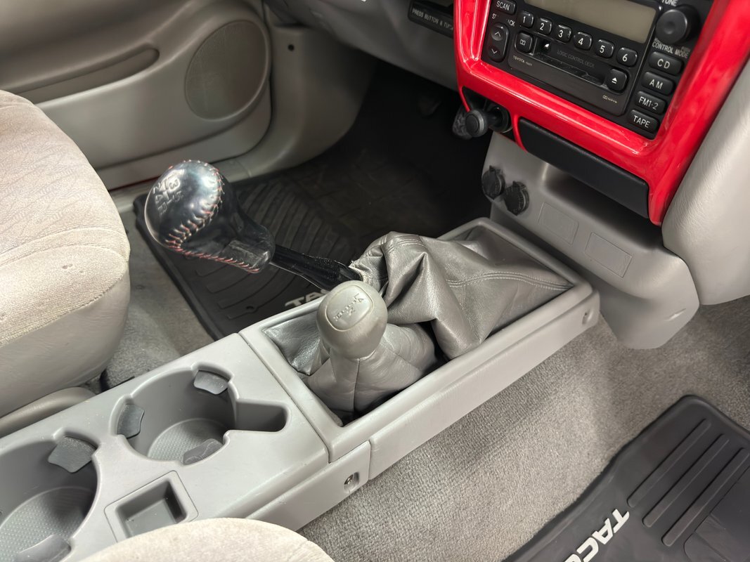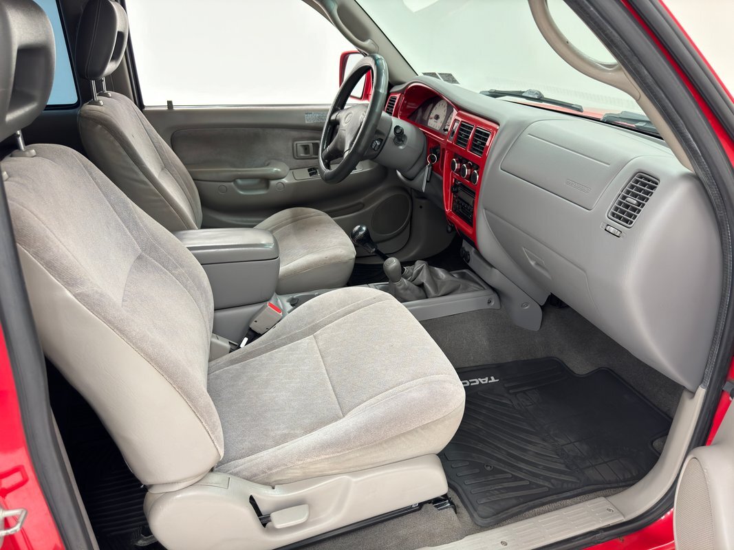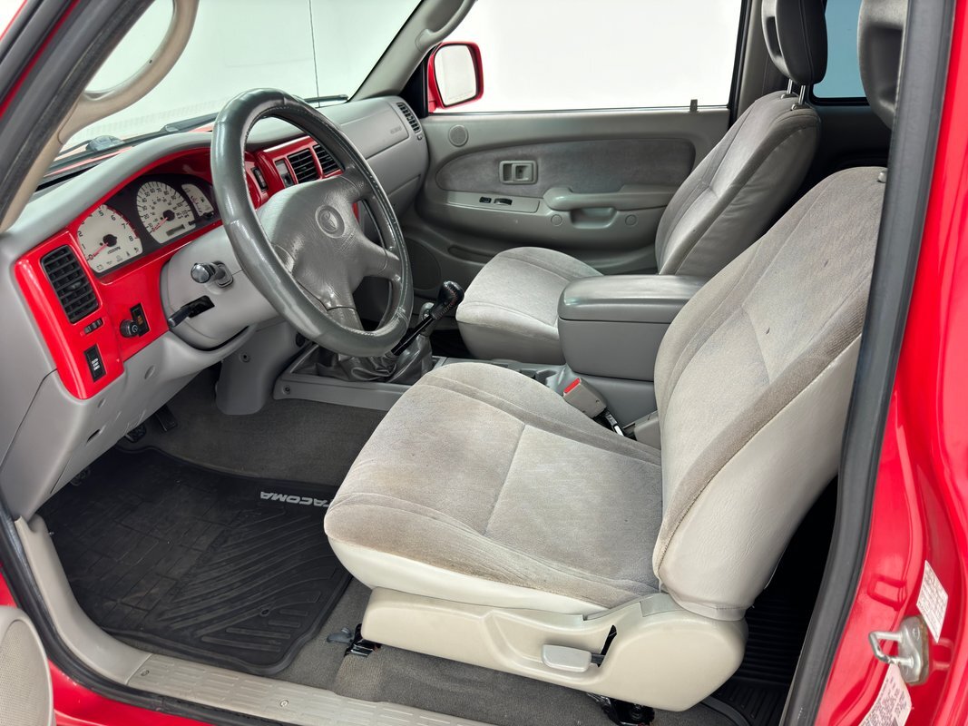 Gray molded plastic door panels with a cloth insert house plastic hardware and buttons, all in great shape with just the slightest of usage patina. The gray cloth bucket seats and their sporty head restraints are in decent shape with some discoloration and compression, particularly on the driver's seat. There's also random stains and a burn mark. In back, a pair of small seats flip up to open up a storage area that includes bins, all in decent shape with some usual usage marks. On the steering wheel, a loose fitting cover surrounds the rim while the dashboard has been treated to the red paint of the exterior and looks clean as it houses the white faced gauge cluster in the sightline of the driver. In the center, the A/C controls and an AM/FM/CD radio add black to the red surround and gray is resumed in front of the passenger. In the center console the shifter cants to the driver while the smaller range selector resides just adjacent, all in front of the requisite cupholders built into the molded plastic. Low pile gray carpet is protected by Tacoma rubber mats and the headliner is showing a bit of age but is fully intact and clean.