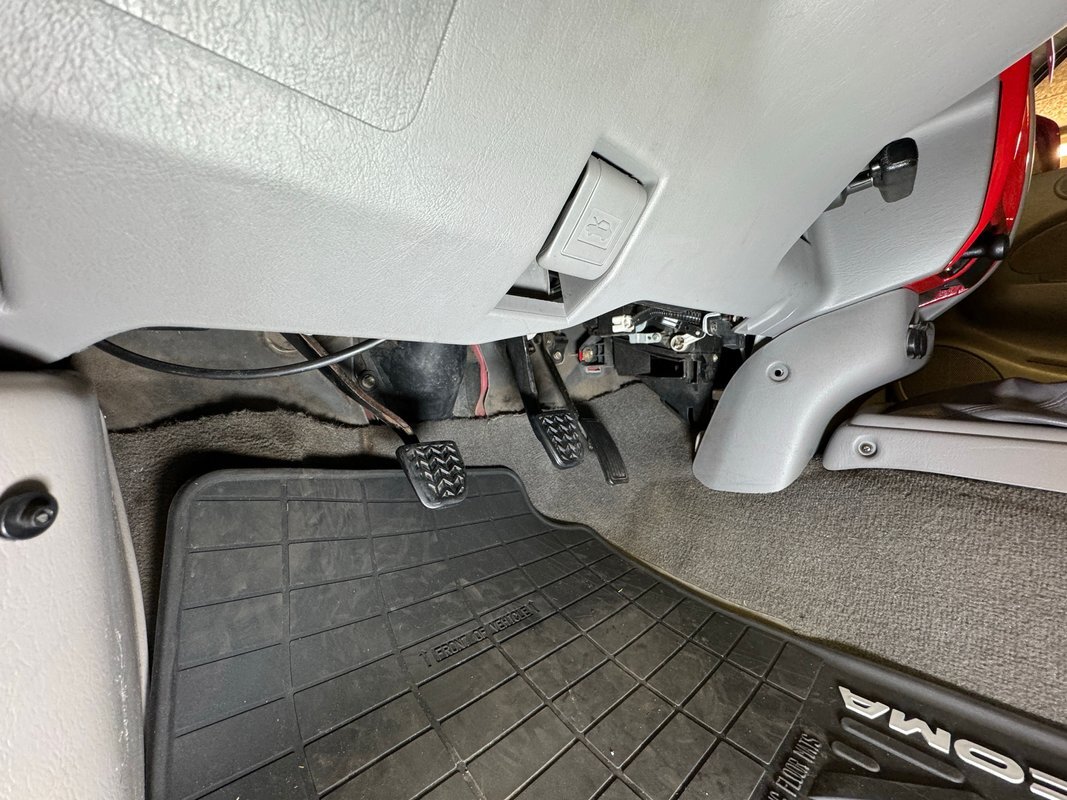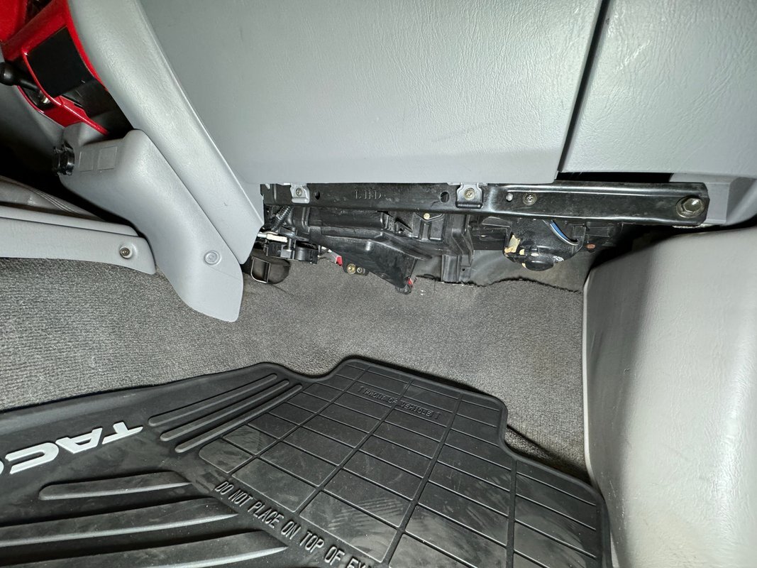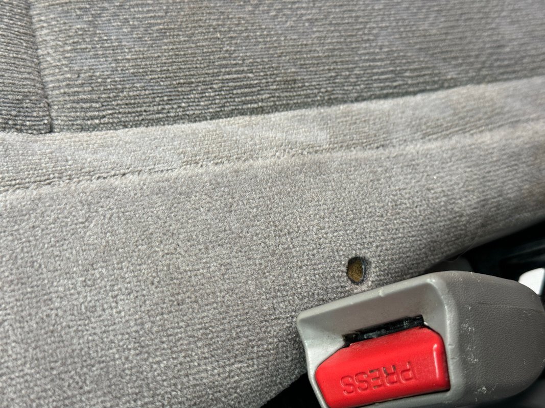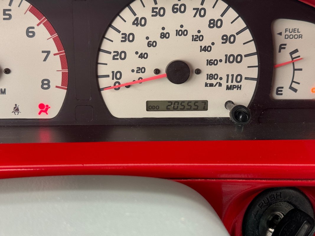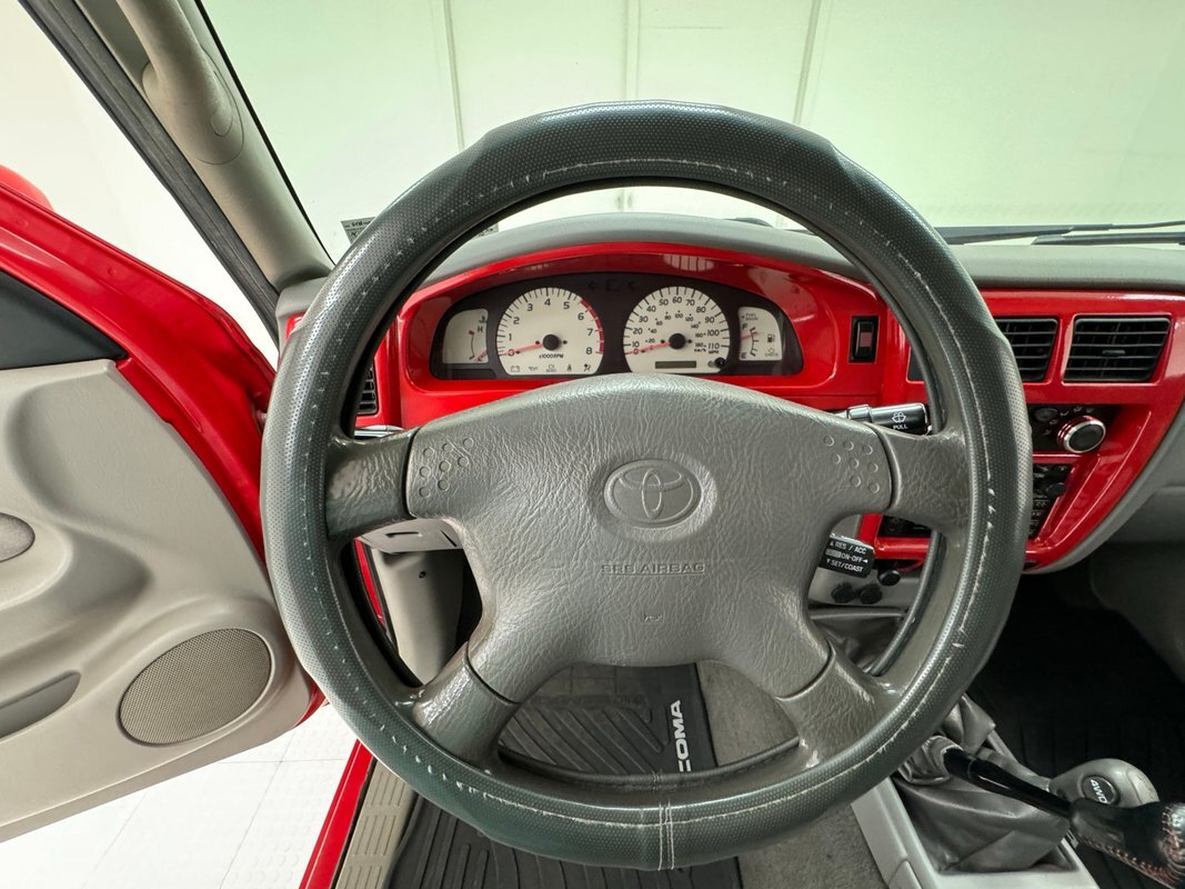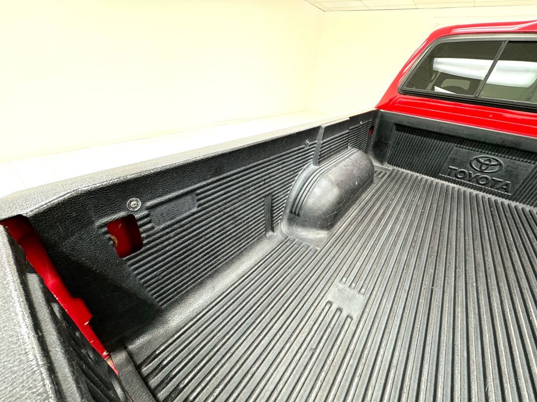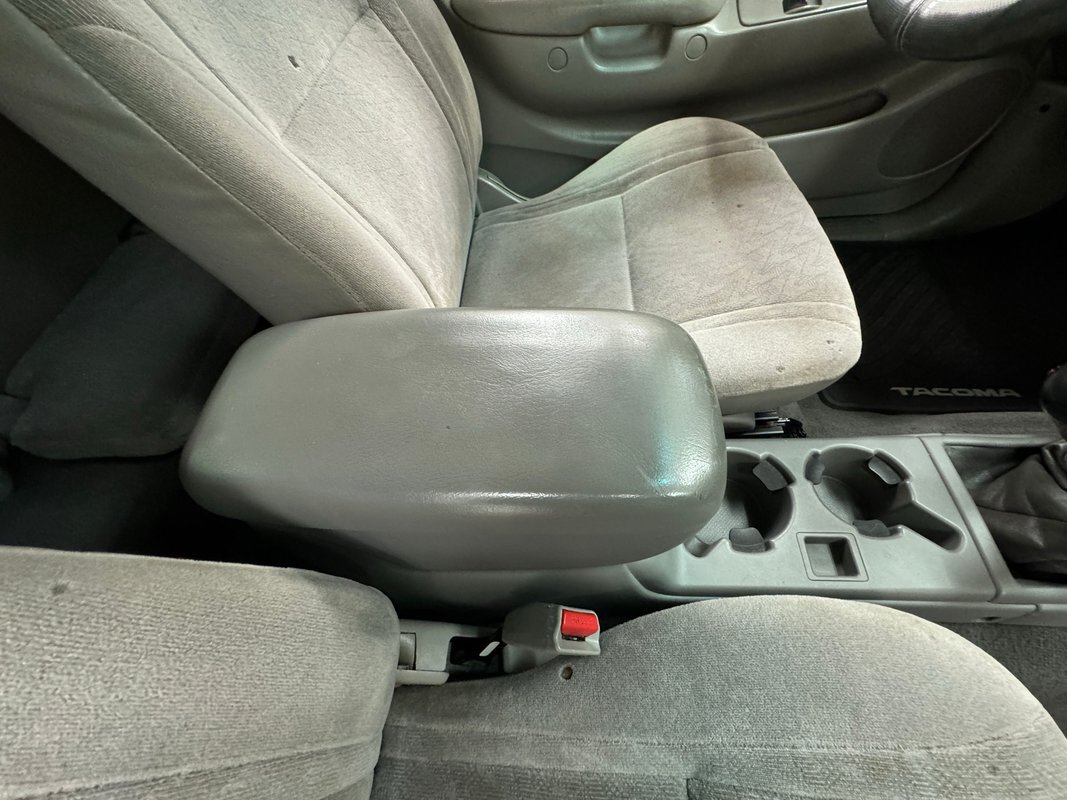 Gray molded plastic door panels with a cloth insert house plastic hardware and buttons, all in great shape with just the slightest of usage patina. The gray cloth bucket seats and their sporty head restraints are in decent shape with some discoloration and compression, particularly on the driver's seat. There's also random stains and a burn mark. In back, a pair of small seats flip up to open up a storage area that includes bins, all in decent shape with some usual usage marks. On the steering wheel, a loose fitting cover surrounds the rim while the dashboard has been treated to the red paint of the exterior and looks clean as it houses the white faced gauge cluster in the sightline of the driver. In the center, the A/C controls and an AM/FM/CD radio add black to the red surround and gray is resumed in front of the passenger. In the center console the shifter cants to the driver while the smaller range selector resides just adjacent, all in front of the requisite cupholders built into the molded plastic. Low pile gray carpet is protected by Tacoma rubber mats and the headliner is showing a bit of age but is fully intact and clean.