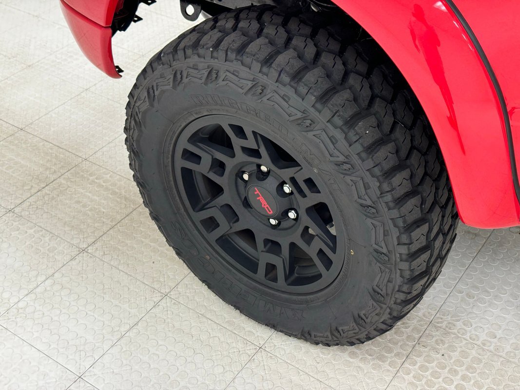 Radiant Red is an appropriate name for the bright hue that emanates from this midsize truck on stilts, and it covers the grille surround and bumper cover in front while a smoked bug guard contours to the hoodline. It was repainted once with the original color. TRD is expressed nine times on the exterior assuring that this won't be confused with your run of the mill Tacoma, but the combo of the wheels, paint and lift do some talking as well. A sliding window is in back of the cab overlooking the bed which is clean and protected by a bed cover. Door handles, mirrors, fender flares, and bumpers all take on the monochromatic red paint which makes black features such as the 17-inch TRD wheels and tinted quarter windows absolutely make this truck pop. Rain guards have been added to the windows and the rear bumper is topped with a black, textured cover that allows for step up. The 265/70R17 tires have a late 2021 date code. For the age of the truck, the exterior is in stupendous shape, and we could not find any glaring imperfections on this pampered 4x4.