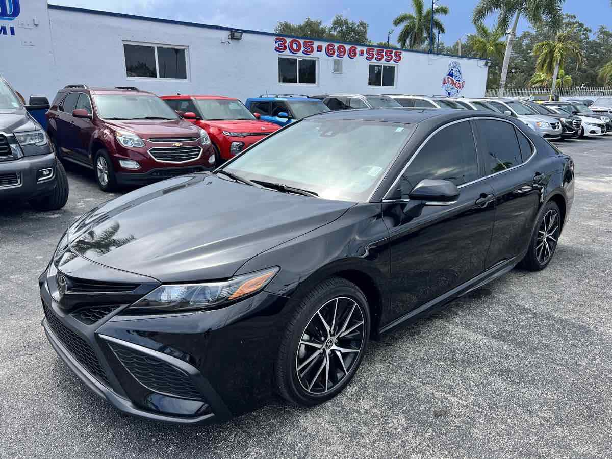 Our sophisticated 2022 Toyota Camry SE Sedan creates an undeniable presence everywhere you go - starting with its striking Midnight Black Metallic finish! Power comes from a 2.5 Liter Dynamic Force 4 Cylinder that offers 203hp connected to a paddle-shifted 8 Speed Automatic transmission for confident performance. This Front Wheel Drive sedan is ready to carve the corners with its sport-tuned suspension - and it cruises the highway at nearly 39mpg. You'll also love the aggressive design of our Camry - which shows off a black grille - prominent rocker panels - a rear spoiler - chrome-tipped exhaust outlets - LED lighting - and 18-inch black alloy wheels. Thoughtfully engineered for comfort and convenience - our SE cabin inspires you to have fun driving with supportive SofTex seats - eight-way power for the driver - a leather-wrapped steering wheel - dual-zone automatic climate control - and smart technology to tie it all together. Highlights include a 7-inch touchscreen - navigation - Android Auto/Apple CarPlay - Bluetooth - WiFi/Amazon Alexa compatibility - and a six-speaker sound system. There's plenty of space to stretch out - too! Drive with an extra measure of confidence knowing Toyota Safety Sense 2.5 technology is onboard with a backup camera - automatic braking - adaptive cruise control - lane-keeping assistance - and more. Hard to resist - our Camry SE sedan is easy to own! Save this Page and Call for Availability. We Know You Will Enjoy Your Test Drive Towards Ownership! This vehicle has a branded title and was DMV inspected in Florida. It is in excellent condition - and everything works perfectly - we have test driven it several times and checked to make sure all the options and features work as they should. It is priced thousands below its J.D. Power retail value based on advertised trim - miles - and options. Our vehicles go through a 151-Point Inspection and this vehicle includes a 3 Month 3 -000 Miles in-house warranty*. It is ready to go for local - nationwide - or international shipping. At Autoworld you will save thousands without sacrificing quality. You can now afford a newer model year - higher trim level - and even lower miles than what you were expecting in your price range. For more than 30 years customers worldwide agree that vehicles from Autoworld of America offer the best value and quality. $$$ DRIVE THE CAR - NOT THE TITLE - SAVE THOUSANDS $$$
