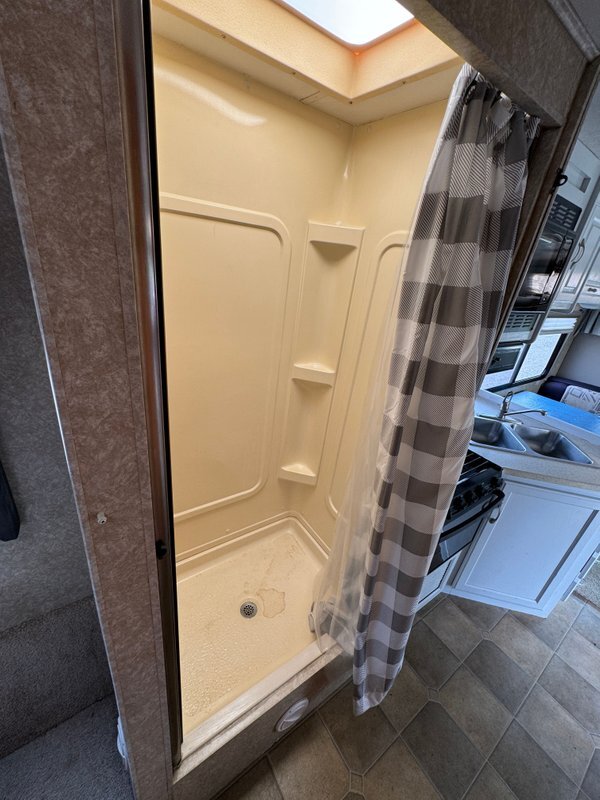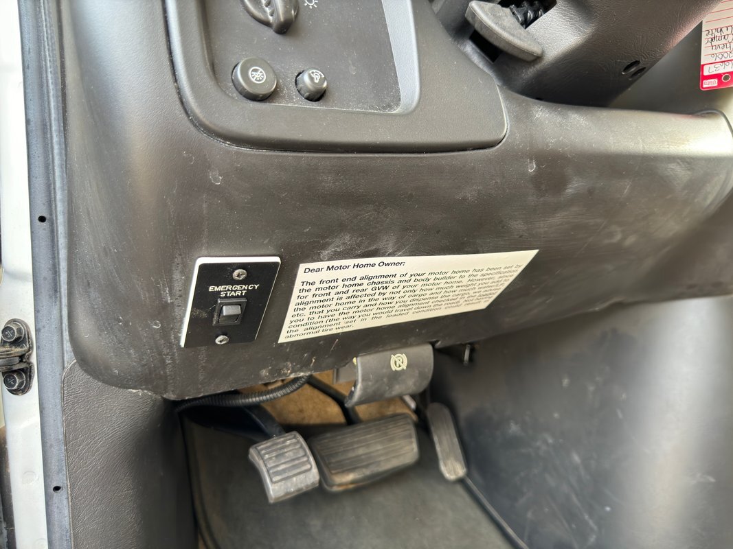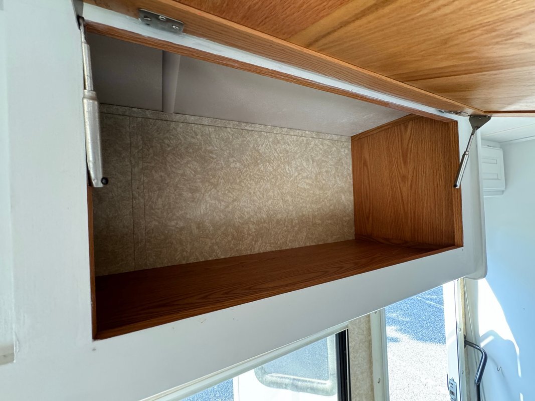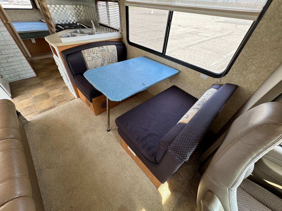 Let's start in the cab which starts with molded tan plastic door panels with lots of map pockets which you'll likely use for other storage since paper maps are obsolete. Cloth bucket seats with a checkered pattern are in very good shape and sit behind a simple dashboard with the usual gauge cluster and familiar digital green read out of mileage. The center stack, also wrapped in black plastic, houses an AM/FM/Cassette radio and A/C controls while storage cubbies and cup holders are o'plenty. The cab is open to the camper section which starts with the loft above the cabin that converts into a bed. Sleepers can pull down the Levelor type blinds for privacy and darkness. A dinette area includes a pair of small benches with seat belts for two on each side of a collapsible table while across the hall, a leather like sofa that also converts to a sleeper. A double sink and three burner stove are in the kitchen along with a microwave and good sized refrigerator while high mounted storage cabinets afford plenty of space. The shower is stand alone plastic construction while the dry bath is a separate room. The master bedroom in back has a full sized bed and window treatments above the blinds and of course, plenty of closet space and storage. Rolled vinyl tile is in the kitchen while plush, tan carpet covers the rest of the living space.