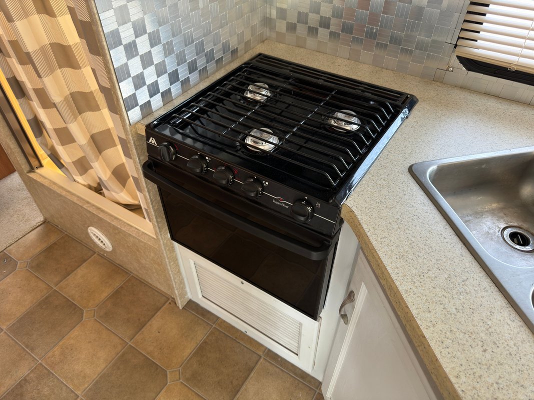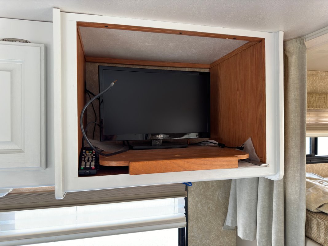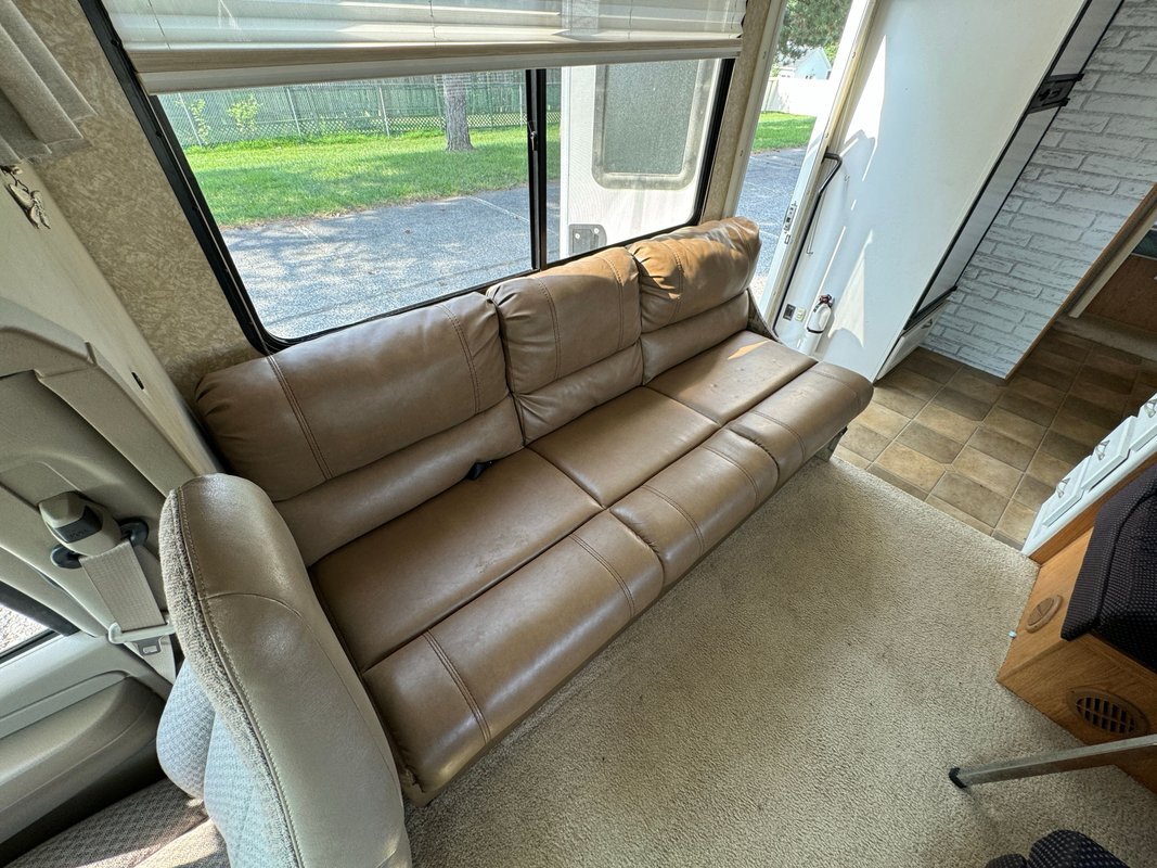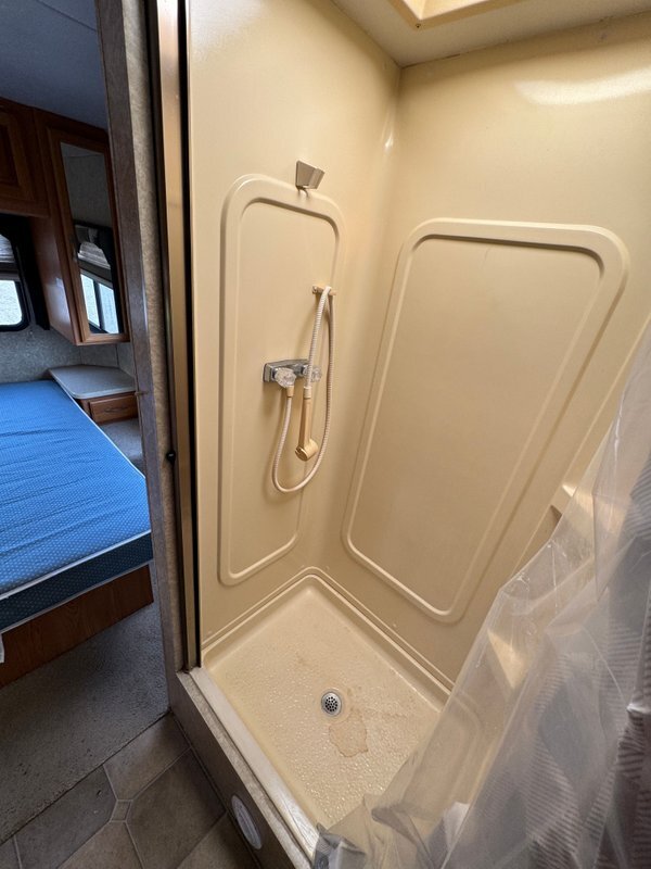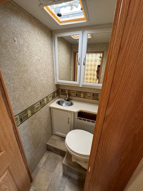 Let's start in the cab which starts with molded tan plastic door panels with lots of map pockets which you'll likely use for other storage since paper maps are obsolete. Cloth bucket seats with a checkered pattern are in very good shape and sit behind a simple dashboard with the usual gauge cluster and familiar digital green read out of mileage. The center stack, also wrapped in black plastic, houses an AM/FM/Cassette radio and A/C controls while storage cubbies and cup holders are o'plenty. The cab is open to the camper section which starts with the loft above the cabin that converts into a bed. Sleepers can pull down the Levelor type blinds for privacy and darkness. A dinette area includes a pair of small benches with seat belts for two on each side of a collapsible table while across the hall, a leather like sofa that also converts to a sleeper. A double sink and three burner stove are in the kitchen along with a microwave and good sized refrigerator while high mounted storage cabinets afford plenty of space. The shower is stand alone plastic construction while the dry bath is a separate room. The master bedroom in back has a full sized bed and window treatments above the blinds and of course, plenty of closet space and storage. Rolled vinyl tile is in the kitchen while plush, tan carpet covers the rest of the living space.