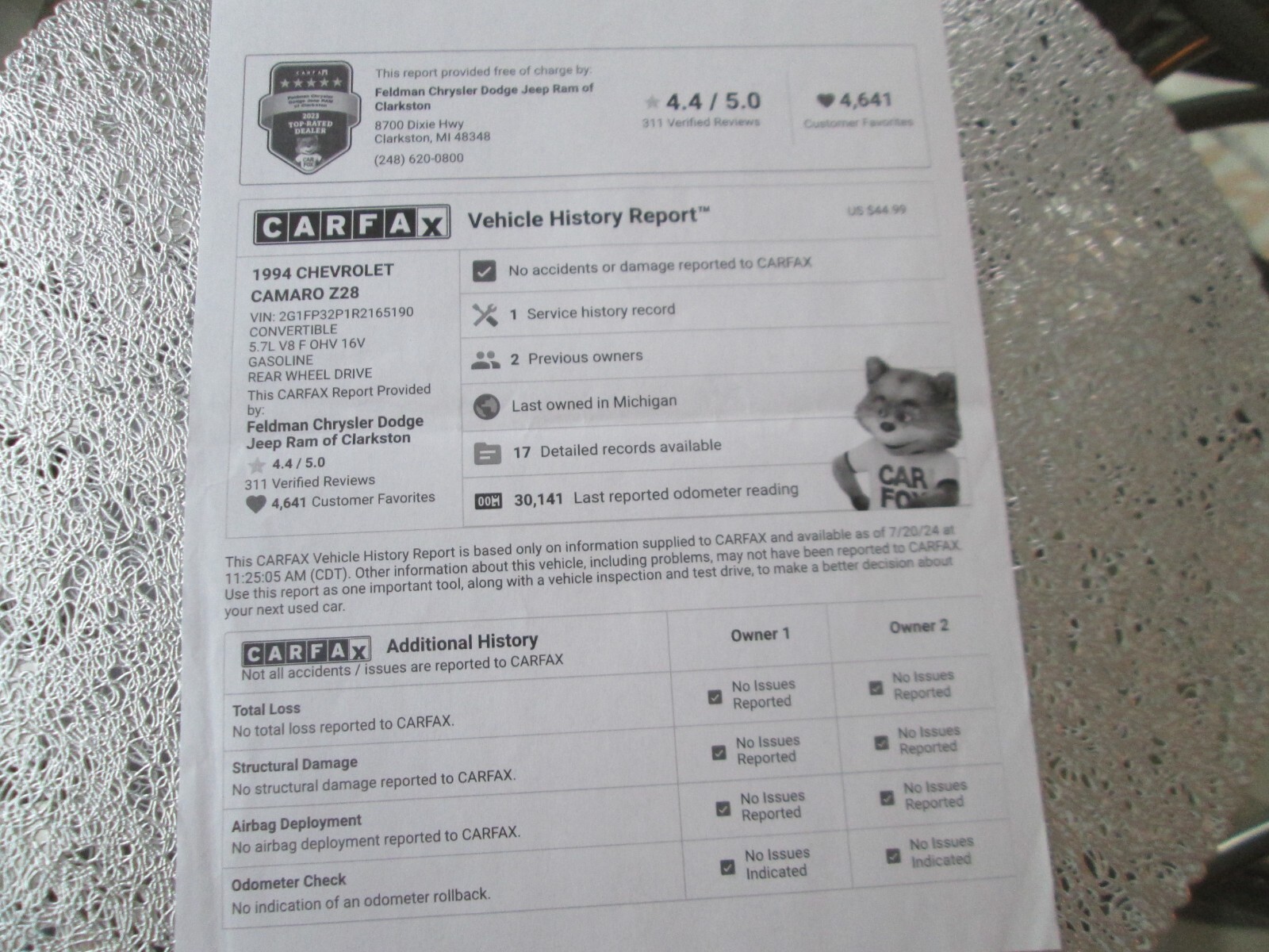 1994 Z28 Camaro Convertible completely stock, Very Very Clean I would say Like New, 5.7 V8 Automatic, comes with all accessories Boot, Car Cover, No Accidents and only 32K Miles! Ice Cold Air, Power Top, Power Seat. For more info my phone 248-495-0777