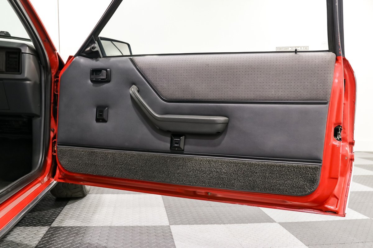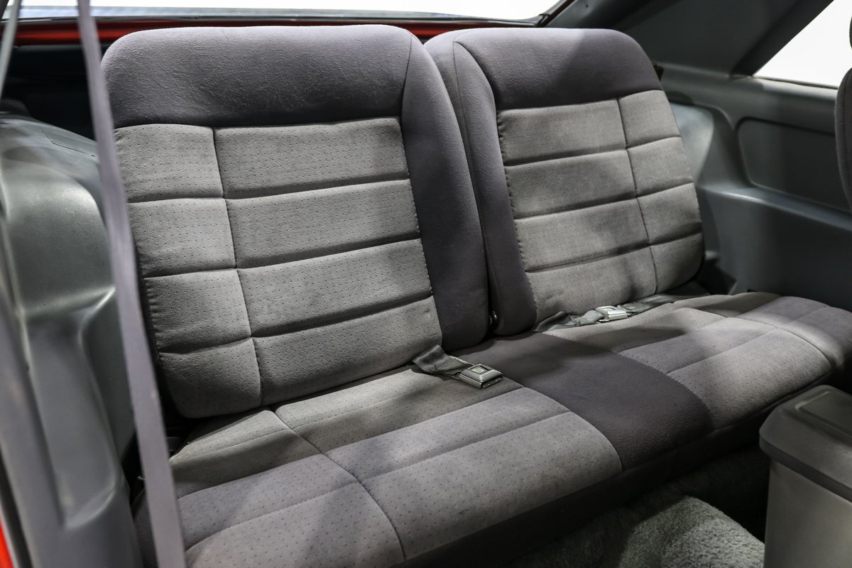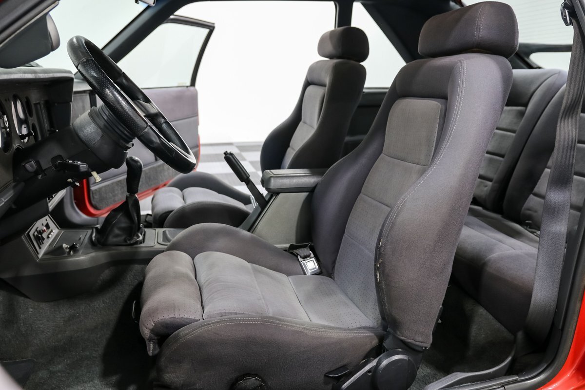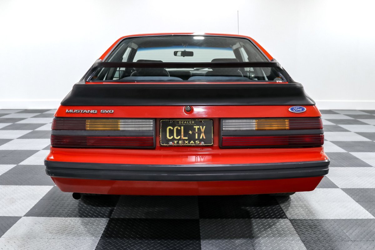 Finished in a vibrant red exterior with a sleek gray interior, this Mustang SVO exudes a sense of sportiness and sophistication. The bucket seats wrapped in cloth offer comfort and support, while the factory SVO wheels and hood give it an unmistakable presence on the road. It's a design that stands the test of time, blending retro charm with modern flair.