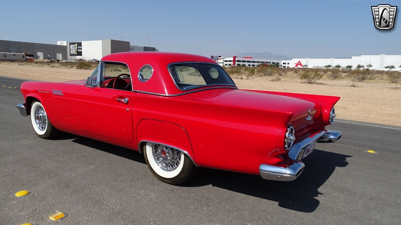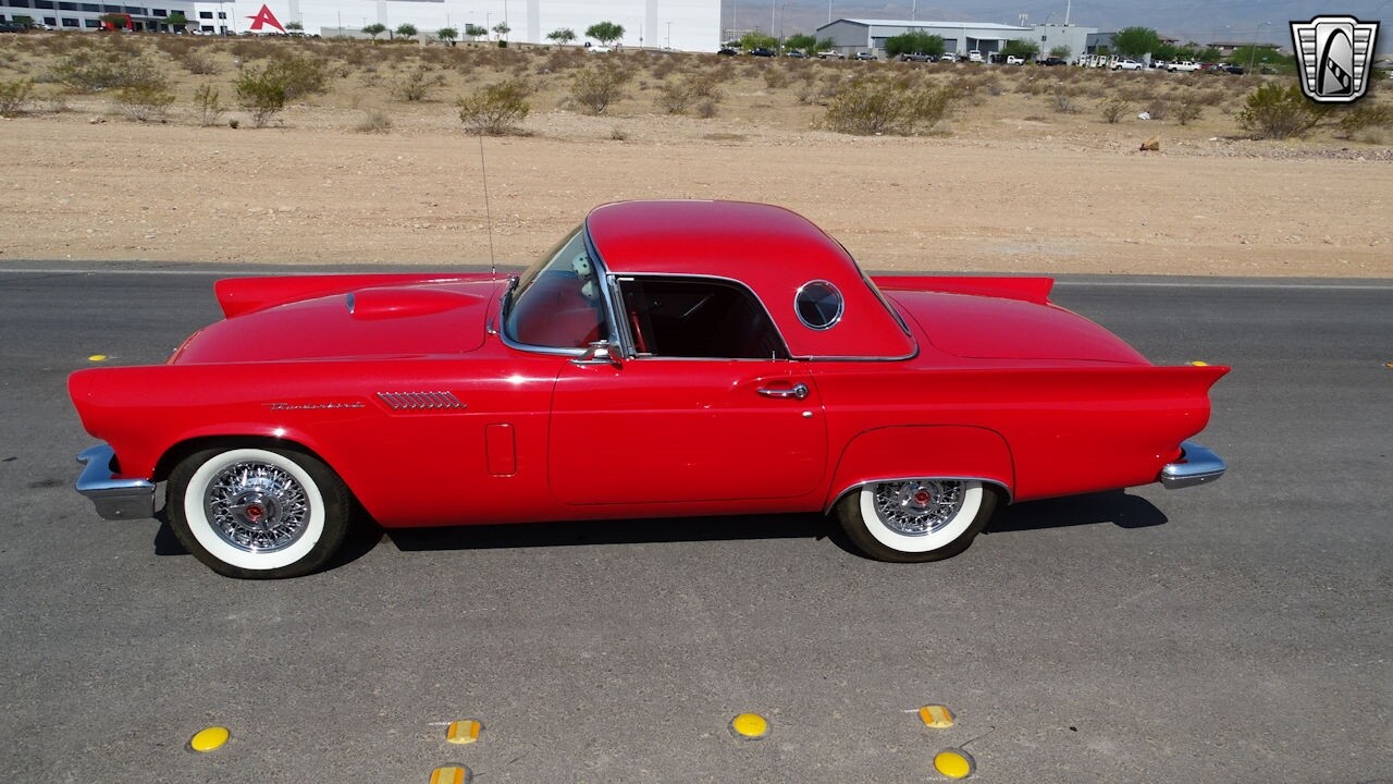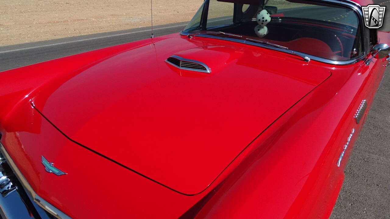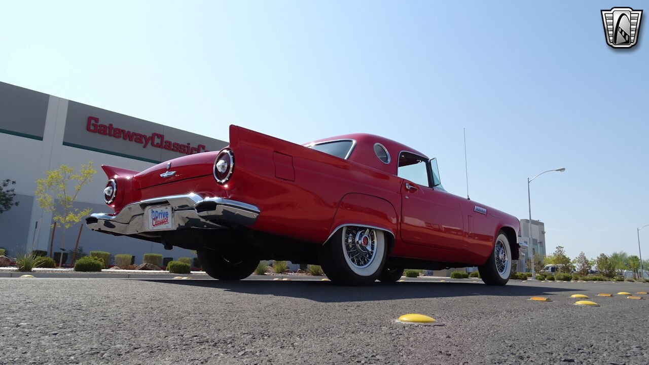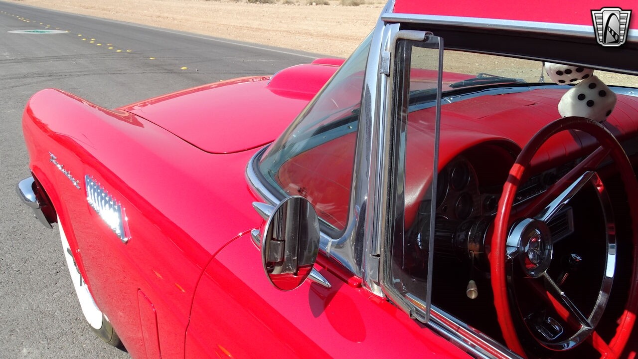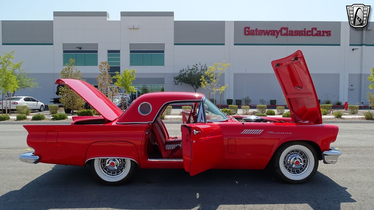 Experience the timeless elegance of the 1957 Ford Thunderbird Convertible. This classic beauty, with its striking red exterior and matching red interior, is sure to turn heads wherever you go.