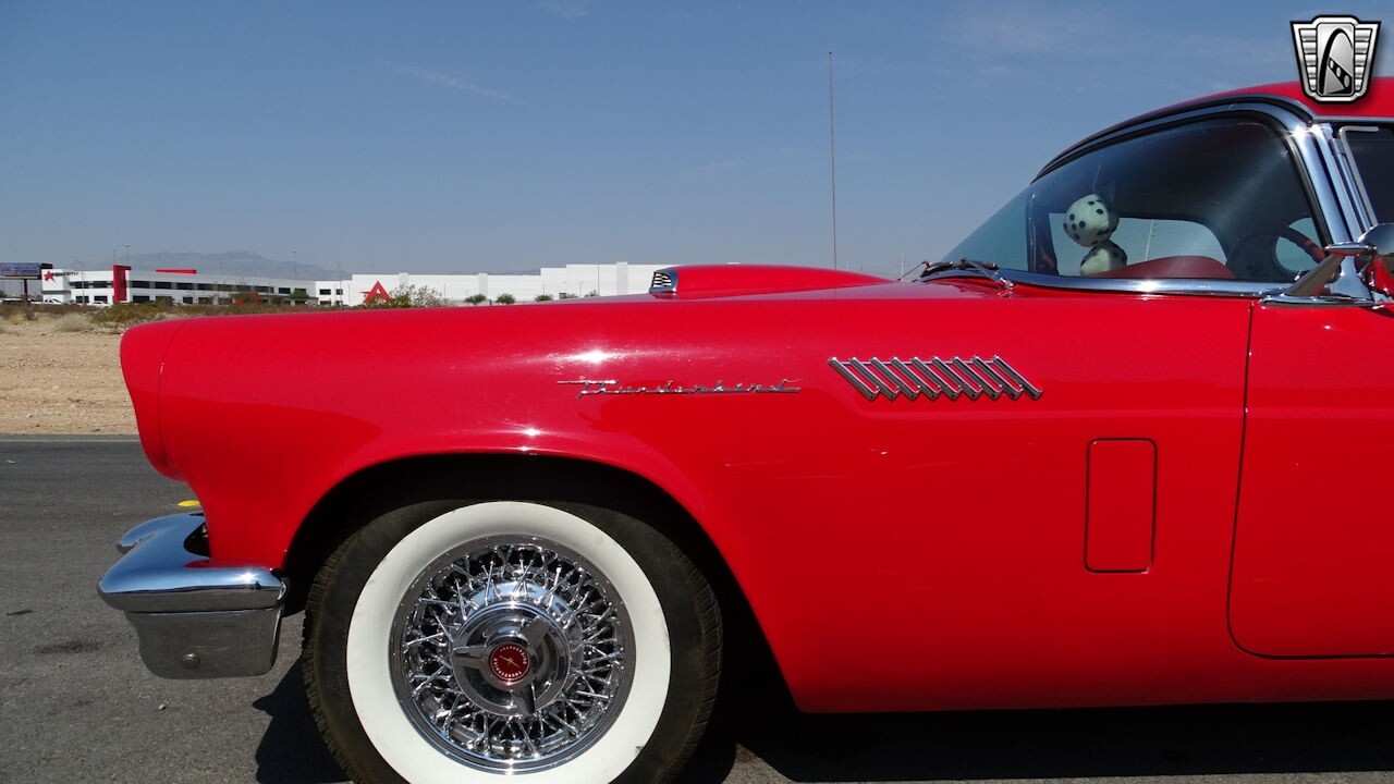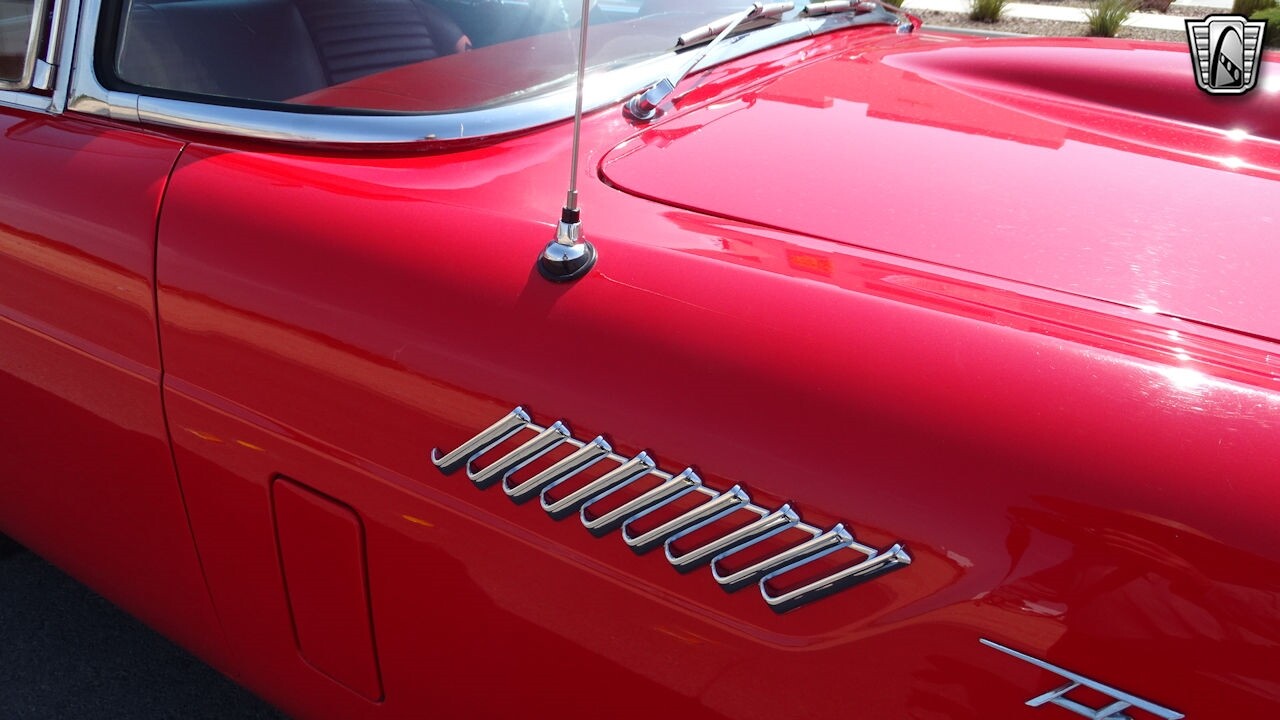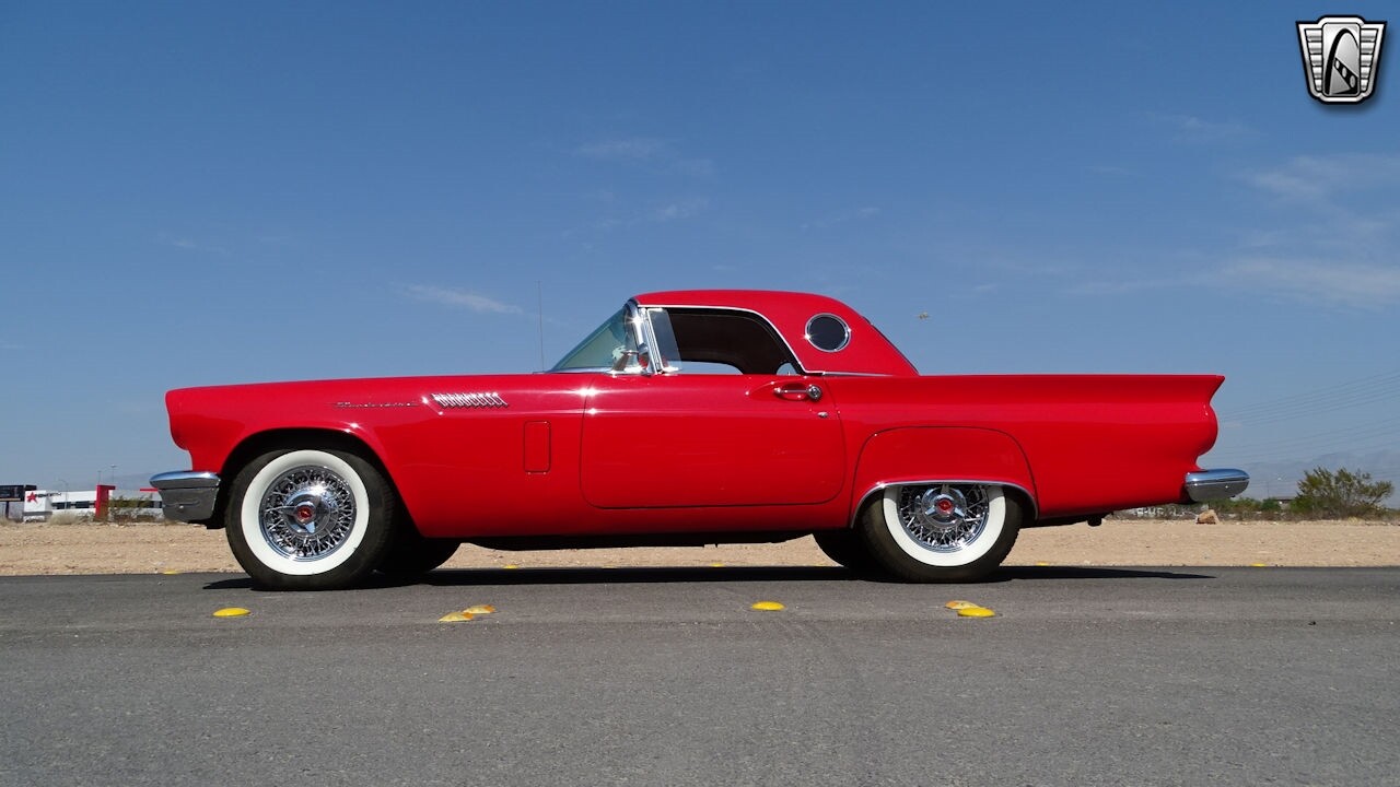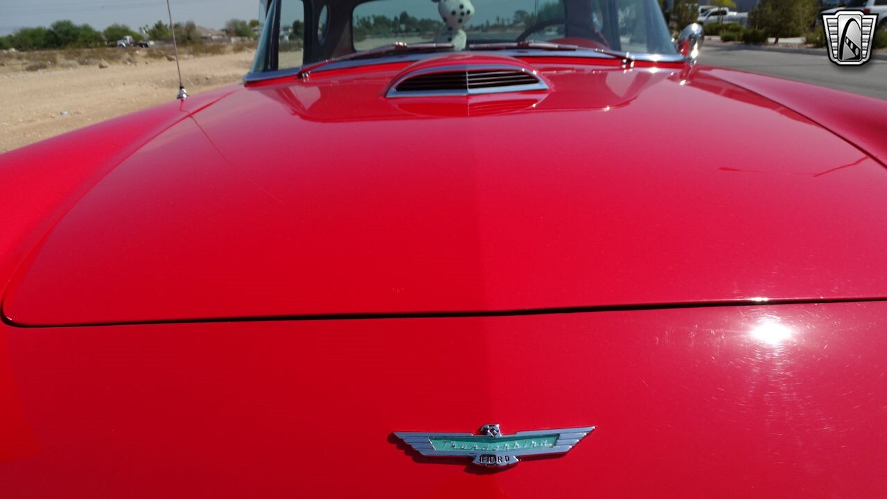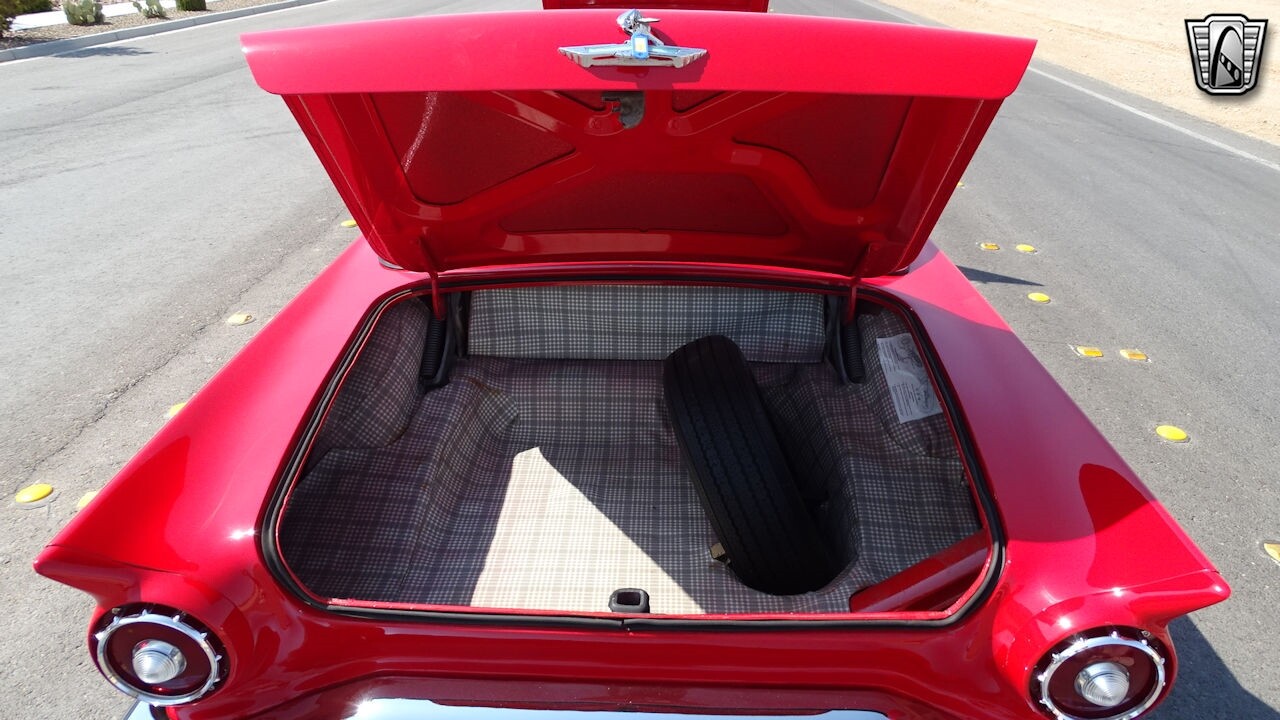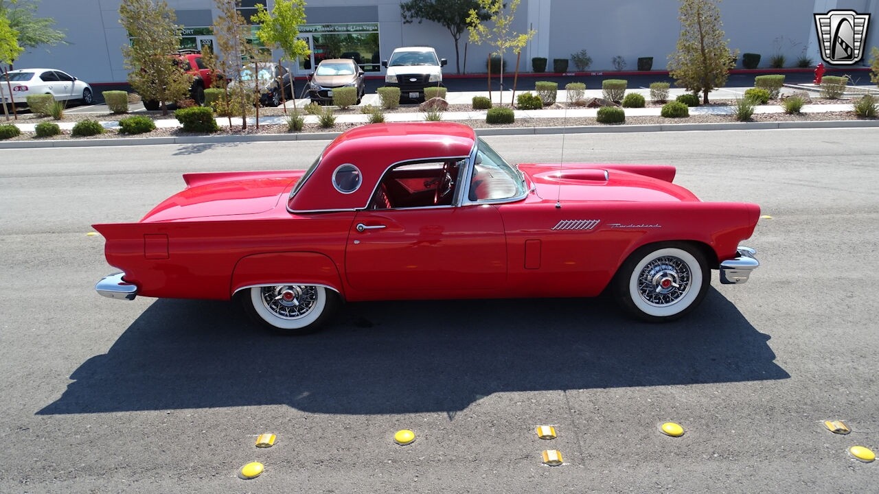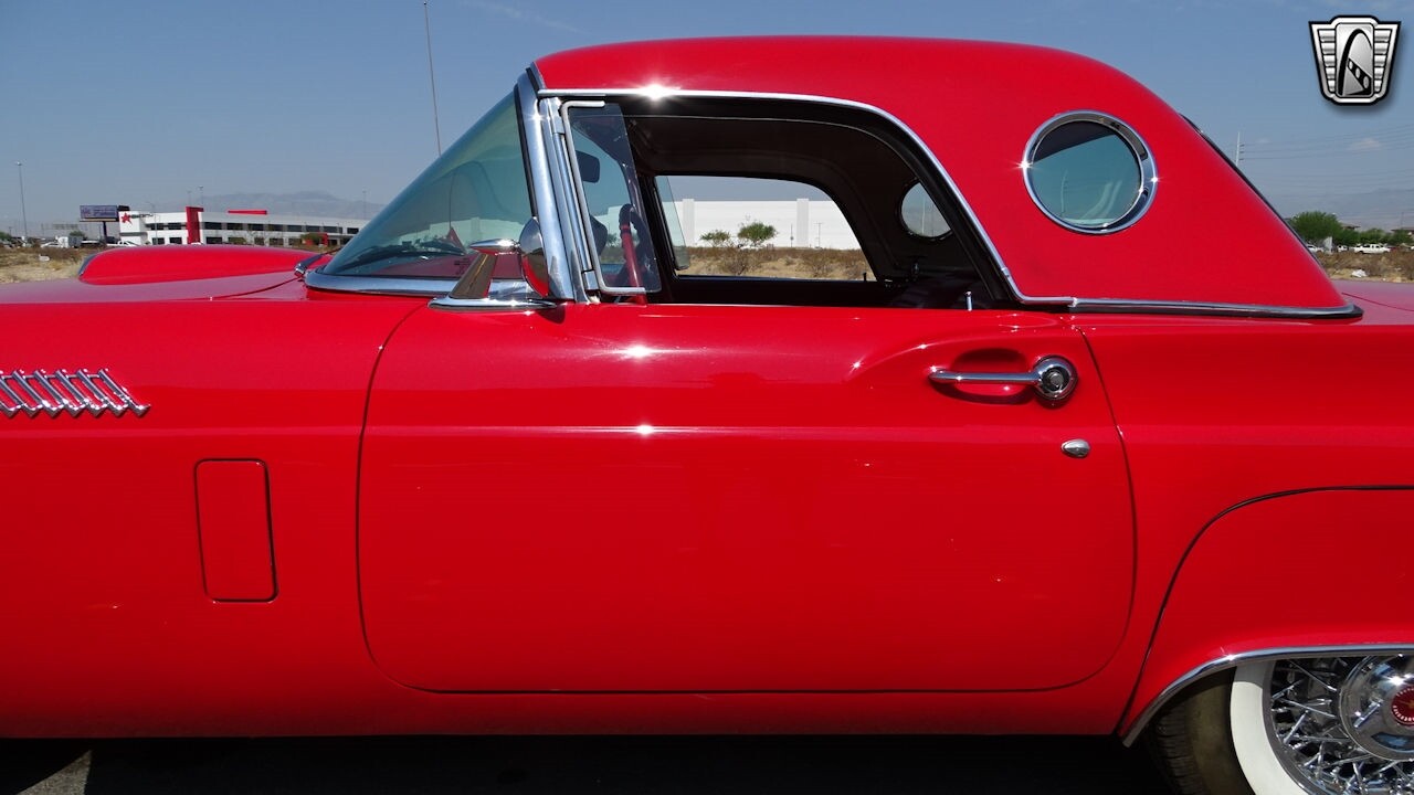 Experience the timeless elegance of the 1957 Ford Thunderbird Convertible. This classic beauty, with its striking red exterior and matching red interior, is sure to turn heads wherever you go.
