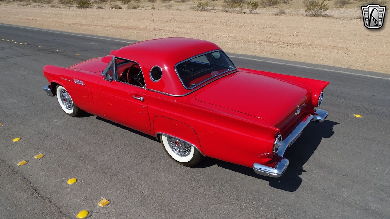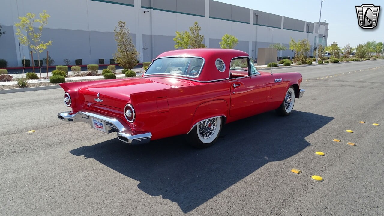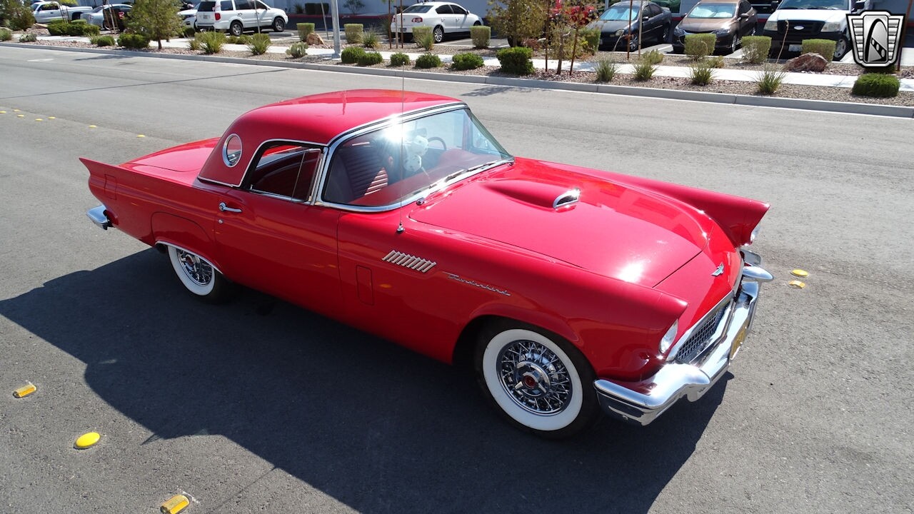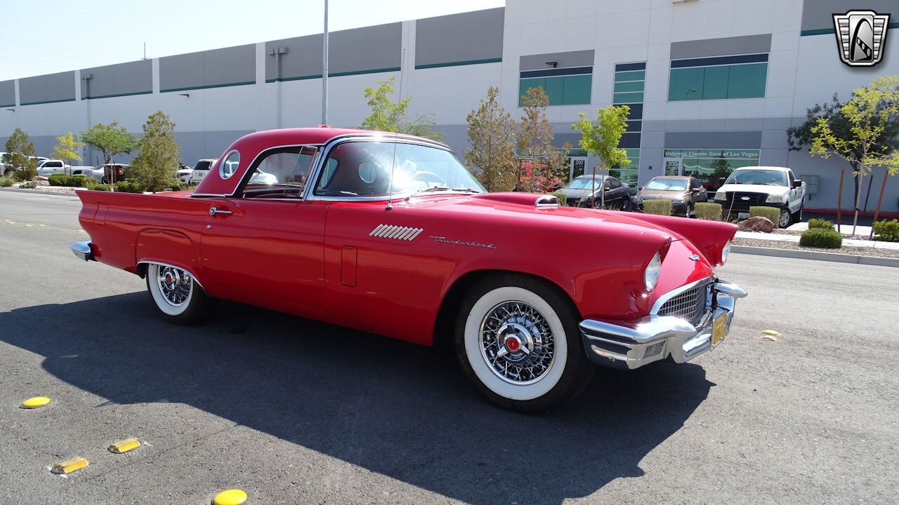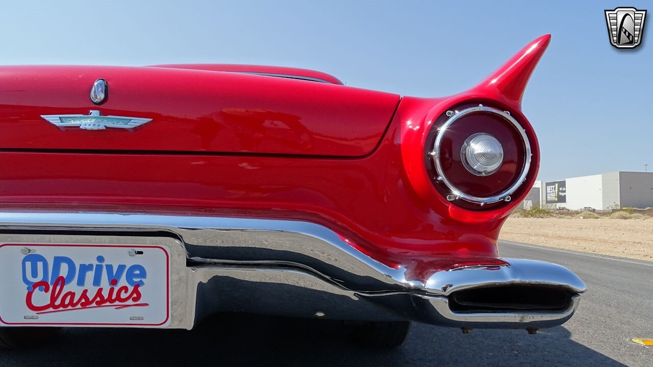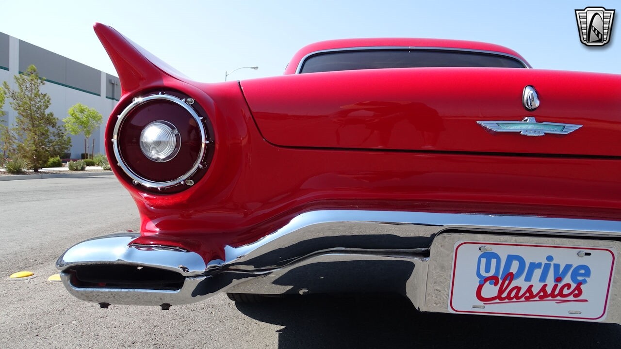 Experience the timeless elegance of the 1957 Ford Thunderbird Convertible. This classic beauty, with its striking red exterior and matching red interior, is sure to turn heads wherever you go.
