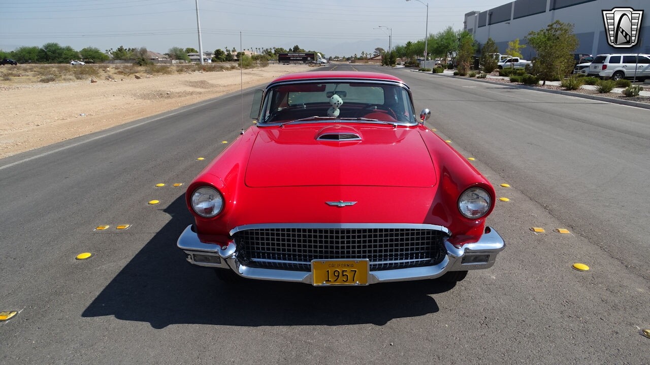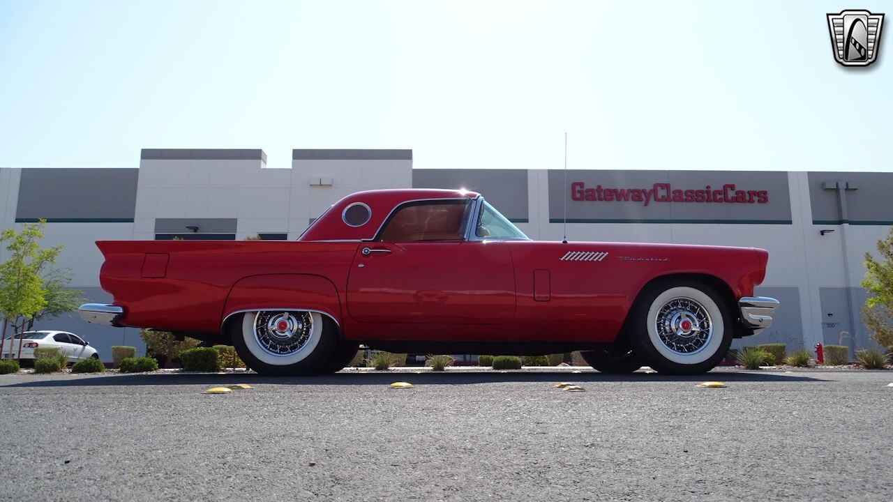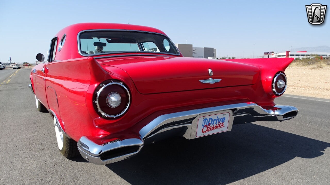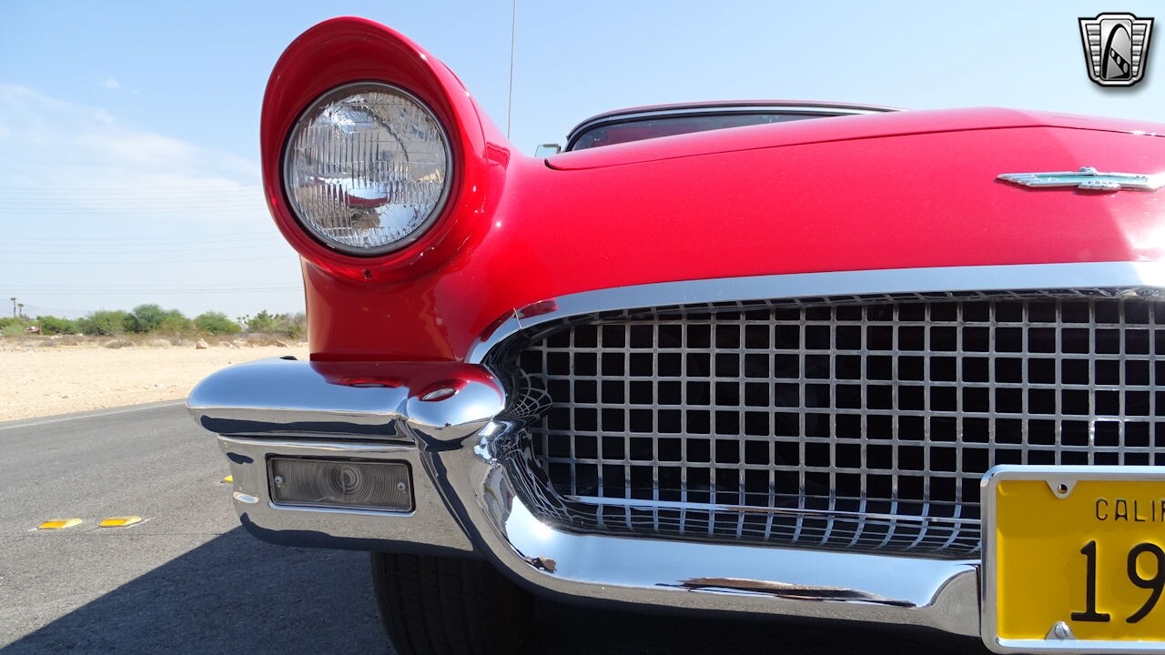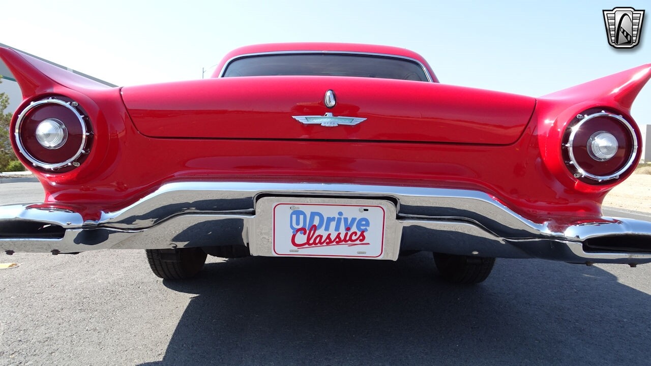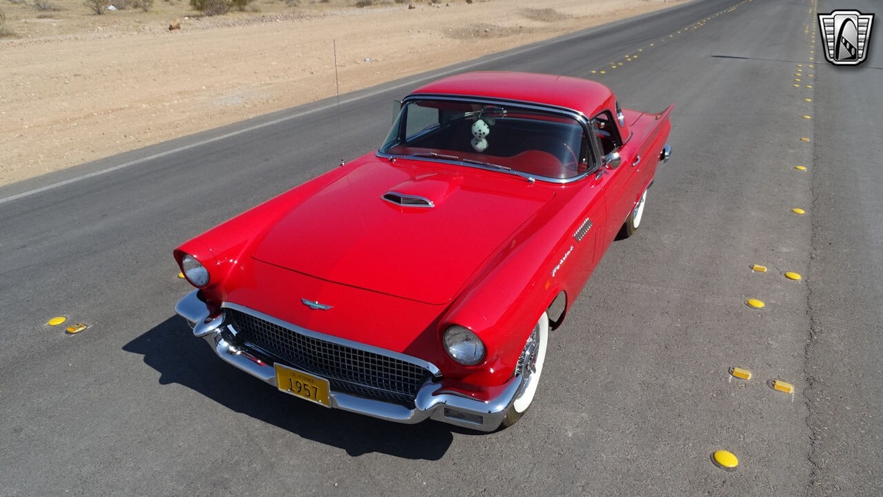 Experience the timeless elegance of the 1957 Ford Thunderbird Convertible. This classic beauty, with its striking red exterior and matching red interior, is sure to turn heads wherever you go.