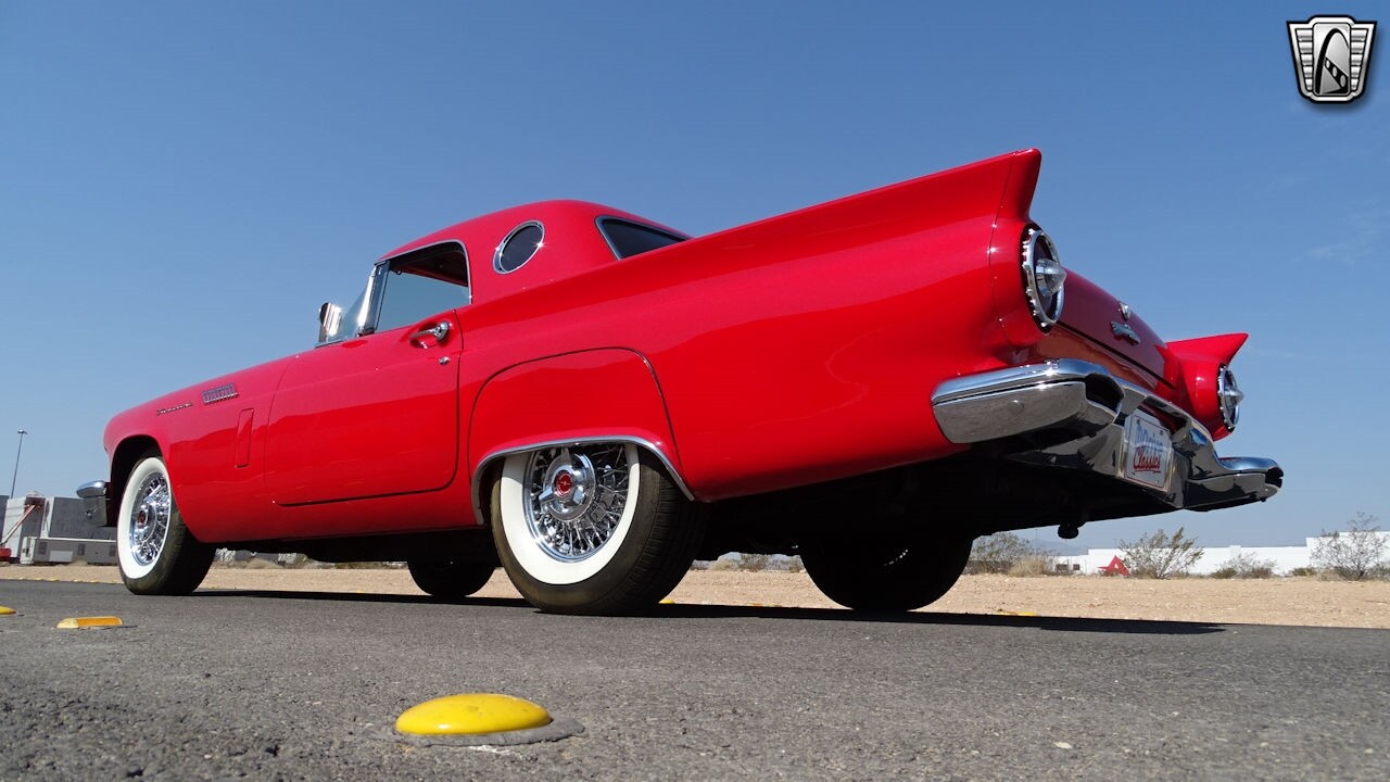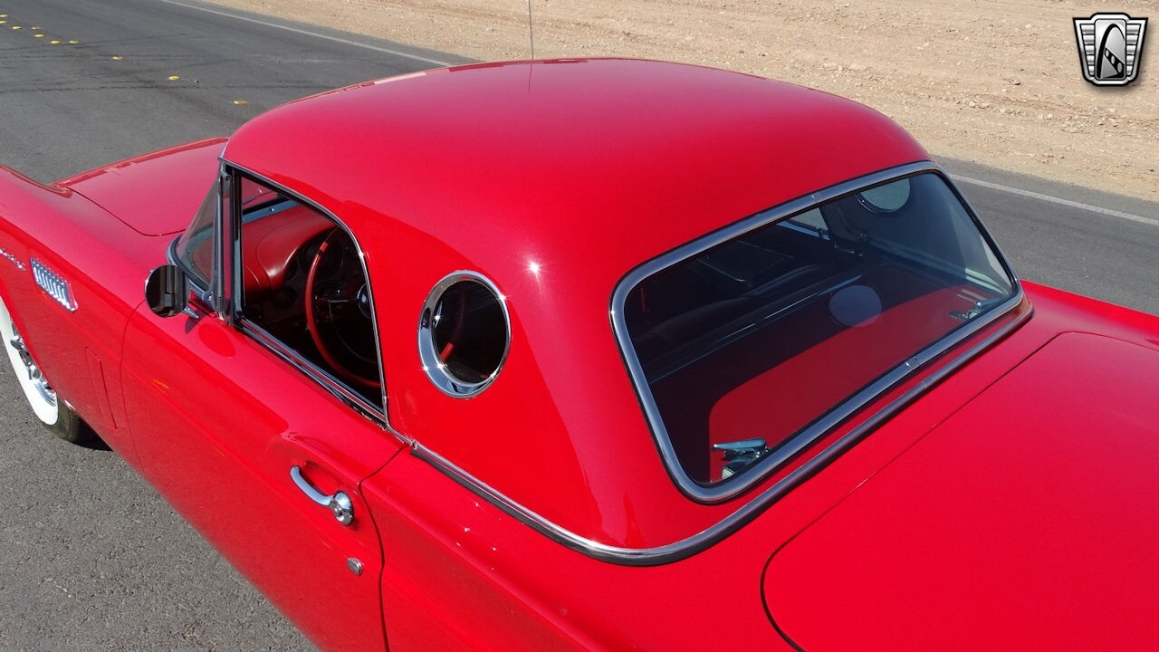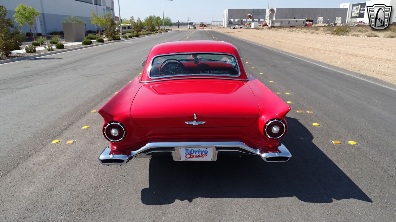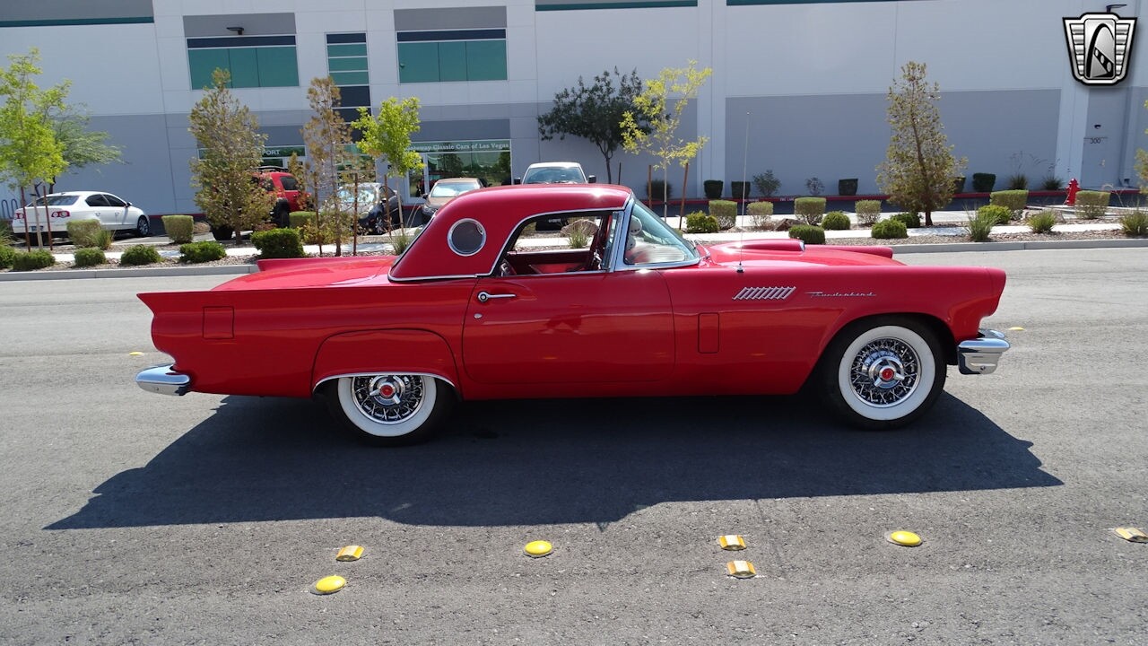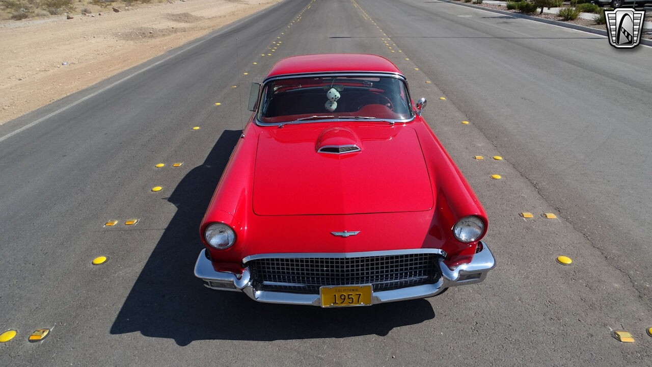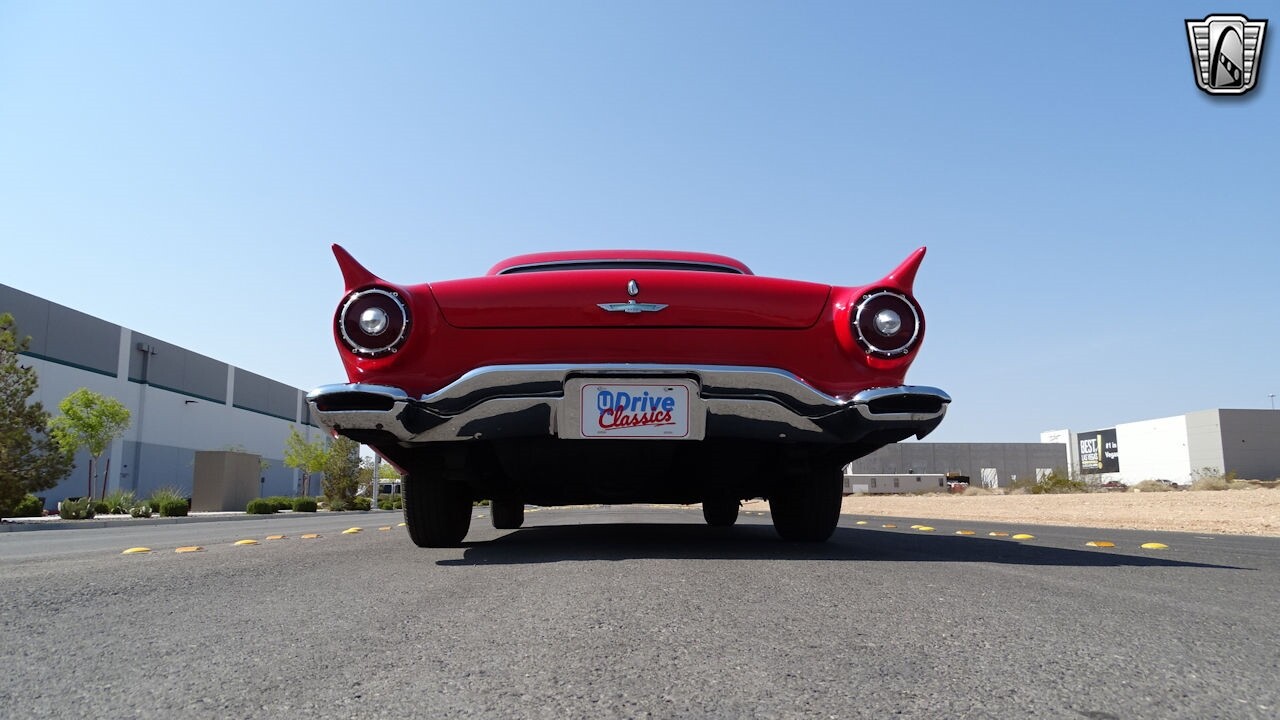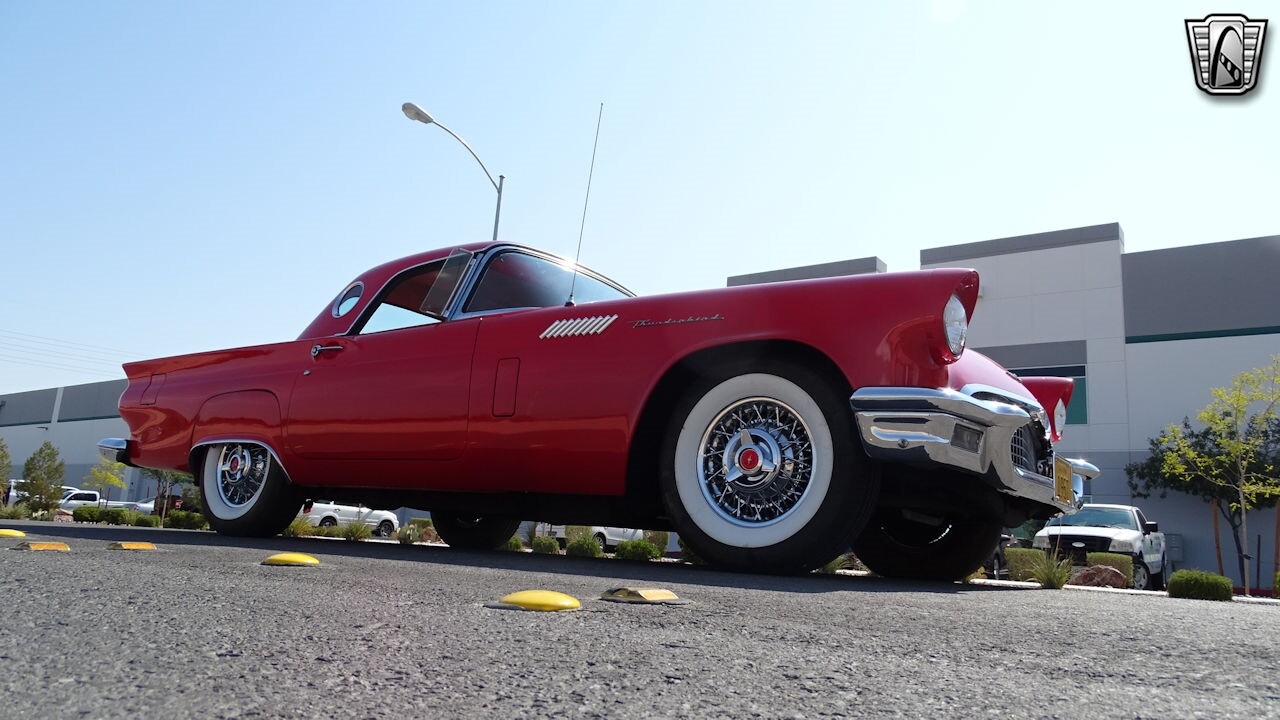 Experience the timeless elegance of the 1957 Ford Thunderbird Convertible. This classic beauty, with its striking red exterior and matching red interior, is sure to turn heads wherever you go.