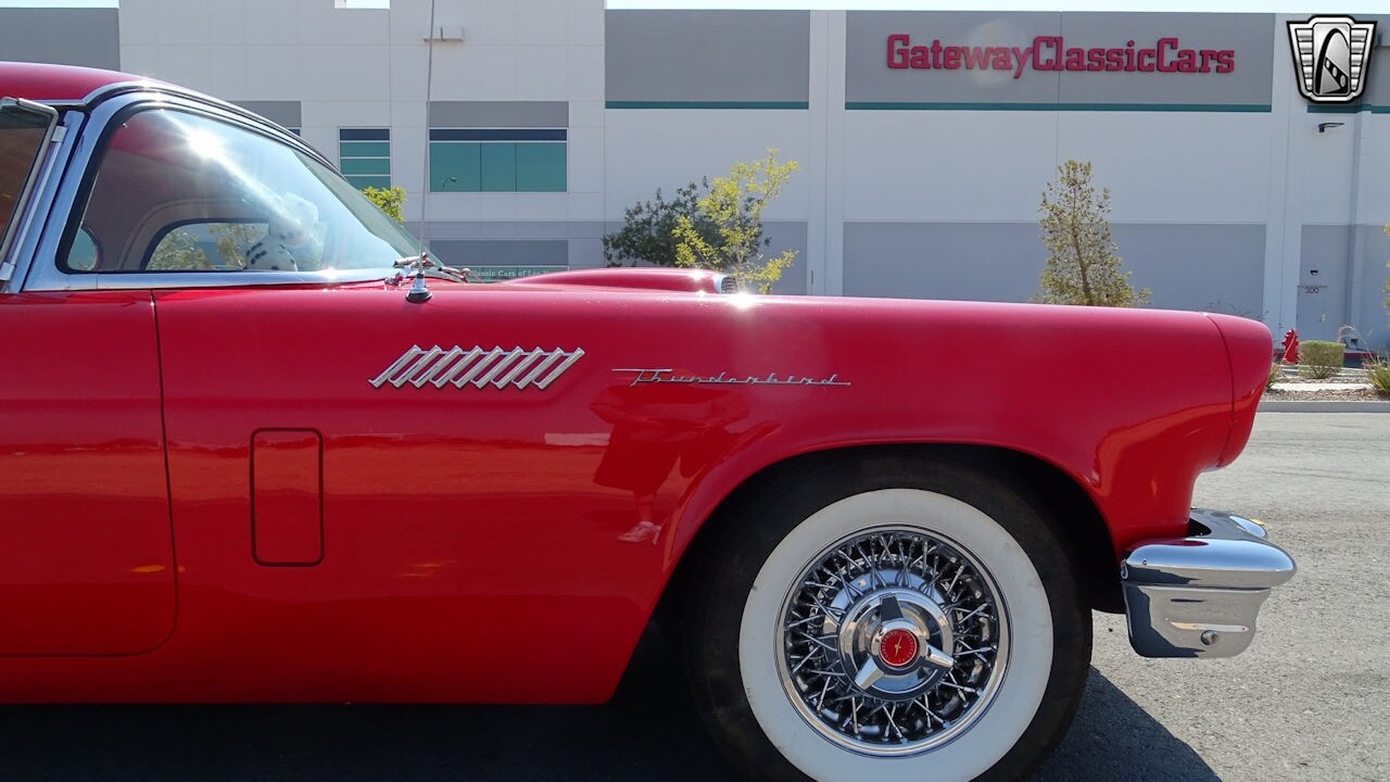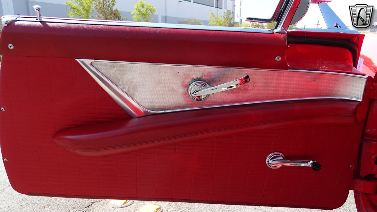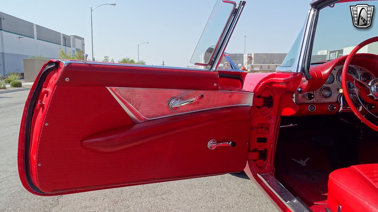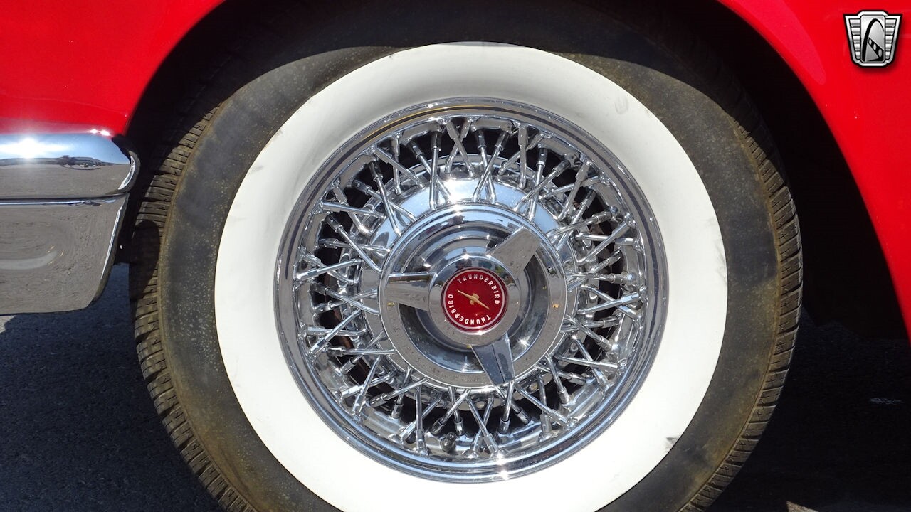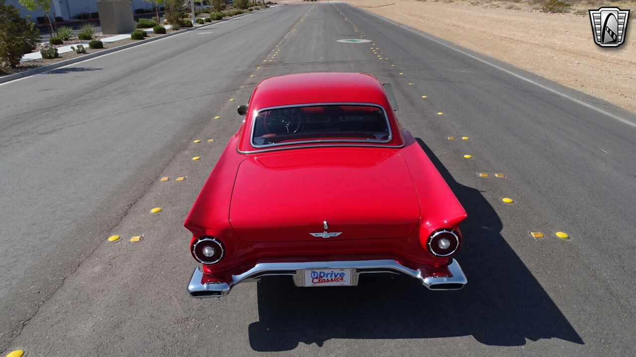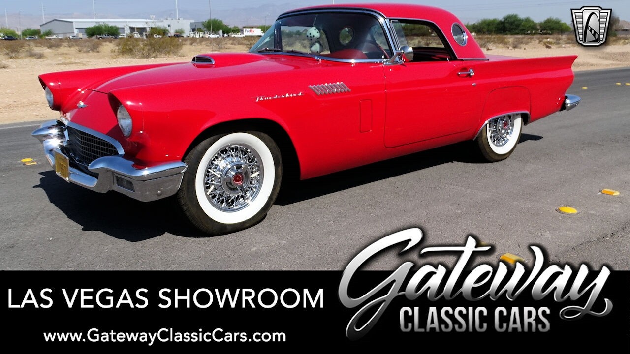 Experience the timeless elegance of the 1957 Ford Thunderbird Convertible. This classic beauty, with its striking red exterior and matching red interior, is sure to turn heads wherever you go.