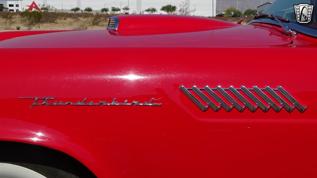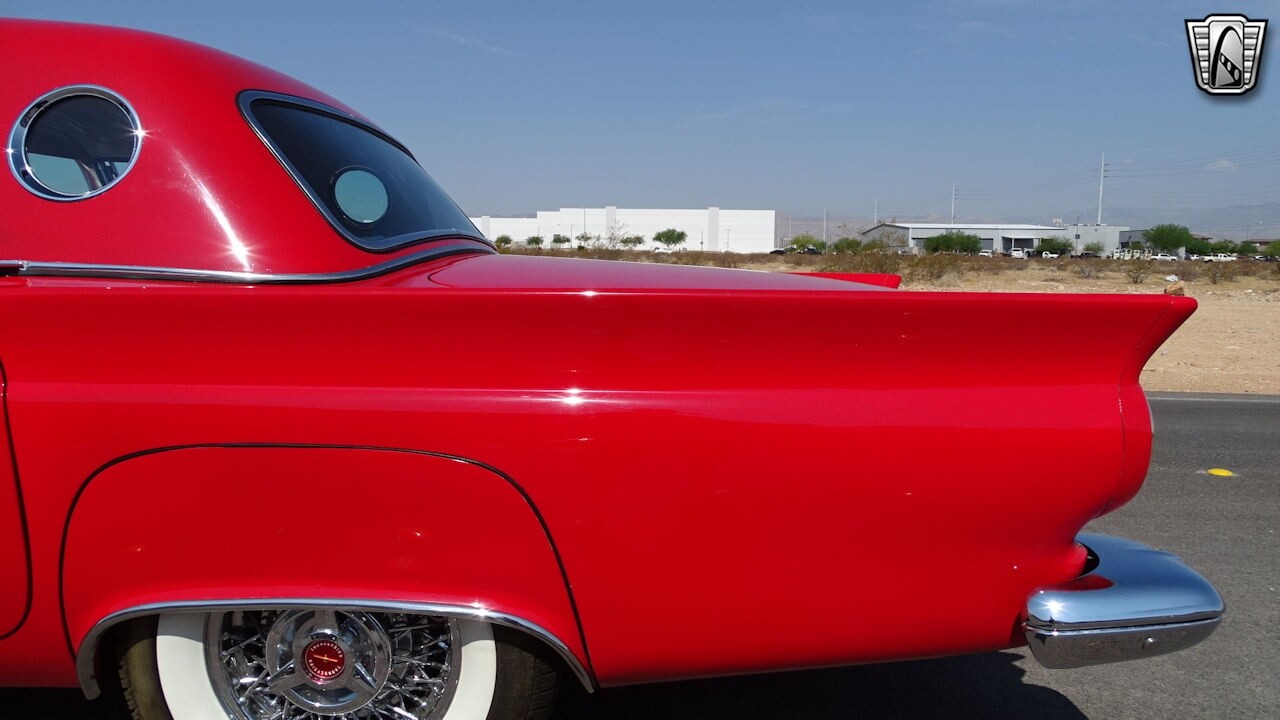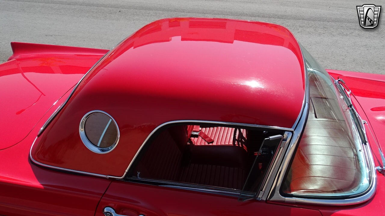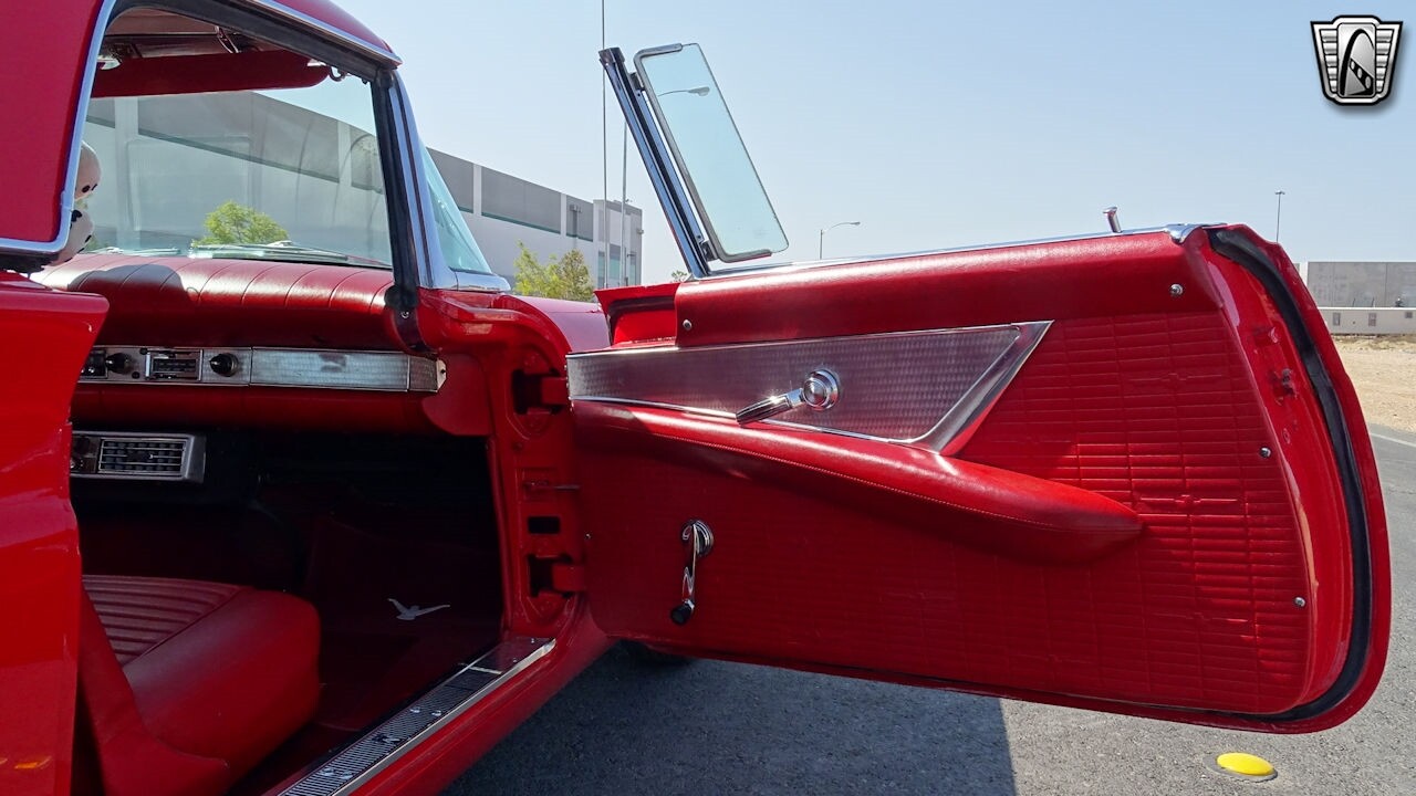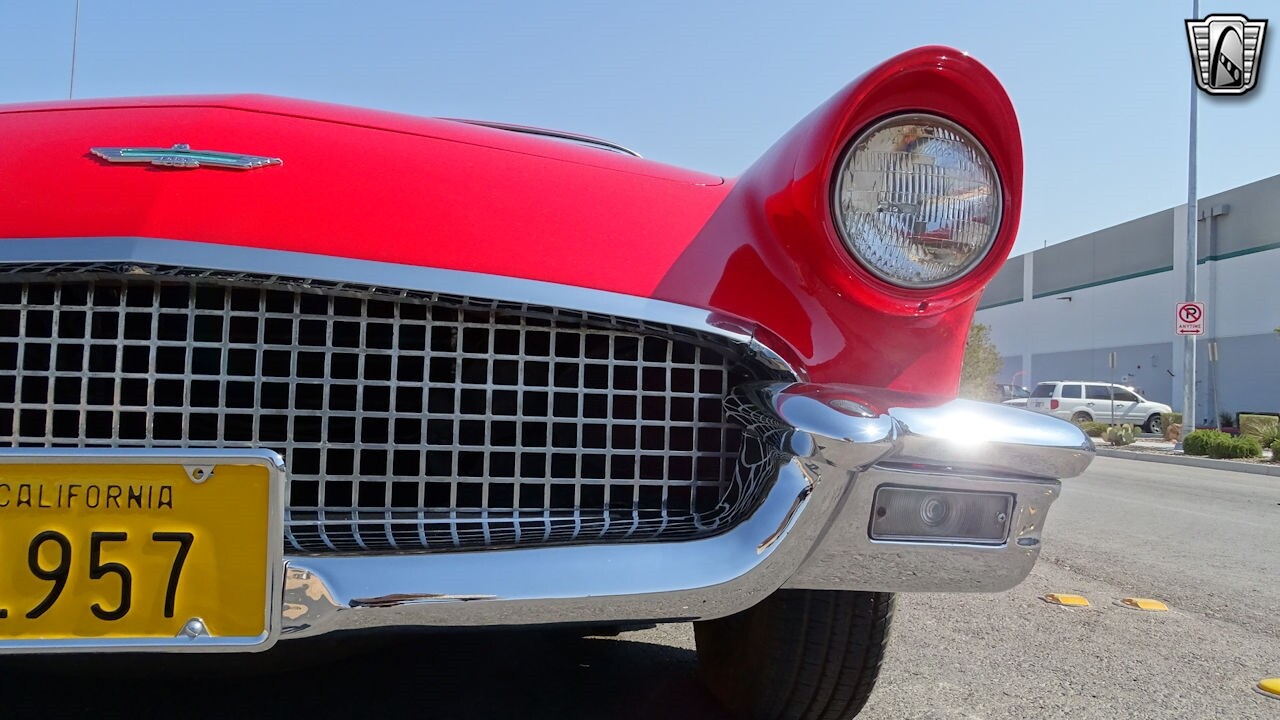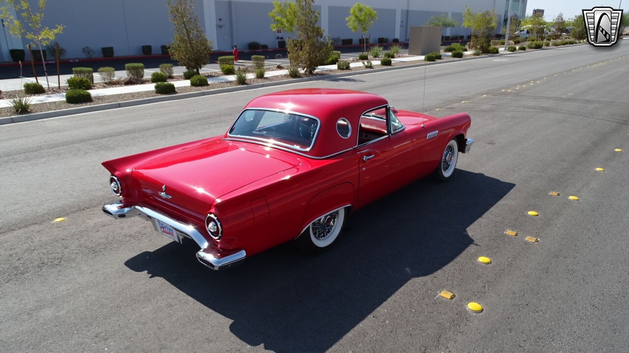 Experience the timeless elegance of the 1957 Ford Thunderbird Convertible. This classic beauty, with its striking red exterior and matching red interior, is sure to turn heads wherever you go.