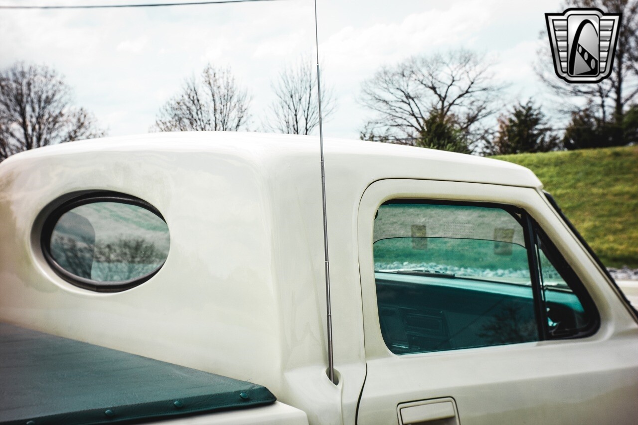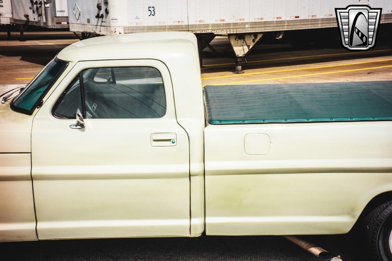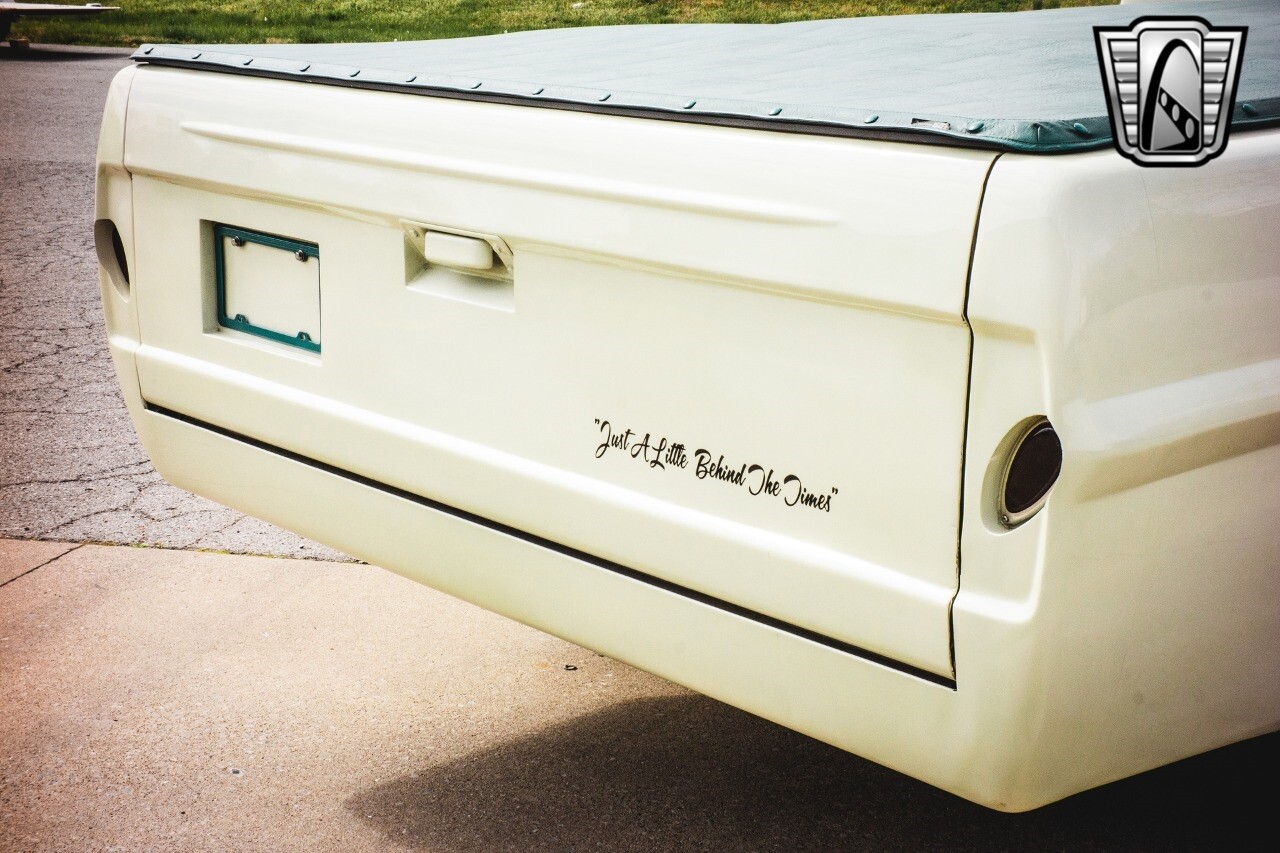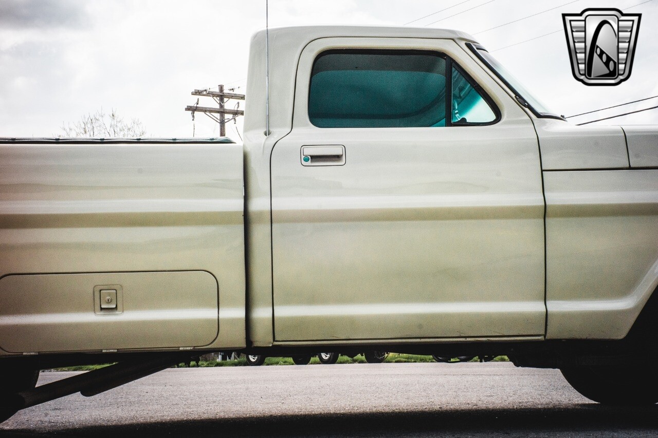 The exterior is dressed in an off soft light green with ghost flames that will catch anyone's eyes. The body of this F100 was treated to many touches, some small and some not so small. The chop is obvious, as is the rear window but then there are small subtle touches like the frenched in lights and antenna. With vinyl seating, new custom door panels that house your power buttons for the windows. Everything inside has been modified, moved, replace or customized. Look, you're not afraid to be different and this truck makes that statement to loud and clear.
