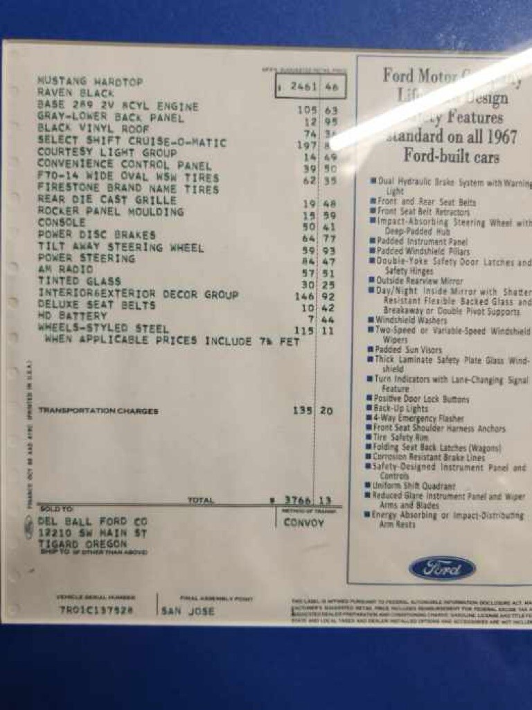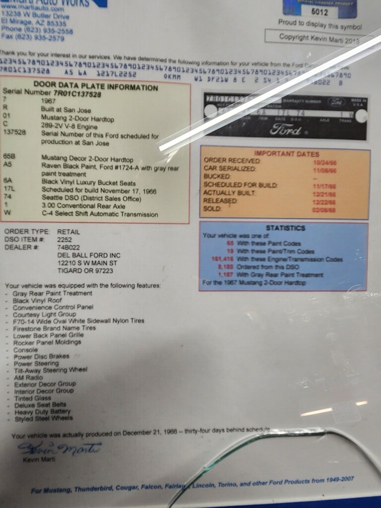 1967 Ford Mustang 2dr Coupe this is a one of one vehicle built with the Marti Report to prove it. This is a great little 67 tripple black with a 289 V8 and automatic transmission. This is a driver quality that does win car shows when entered. the black paint is in good condition but has some blemishes as shown in pics and video. This car runs and drives great. Again this is a one of one Mustang built! Great Example of a true classic. The Engine has been rebuilt with paperwork to show| New exhaust| This vehicle is available for viewing by appointment only. Dont miss out on your chance to own a classic 1967 Ford Mustang 1of1 built Black Coupe. We do have the reciepts for the engine build and dyno| Exhaust system| transmission rebuild| also have old pictures of the car that the owner wants to pass along with the car. This is not your run of the mill Mustang This is a well taken care of 1 of 1 built triple back 67. $32|999.00 plus tax and license B&C Motorsports 866-718-6082