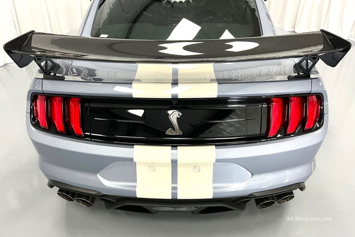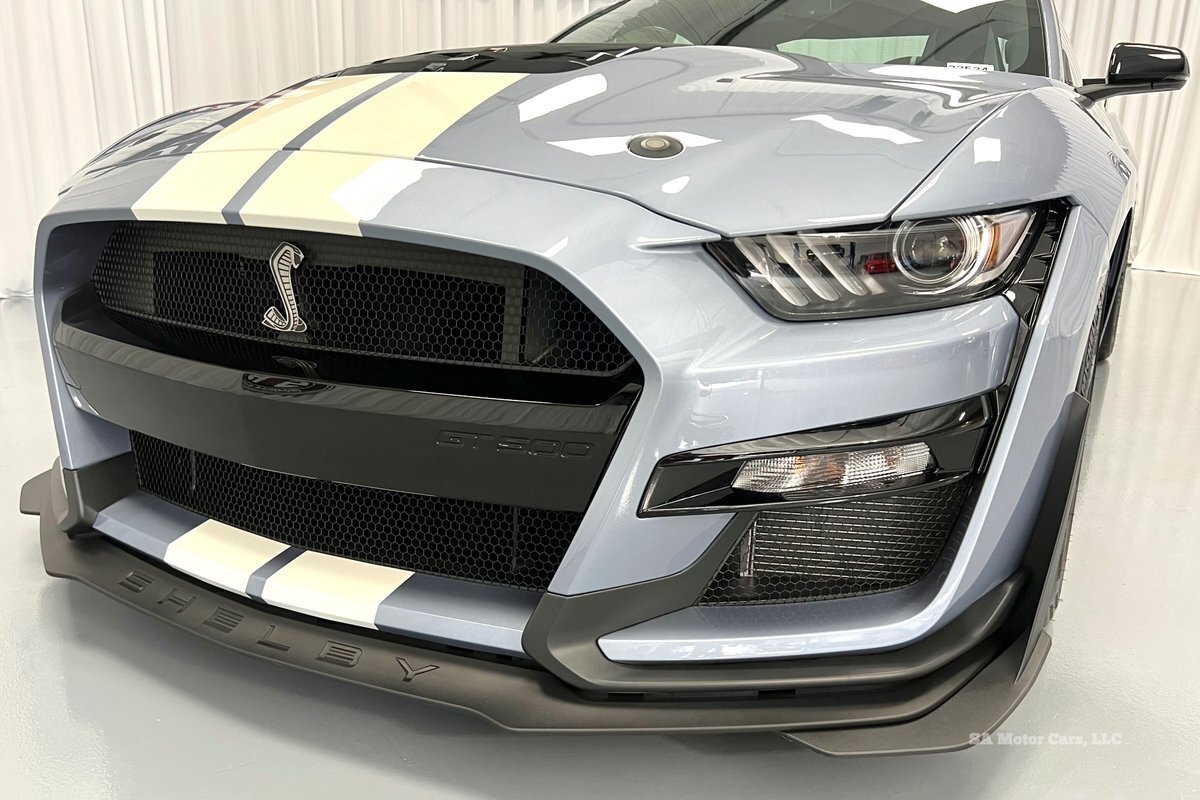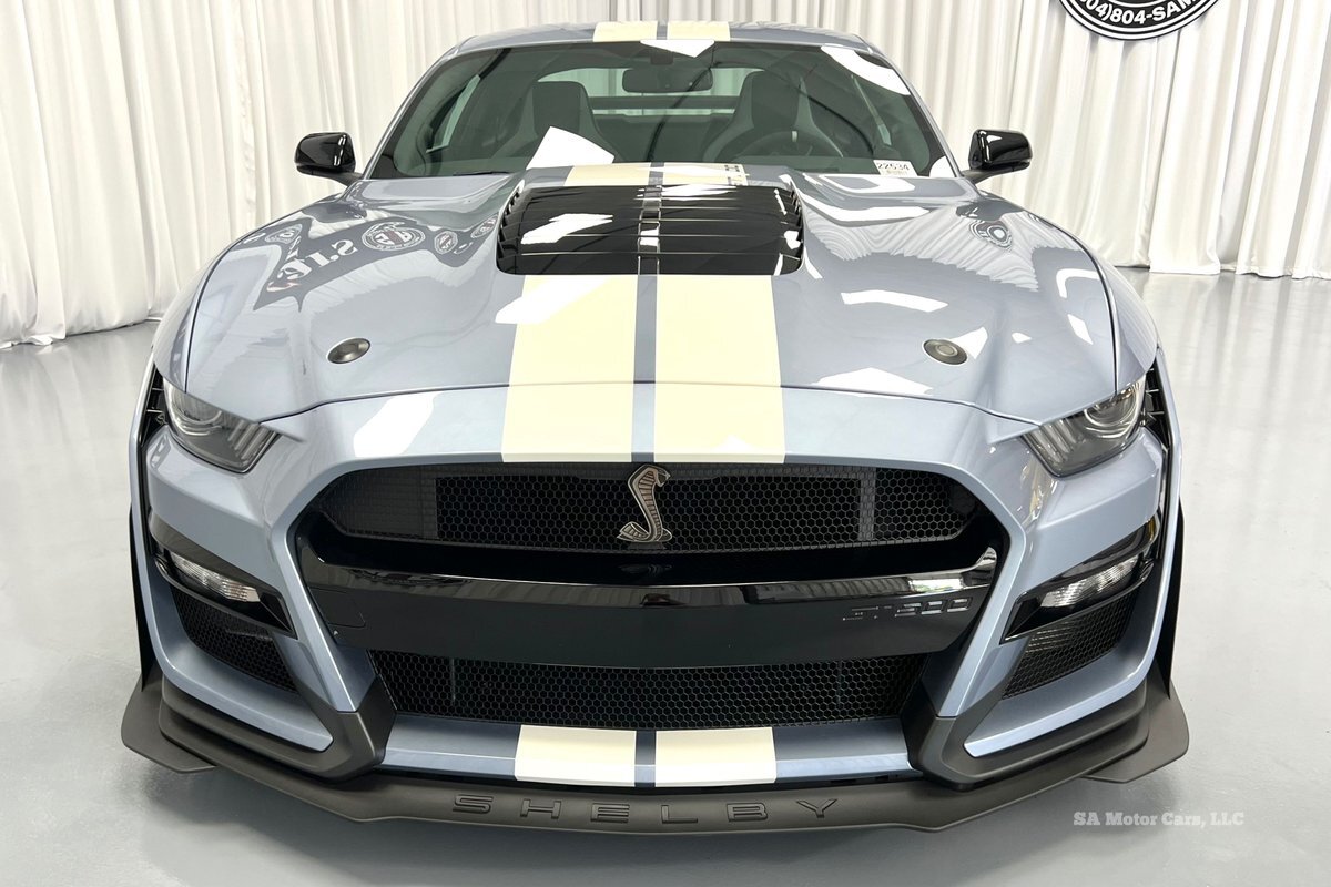 Check out this beautiful 2022 FORD MUSTANG SHELBY GT500! This GT500 is a Heritage Edition, which means that it's FULLY loaded with options that include both the Carbon Fiber Track Pack and Technology Package! This Shelby has only 10 Miles and it's sporting Brittany Blue Metallic Exterior Paint, HG Painted over Wimbledon White Striping, 20" Exposed Carbon-Fiber Wheels, Exposed Carbon Fiber Track Wing, and has Active Dual Exhaust with Quad Tips!