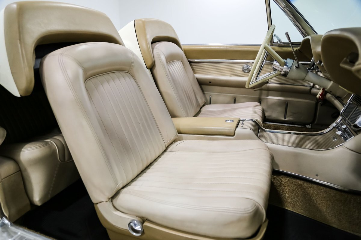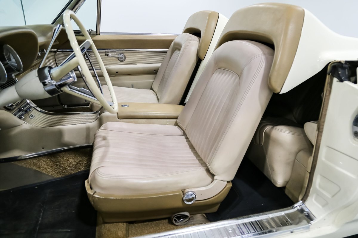 Now, let's shift our focus to its shell. Draped in a lustrous white that gleams in the sunlight, it's like looking at a cloud with serious attitude. Inside, you'll find a tan haven, crafted in leather, with bucket seats that beckon you to slide in and grip that Swingaway steering wheel. And if you're the type who digs aesthetics combined with rare lineage, then the 48-spoke Kelsey Hayes wire wheels set against those wide whites will set your heart racing.