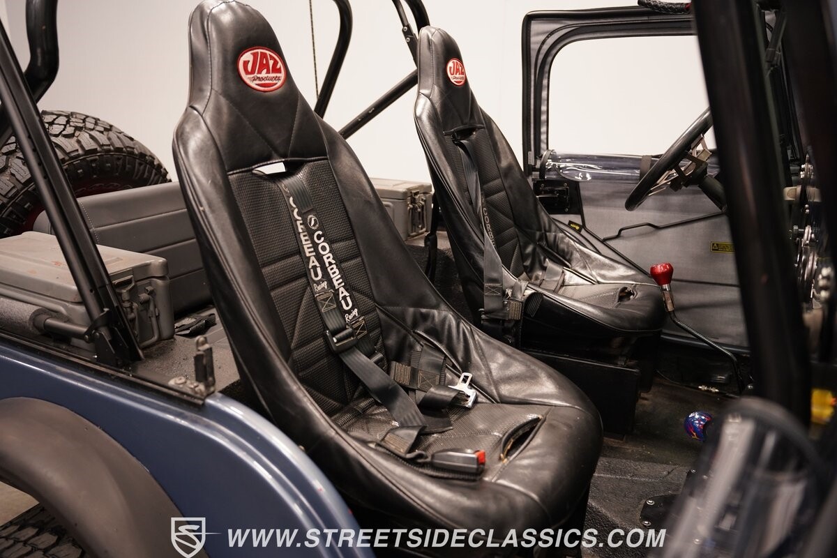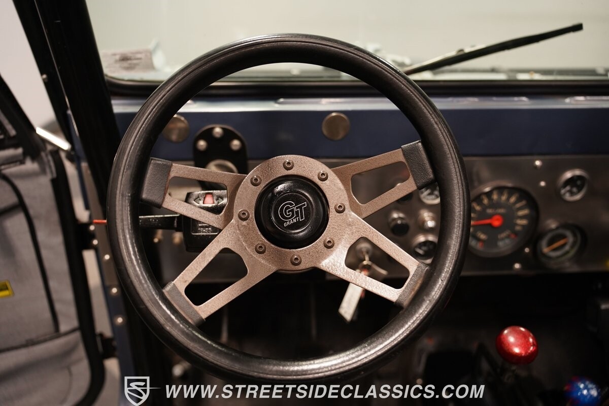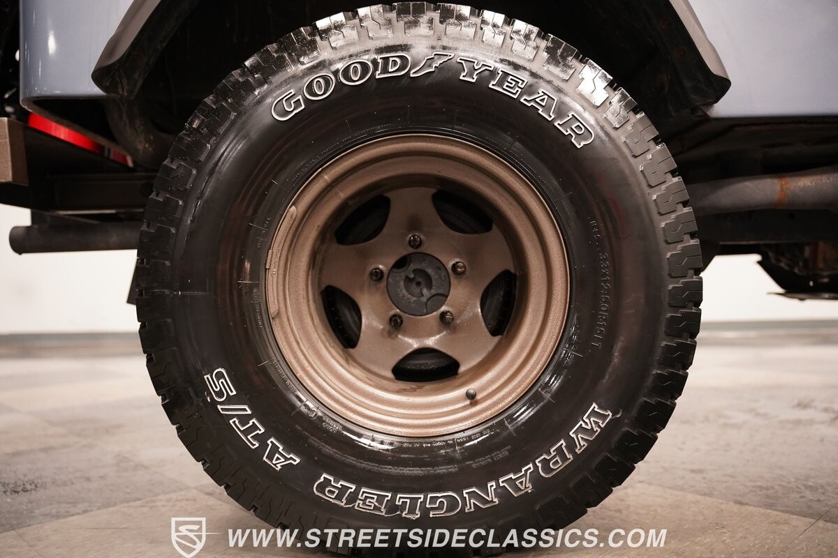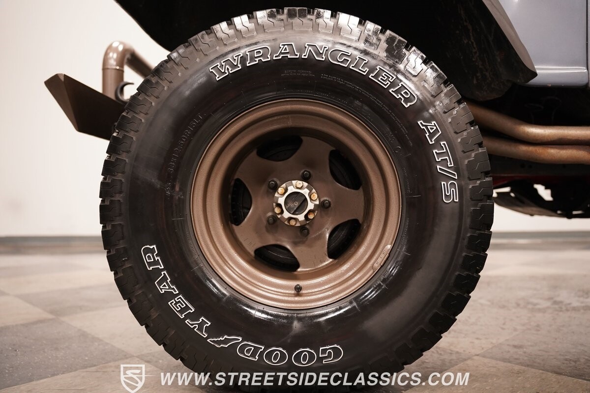 This 1974 Jeep CJ5 is the rugged, no-nonsense companion you've been seeking for your off-road adventures. Cloaked in a utilitarian gray that broadcasts its readiness for the wild, fiberglass body is accented with matte black fender flares, while the stance is elevated by imposing 33" tires. A heavy-duty front bumper with a push bar, coupled with a Warn 9k lb winch, and the unique brown wrinkle paint on the bumpers and wheels, amplify its exterior toughness.