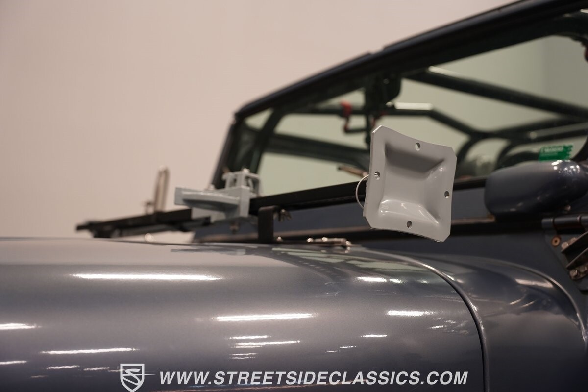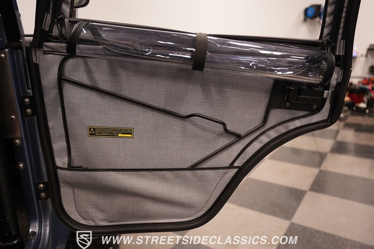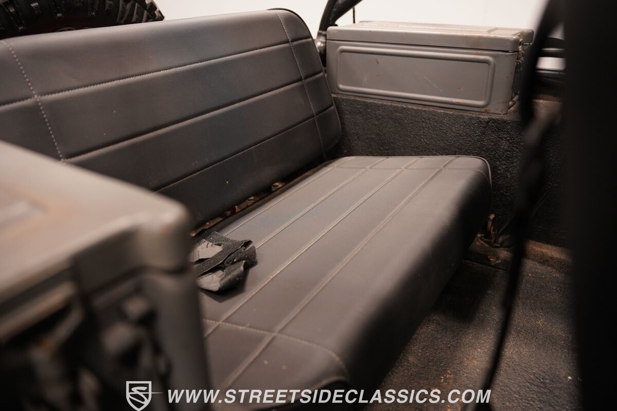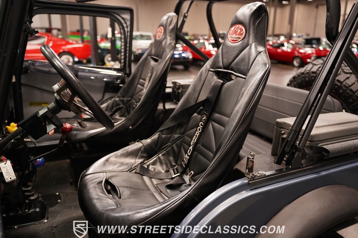 This 1974 Jeep CJ5 is the rugged, no-nonsense companion you've been seeking for your off-road adventures. Cloaked in a utilitarian gray that broadcasts its readiness for the wild, fiberglass body is accented with matte black fender flares, while the stance is elevated by imposing 33" tires. A heavy-duty front bumper with a push bar, coupled with a Warn 9k lb winch, and the unique brown wrinkle paint on the bumpers and wheels, amplify its exterior toughness.