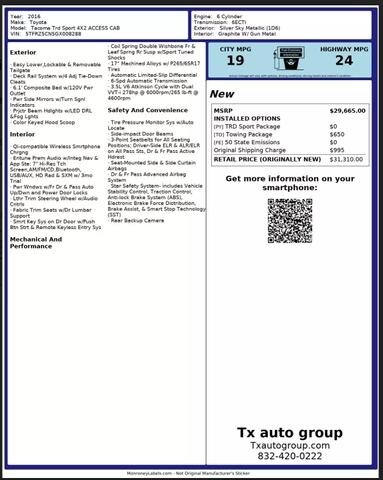 Have a look at this Extra Clean, Accident Free, Adult Owned, Serviced, & Non Smoker 2016 Toyota Tacoma TRD Sport 4X2 Access Cab Pickup Truck with Silver Sky Metallic Exterior Paint over Graphite w/Gun Metal Cloth Interior Upholstery. This Truck is Equipped with a 278 Horsepower 3.5L V6 Engine Coupled with 6-Speed Automatic Transmission.