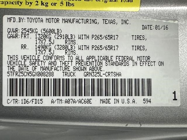 This Truck has all the Standard Equipments & more: TRD Sport Package, Towing Package ($650), 50 State Emissions, Wireless Smartphone Charing, 7' High Resolution Radio w/Entune Premium Audio w/Navigation System, Bluetooth Connection, Smart Key System w/Push Botton Start & Remote Keyless Entry System, & much more...
