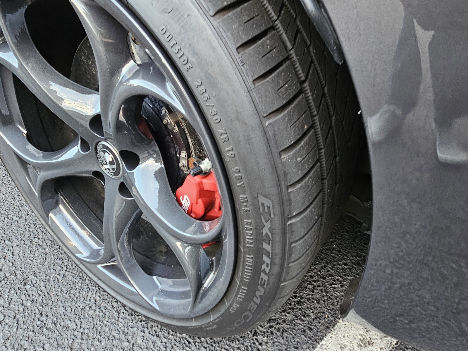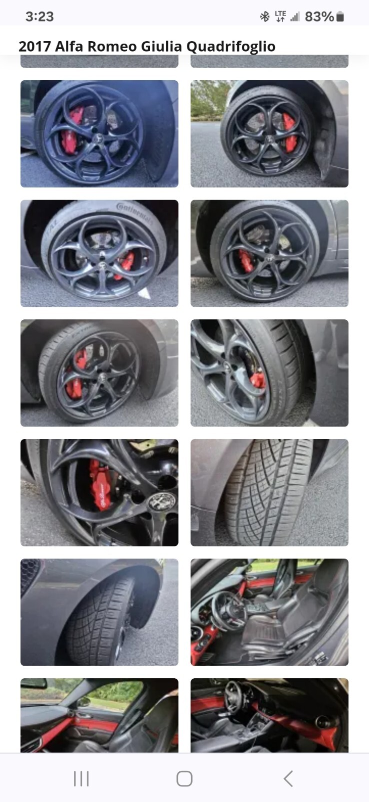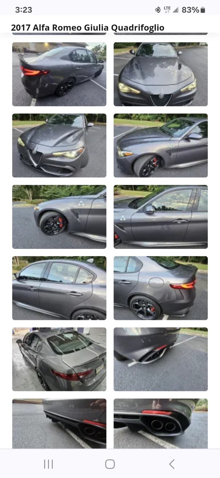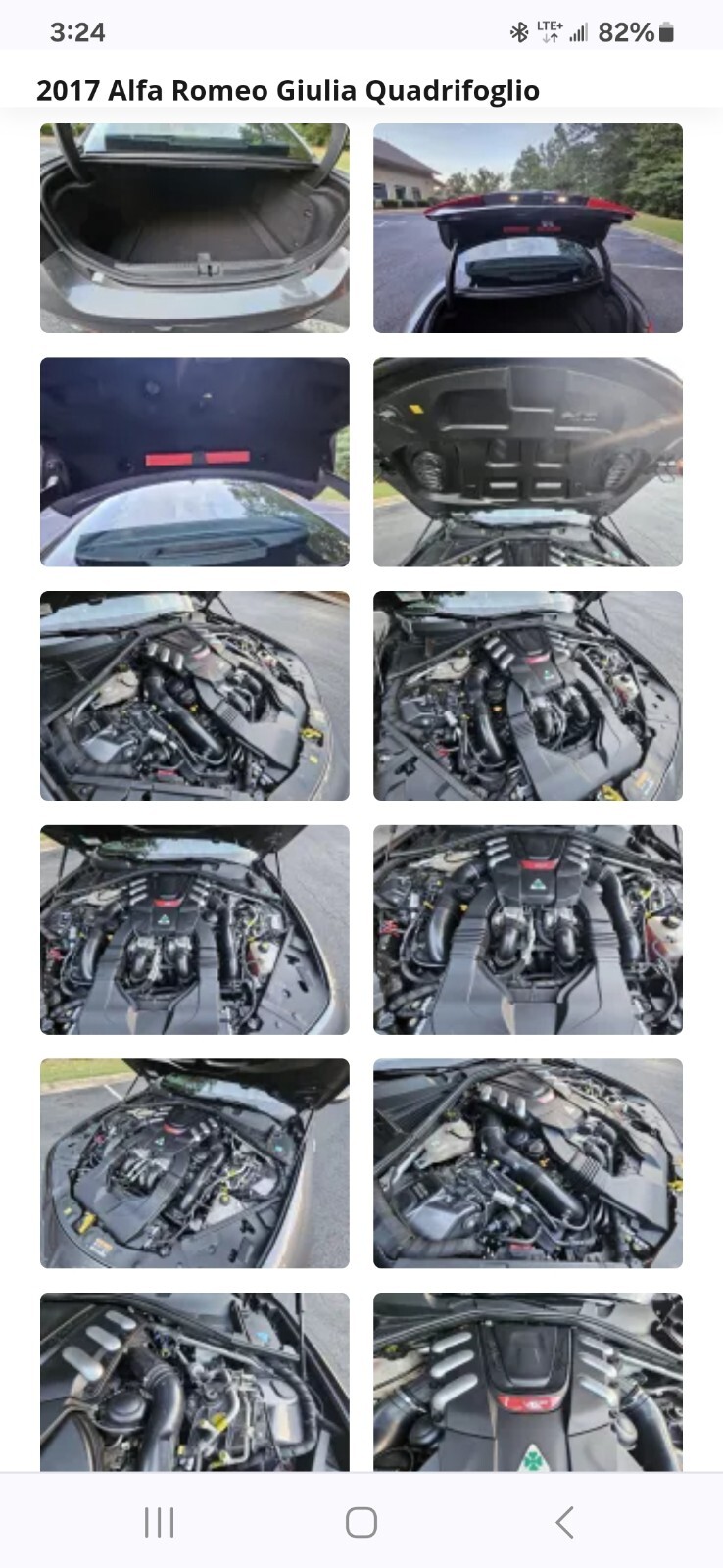 This 2017 Alfa Romeo Giulia Quadrifoglio is equipped with selected options including a Brembo carbon-ceramic brake system, Sparco frontracing seats, a carbon-fiber-trimmed steering wheel, a Harman Kardon premium sound system, and the Driver Assist Dynamic Package. It is finished in Vesuvio Gray Metallic over black leather and Alcantara and is powered by a twin-turbocharged 2.9-liter V6 paired with an eight-speed automatic transmission. Other equipment includes a dual-mode exhaust system, 19? alloy wheels, active suspension, an active front splitter, and a carbon-fiber roof, hood, and trim elements along with a rearview camera, navigation, and aluminum paddle shifters. Vehicle now has a little over 50k miles. see window window sticker with options. Carfax reported there was a accident but was a mere scrape when parked and another vehicle while driving gently scraped rear bumper that was professionally fixed at dealership with the rear bumper cover being replaced, Vehicle has a clean Georgia title in the original owner’s name. The car is finished in Vesuvio Gray Metallic and features a carbon-fiber active aero front splitter, carbon-fiber hood, roof, rear spoiler, and rocker panel accents. Additional exterior details include bi-xenon headlights with washers, rain-sensing wipers, parking sensors, Quadrifoglio badging, a rear view camera, LED brake lights, quadruple exhaust outlets, and a rear diffuser.Close-up photos of the paint condition are provided in the gallery below. Dark-finished 19? five-hole wheels are mounted with 245/35 front and 285/30 rear Continental ExtremeContact DWS 06 Plus tires. The car rides on an active suspension with three selectable modes, and stopping power is provided by Brembo carbon-ceramic brakes with red calipers. Manually adjustable Sparco front racing seats with carbon-fiber backs are trimmed in black leather and Alcantara and feature contrasting red stitching as well as embossed Alfa Romeo crests on the headrests. Carbon-fiber and red leather trim accent the cabin, and additional appointments include dual-zone automatic climate control, remote start,aluminum paddle shifters and pedals, a Harman Kardon premium sound system, navigation, and an 8.8? infotainment display. The steering wheel is trimmed in leather, Alcantara, and carbon fiber, and it fronts a 200-mph speedometer, a tachometer, and supplementary gauges as well as a central information display. The Driver Assist Dynamic Package added adaptive cruise control, lane departure warning, and automatic high-beam headlamp control.The twin-turbocharged 2.9-liter V6 produced a factory-rated 505 horsepower and 443 lb-ft of torque Power is sent to the rear wheels through a carbon-fiber drive shaft, an eight-speed automatic transmission, and a torque-vectoring differential. An oil change was performed in April 2024.The window sticker lists initial delivery to Jim Ellis Alfa Romeo of Atlanta, Georgia, along with factory equipment, colors, options, sticker price of $85,745