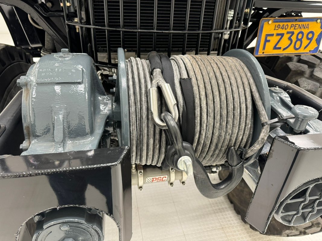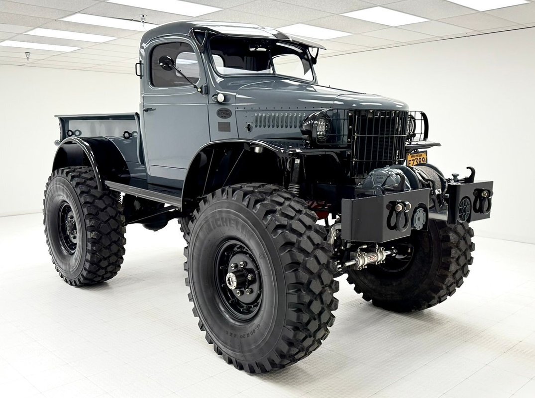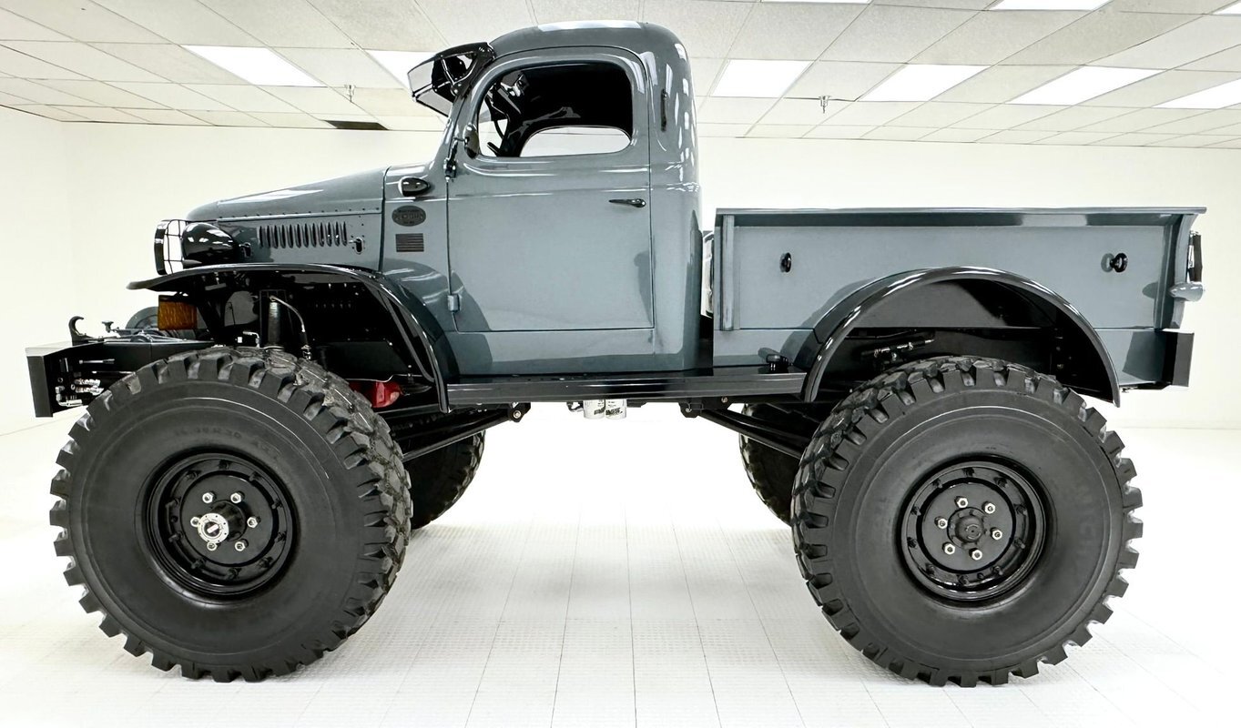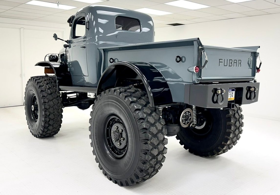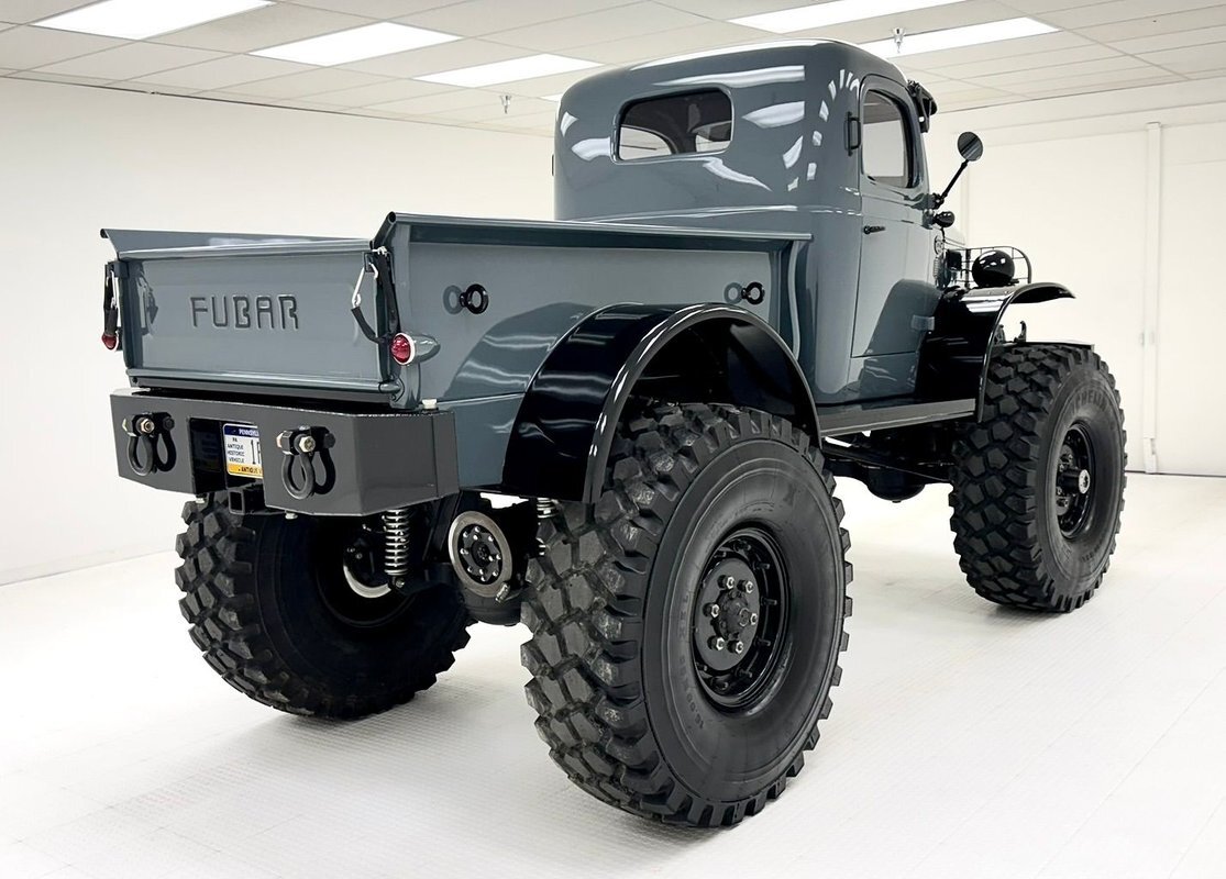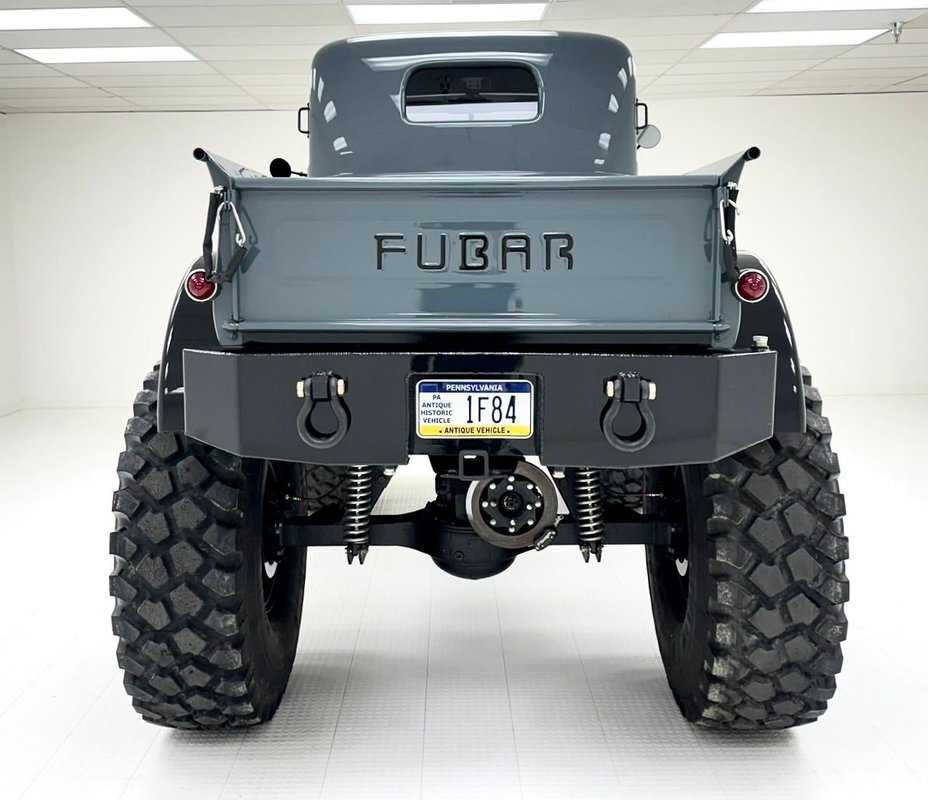 The steel bodied Dodge is elevated on 20-inch wheels and 53-inch tires connected to military 2.5 ton, (deuce and a half), axles. Bathed in glossy Battleship Gray, the truck is highlighted by black features including the custom FUBAR step boards. In front the massive custom bumper gives way to a hydraulic PTO driven variable speed Braden 20,000 pound winch with a synthetic winch cable in front of a black brush guard. LED headlights give way to custom made side hood panels, a vintage visor, and the round roofed cab. The bed, which has a black-painted diamond steel floor, was also custom fabricated and the tailgate is embossed with FUBAR in early Dodge font. Tail light housings are from a 30's Ford and contain LED lights. We note a custom rear bumper hydraulic tank out back and massive D-ring tow shackles are found on the front and back.
