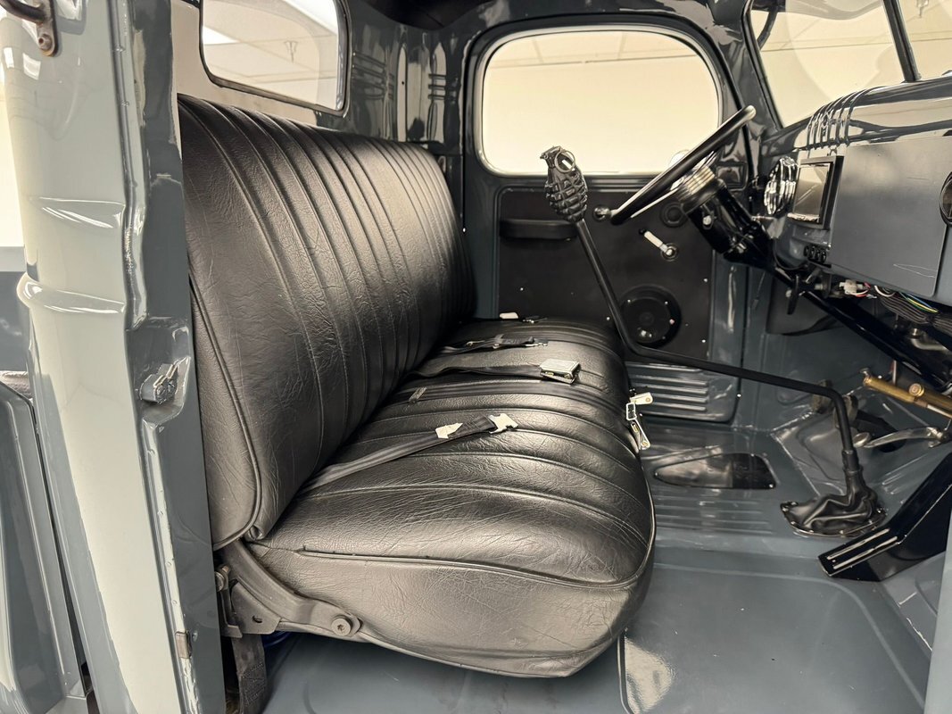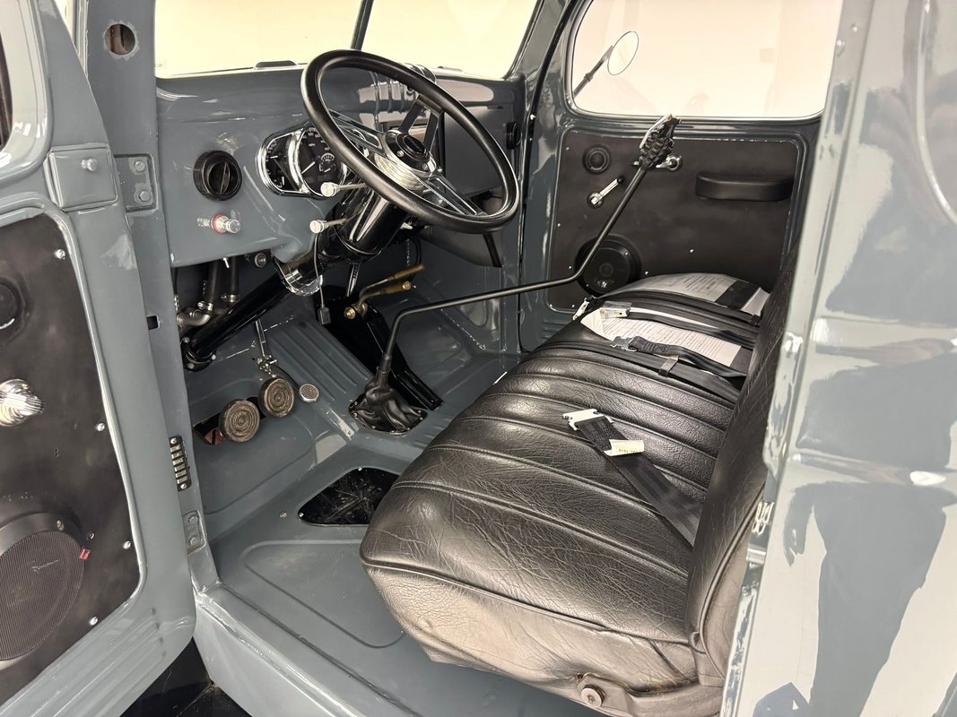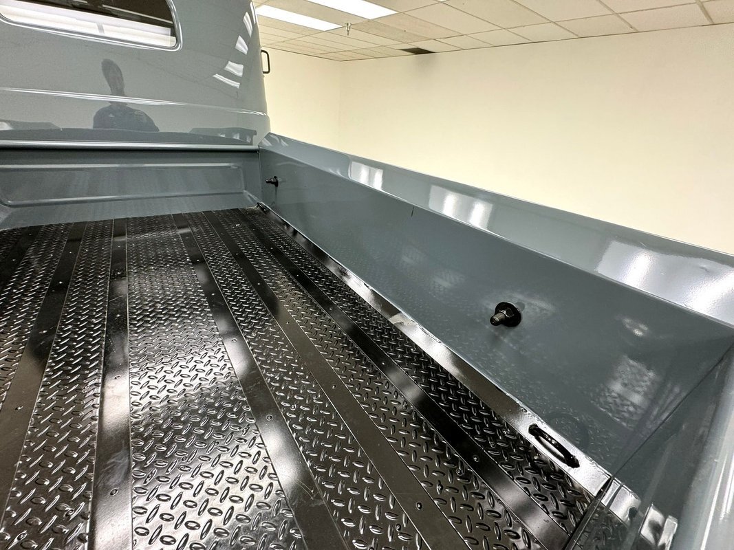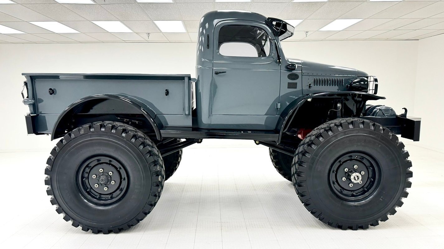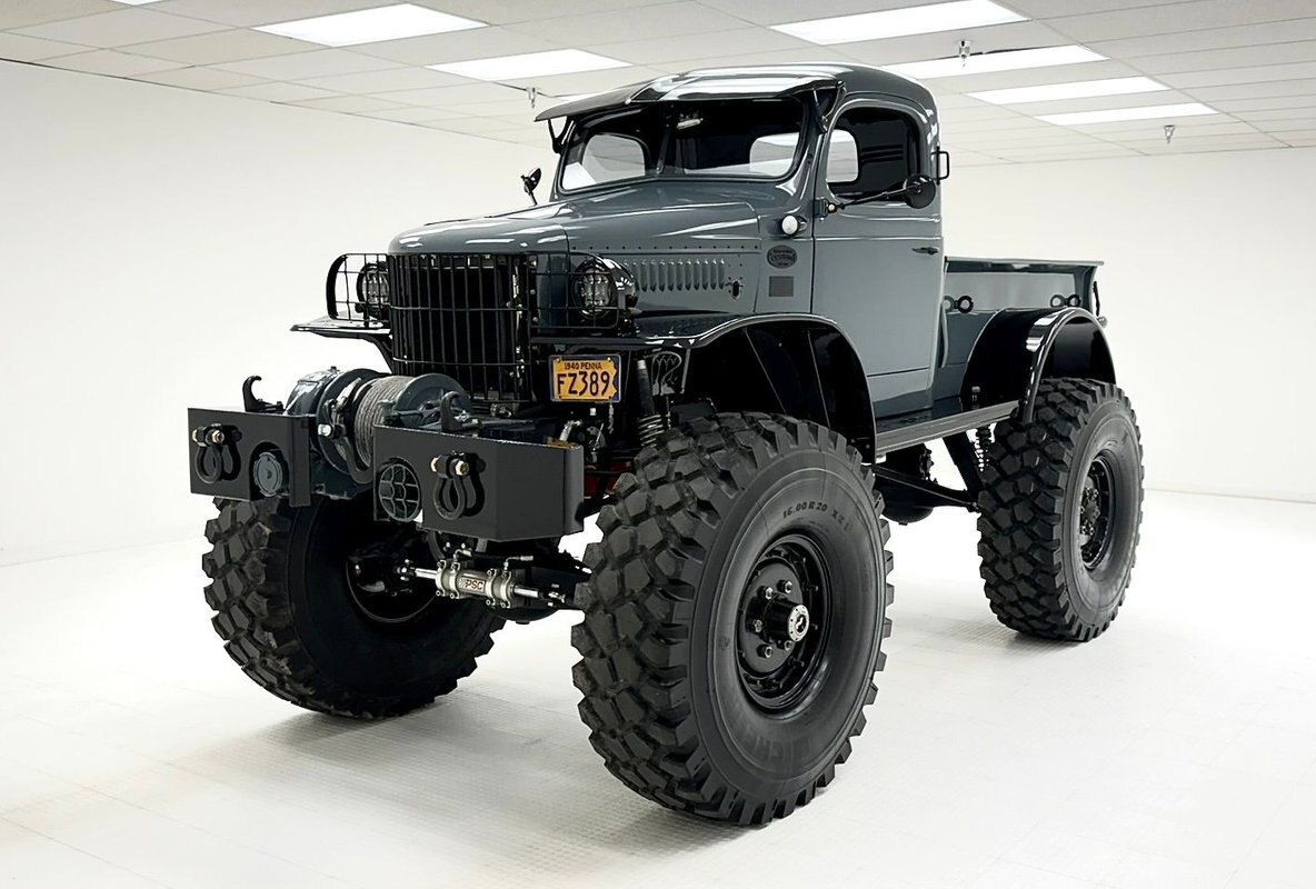 The steel bodied Dodge is elevated on 20-inch wheels and 53-inch tires connected to military 2.5 ton, (deuce and a half), axles. Bathed in glossy Battleship Gray, the truck is highlighted by black features including the custom FUBAR step boards. In front the massive custom bumper gives way to a hydraulic PTO driven variable speed Braden 20,000 pound winch with a synthetic winch cable in front of a black brush guard. LED headlights give way to custom made side hood panels, a vintage visor, and the round roofed cab. The bed, which has a black-painted diamond steel floor, was also custom fabricated and the tailgate is embossed with FUBAR in early Dodge font. Tail light housings are from a 30's Ford and contain LED lights. We note a custom rear bumper hydraulic tank out back and massive D-ring tow shackles are found on the front and back.