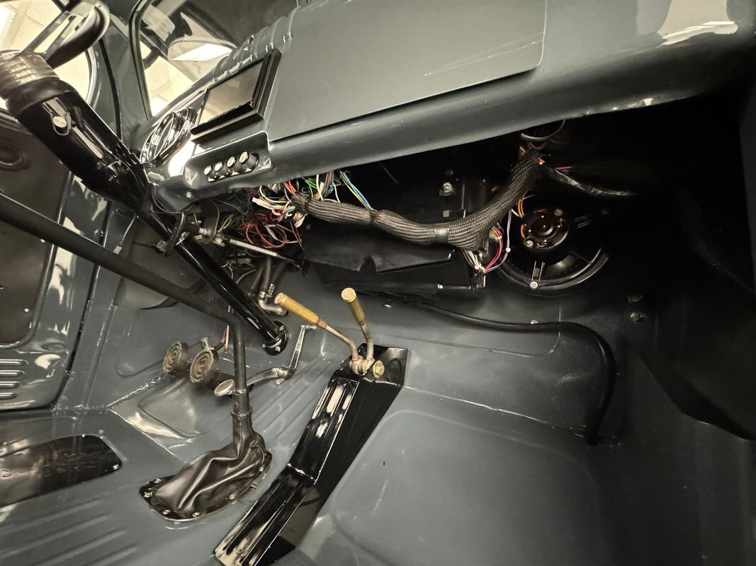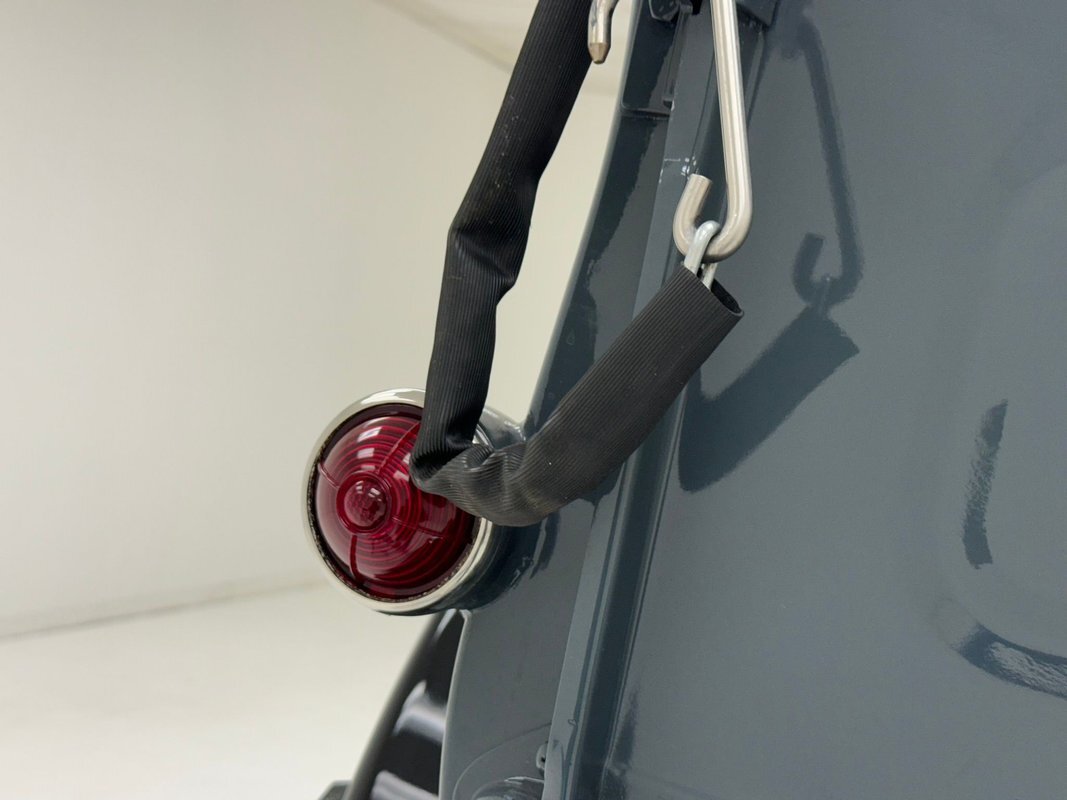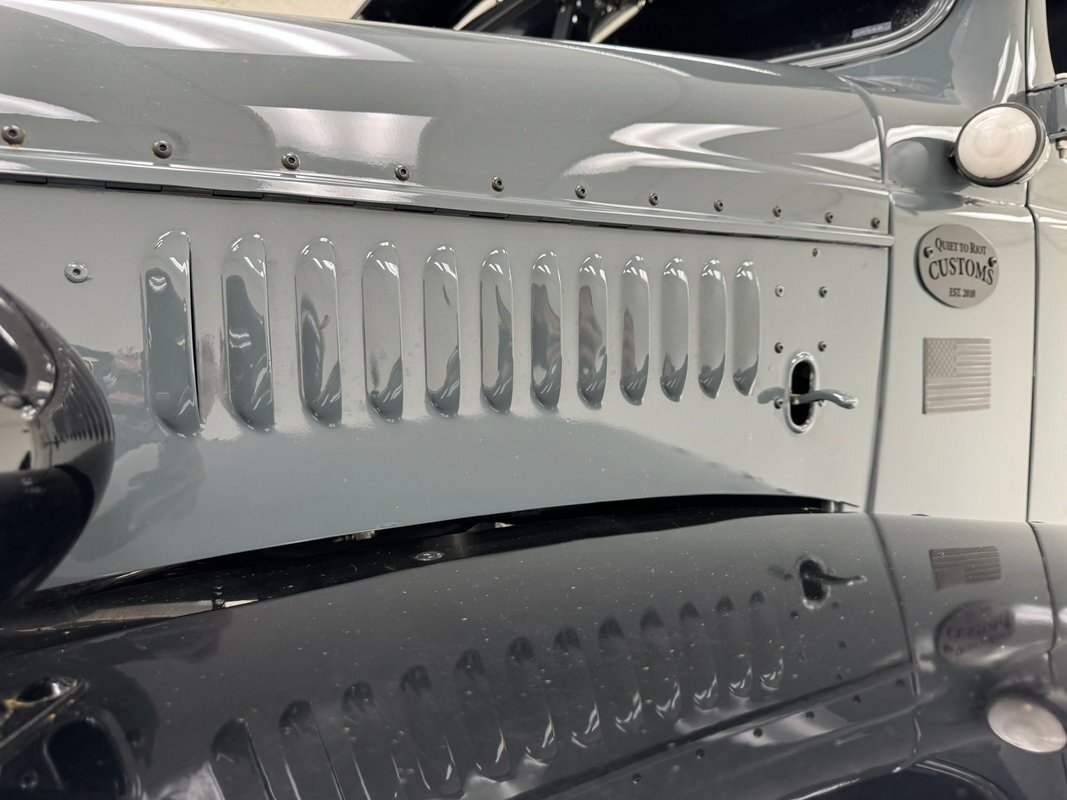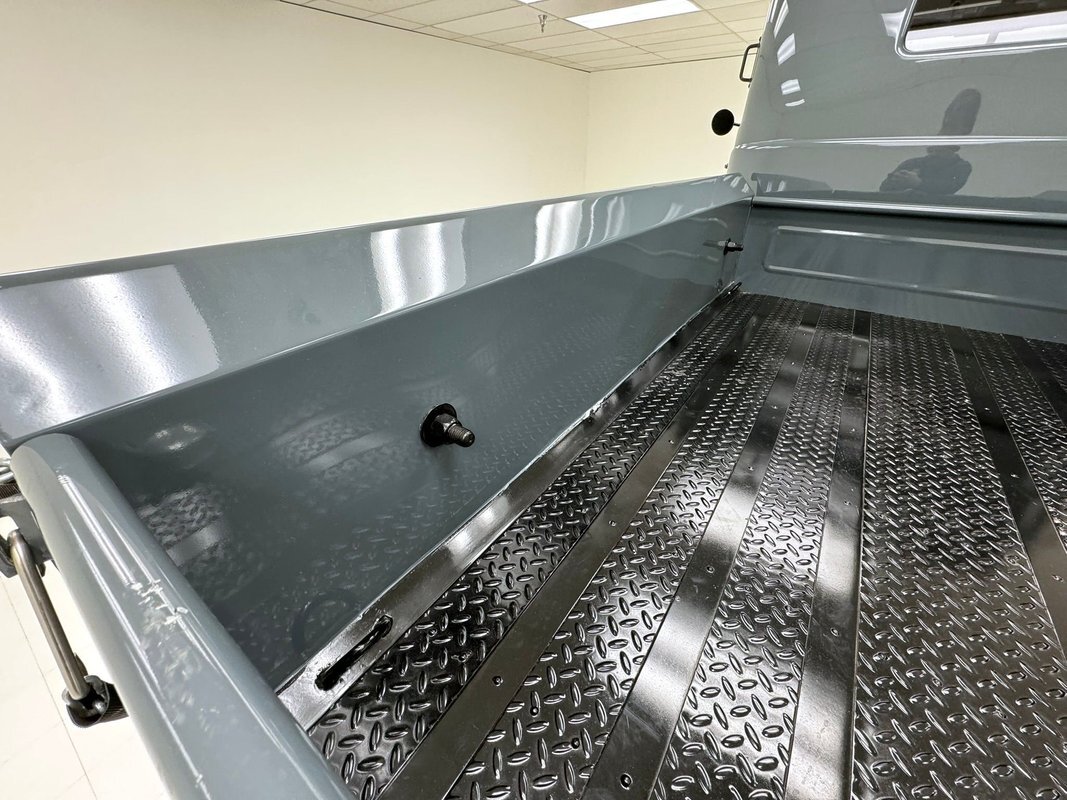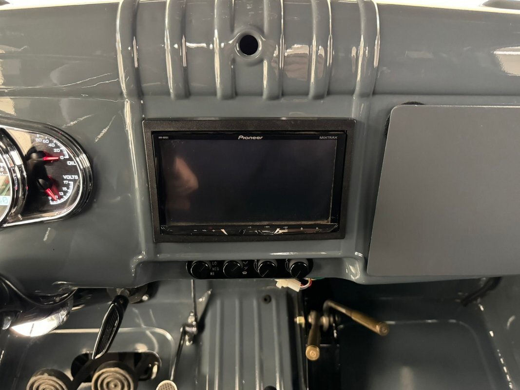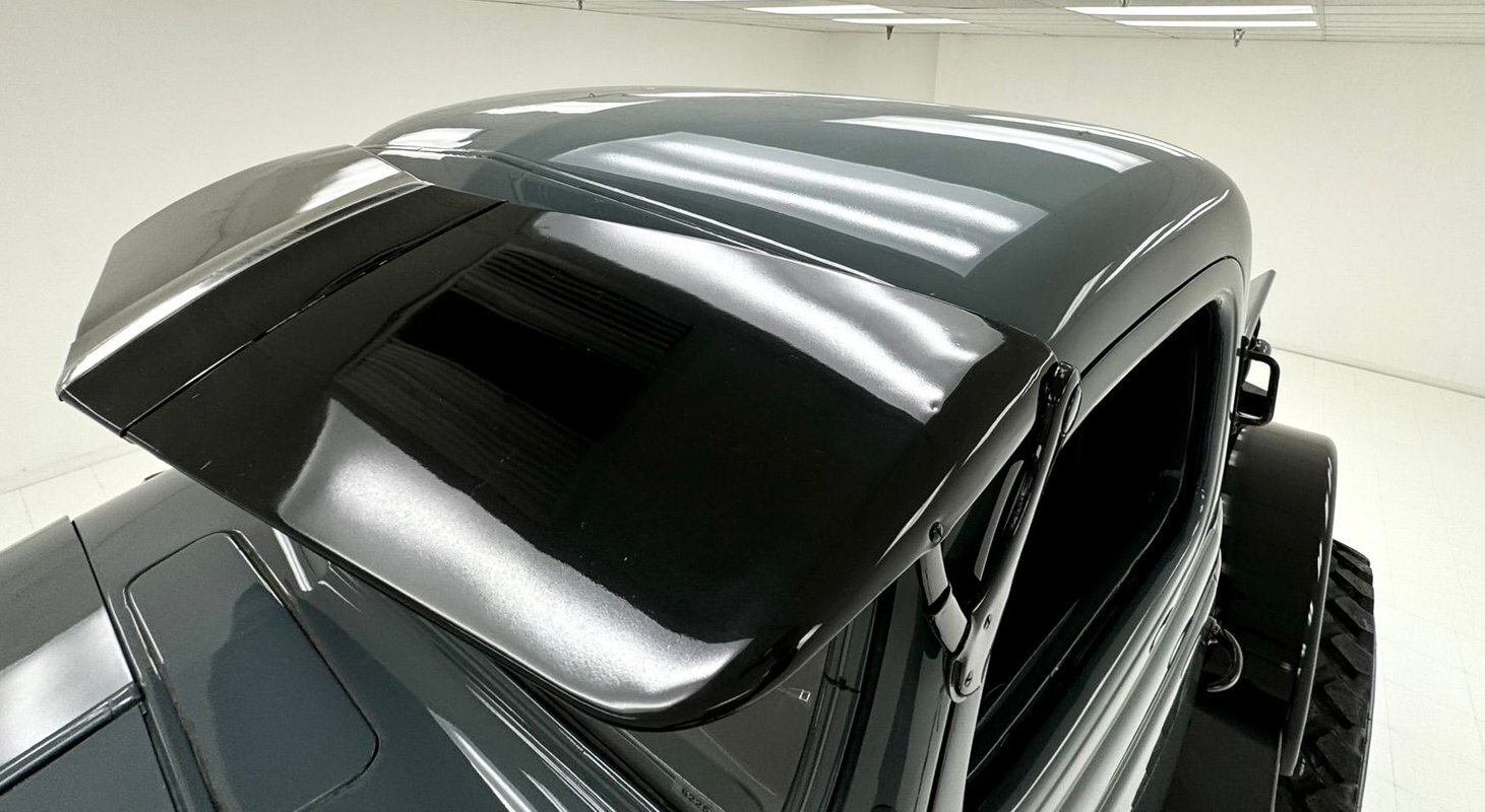 The Battleship Gray paint flows seamlessly into the interior just as the military drab green would have originally. The surfaces are not covered in plush materials or cushy padding, it retains its utilitarian appearance but with the floor having been smoothed. A black vinyl bench seat is supplied with three sets of seat belts. You can't miss the floor mounted grenade shifter handle and transfer case shifters topped with .50 caliber bullet shells. The clean fitting gauge cluster contains Dakota digital gauges, black faced and backlit. The Pioneer screen head unit leads to Fosgate speakers and a Bazooka bass tube, naturally. A painted ceiling is fronted by an overhead switch console with unmarked toggle switches and indicator lights. The side and rear windows are tinted, Vintage A/C and heat are included, and power windows have been added.