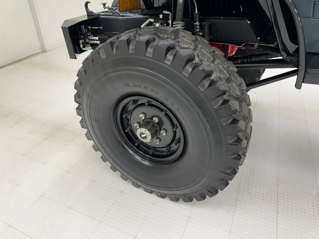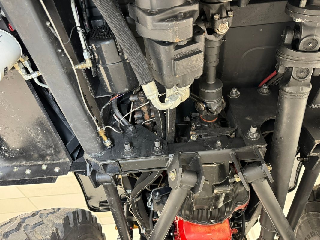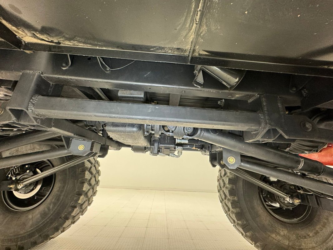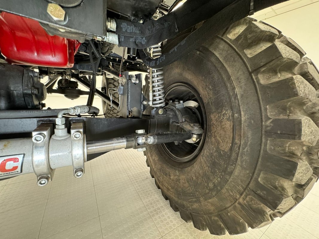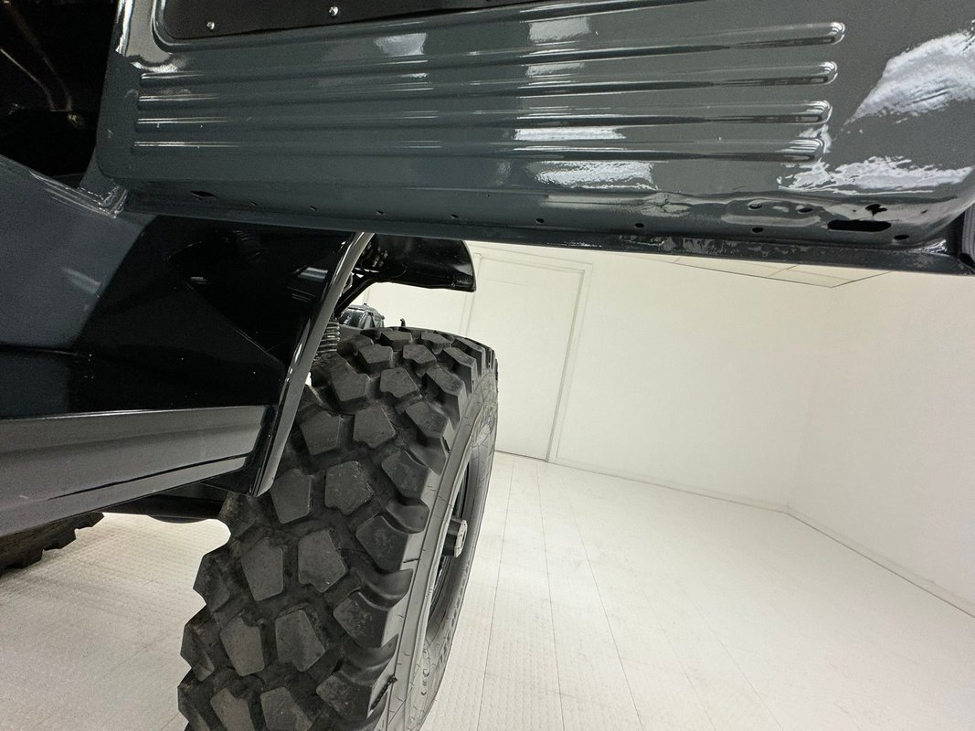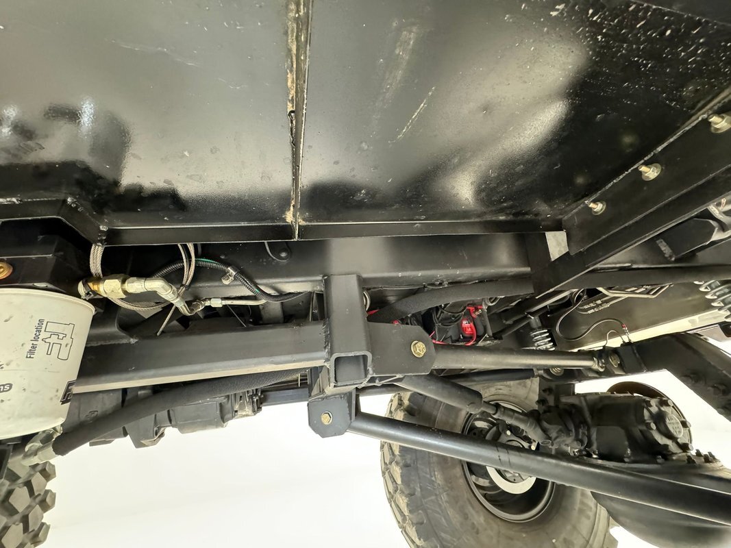 A fully rebuilt 239ci Cummins 4BT inline 4-cylinder includes compound turbochargers, hi-flow injectors, a custom ram air intercooler, and cold air induction. It is fed fuel through electronic fuel injection and connected to a T19 4-speed manual transmission with an NP205 divorced transfer case with twin-stick control. Wilwood pinion brakes are found on the front and rear as well as power disc brakes at each wheel. Power is supplied by dual Optima gel batteries. The radiator is a custom build.