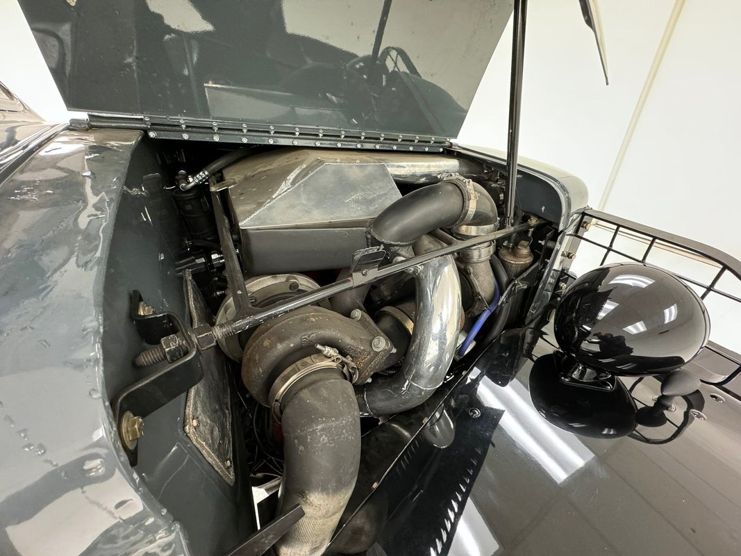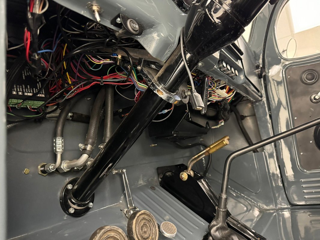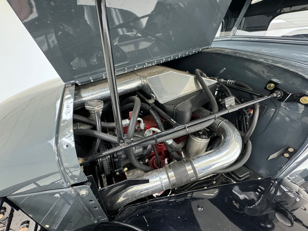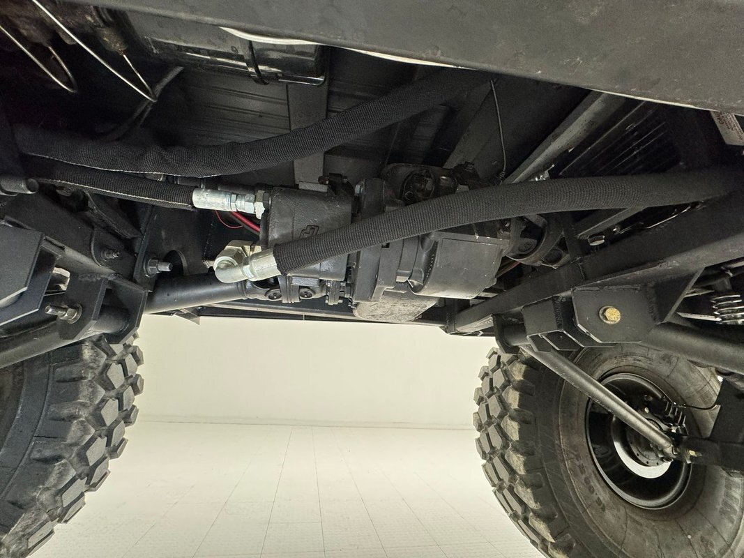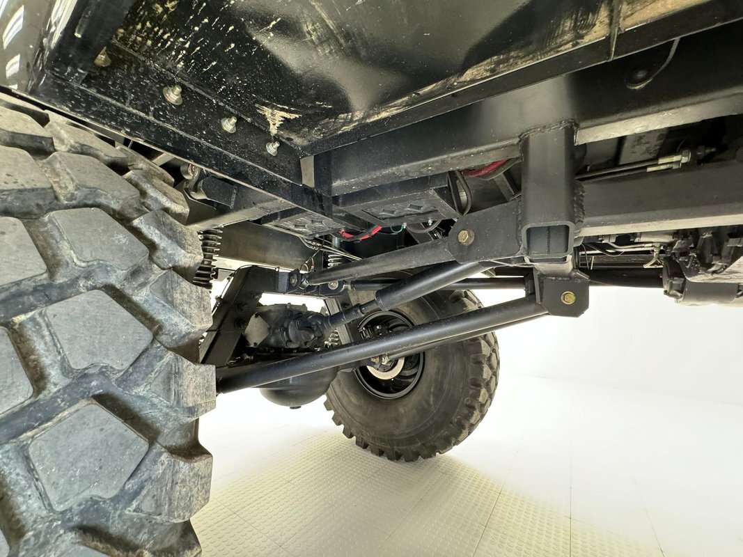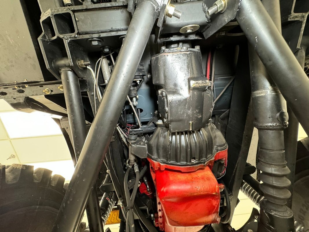 A fully rebuilt 239ci Cummins 4BT inline 4-cylinder includes compound turbochargers, hi-flow injectors, a custom ram air intercooler, and cold air induction. It is fed fuel through electronic fuel injection and connected to a T19 4-speed manual transmission with an NP205 divorced transfer case with twin-stick control. Wilwood pinion brakes are found on the front and rear as well as power disc brakes at each wheel. Power is supplied by dual Optima gel batteries. The radiator is a custom build.