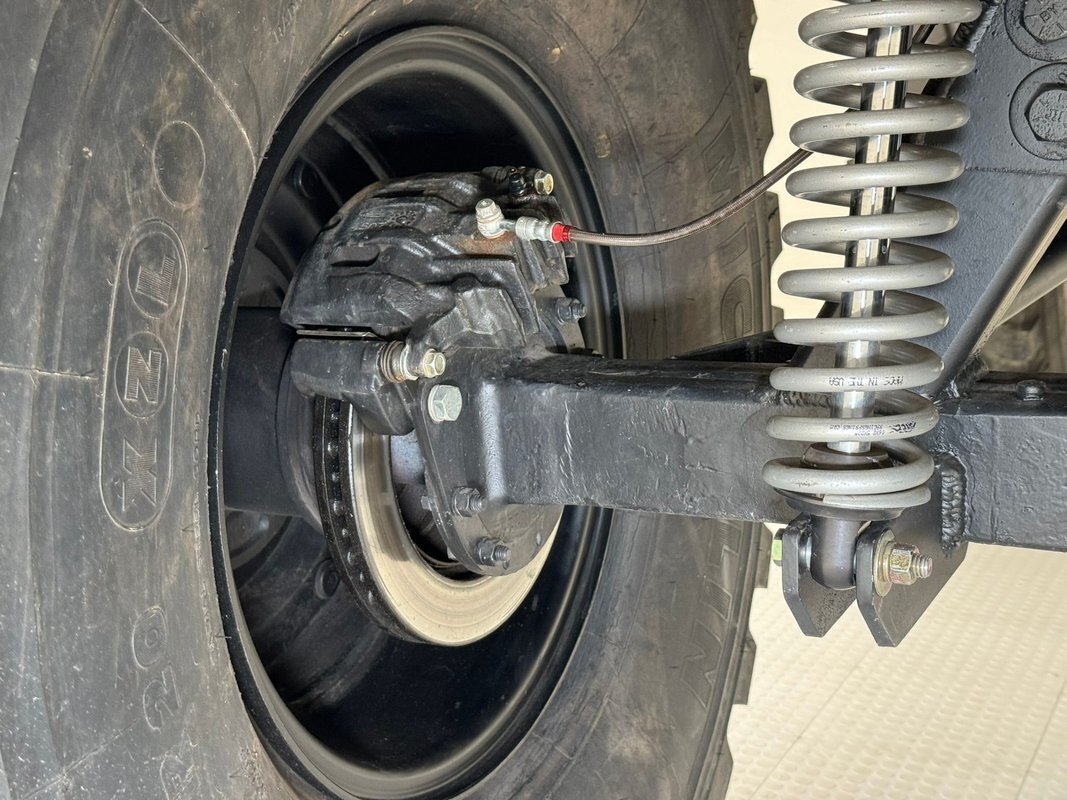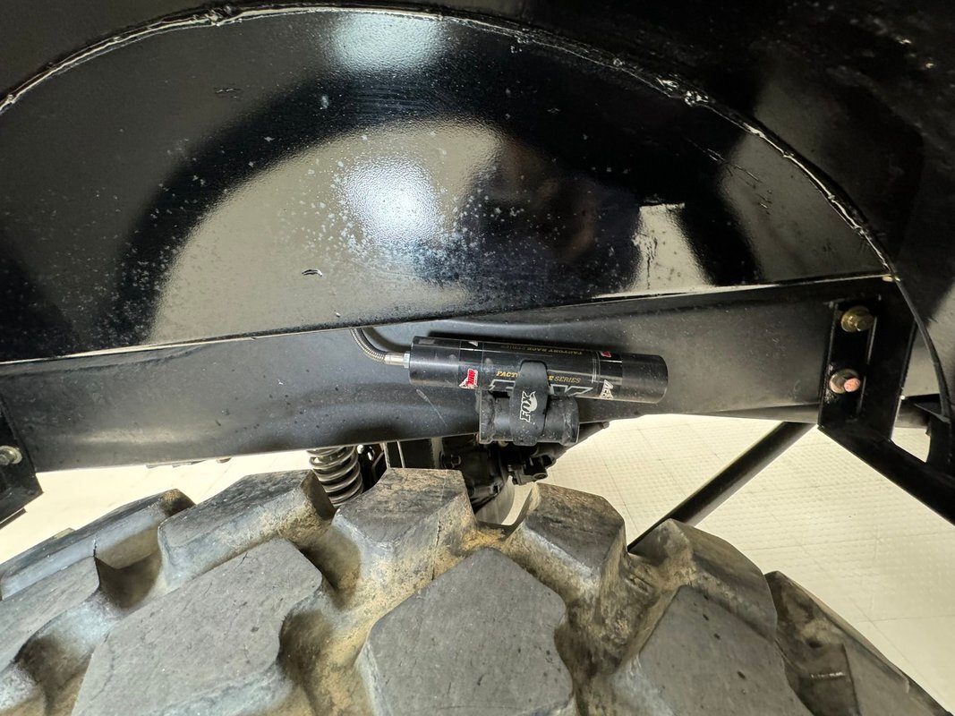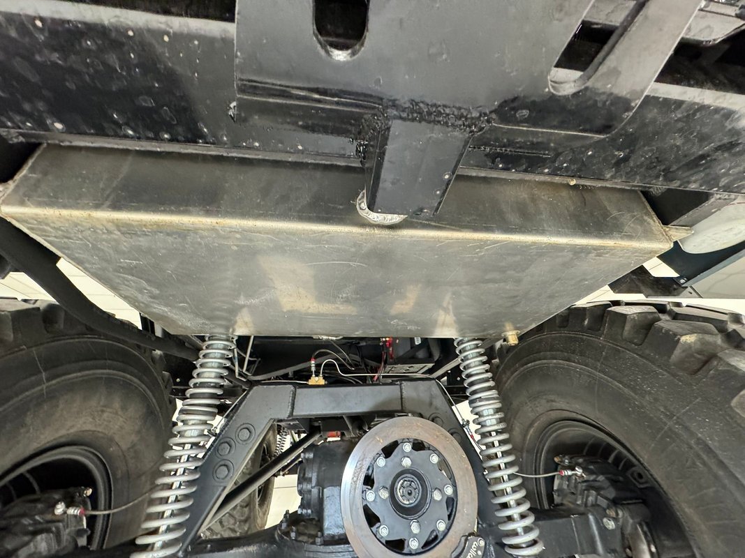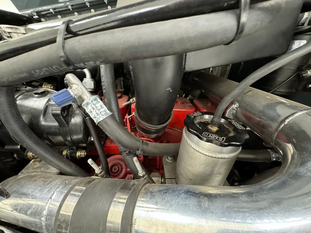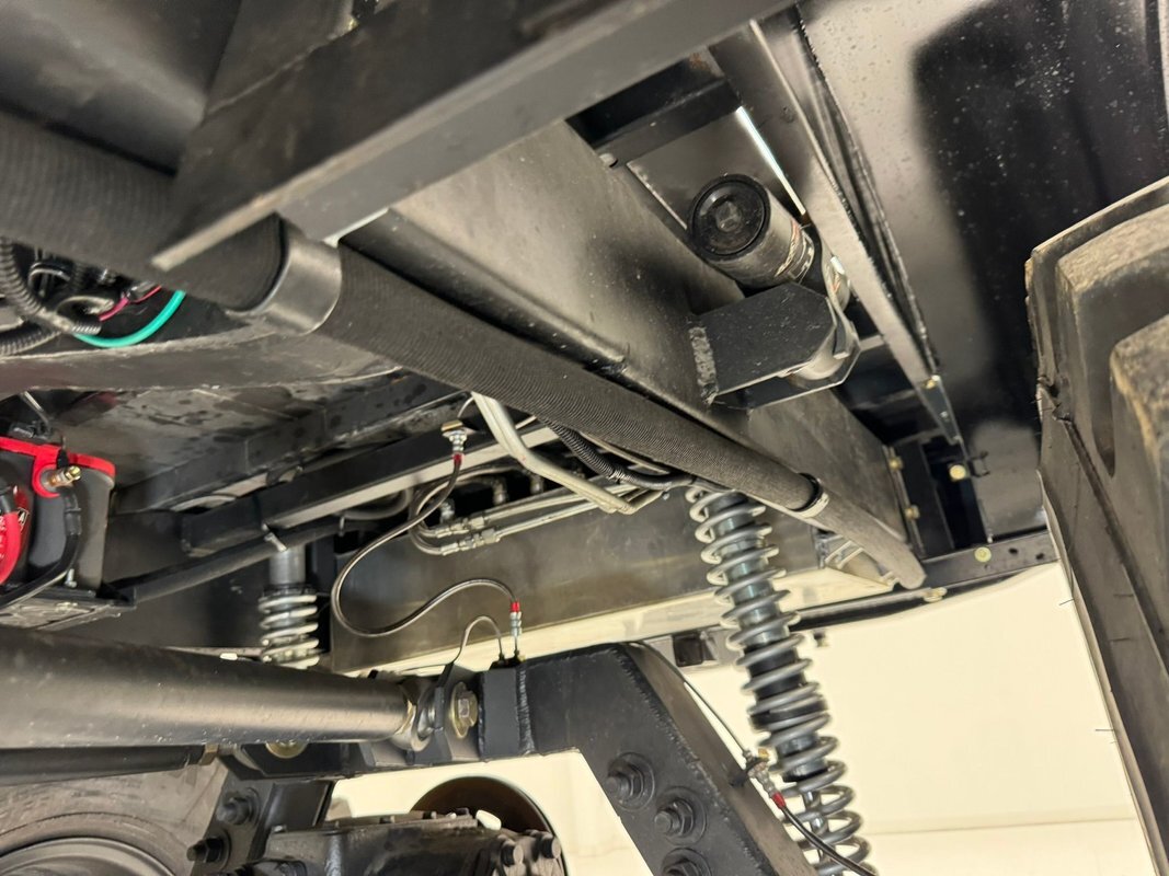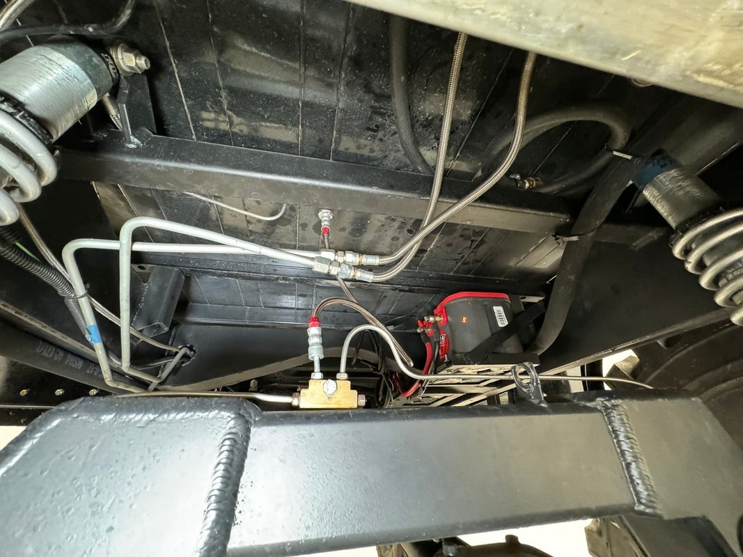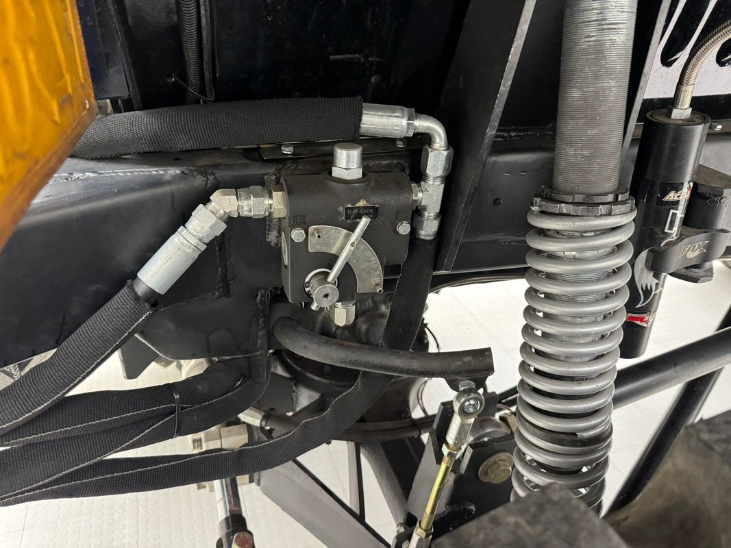 Easy access to the undercarriage is granted by the massive wheels and tires and one can practically walk under the rig. It's here we find the heavy duty 4 link suspension with Fox coil overs at each corner. A PSC hydraulic steering kit is front and center and a single exhaust emits spent diesel under the truck. The underside is spotless and serves as a clinic in mechanical and hydraulic operations.