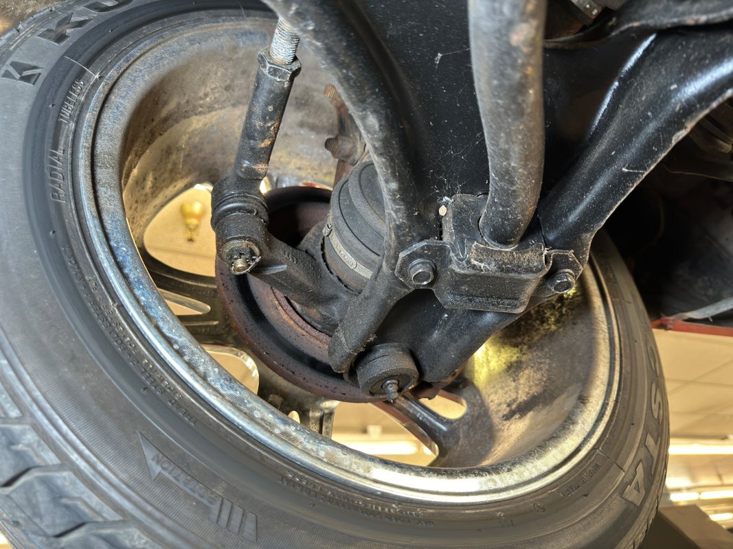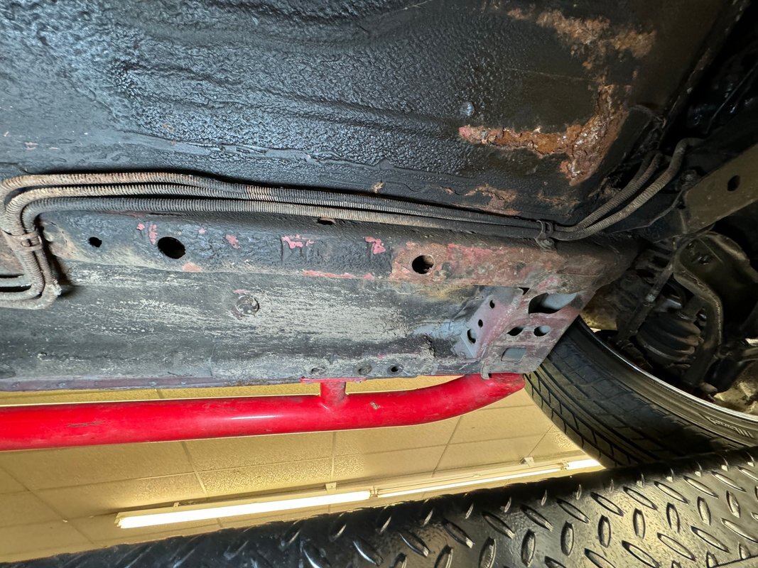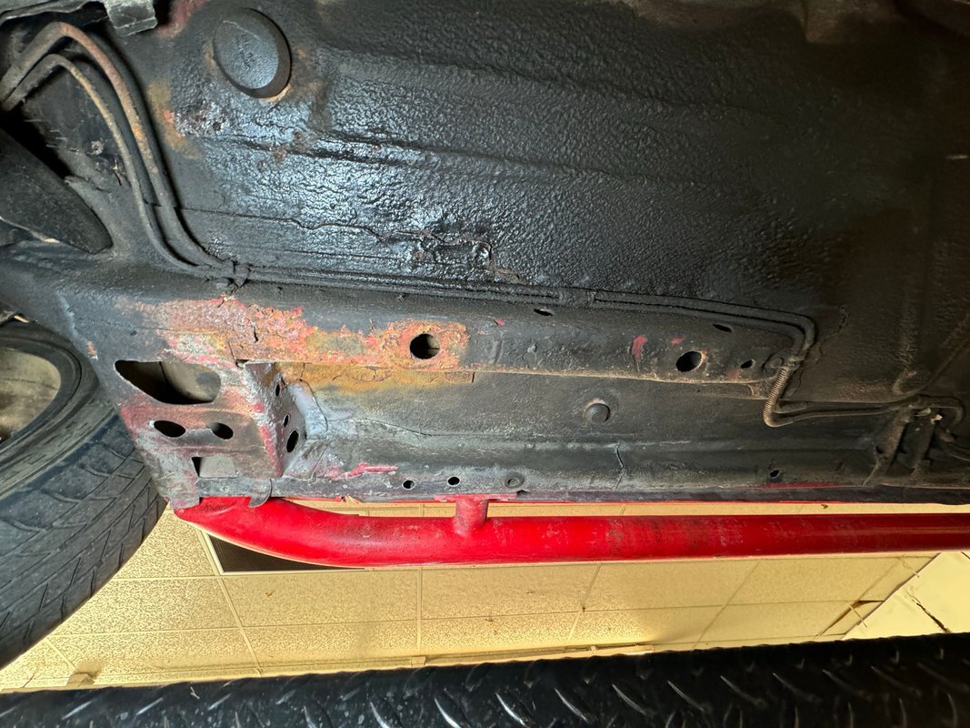 Overall, a dry underside with plenty of surface rust and some of it is pitted. There's a bit of invasive rust on a floor pan and the exhaust has some deep pitting. The single pipe goes from a stock style muffler to a Y-section that splits the tailpipes and creates the illusion of a V8 via large chrome tips. Coil struts are used in the front and leaf springs, which vary from the Omni on which the car is based, are found out back.