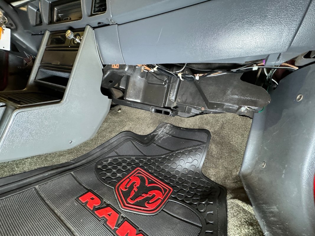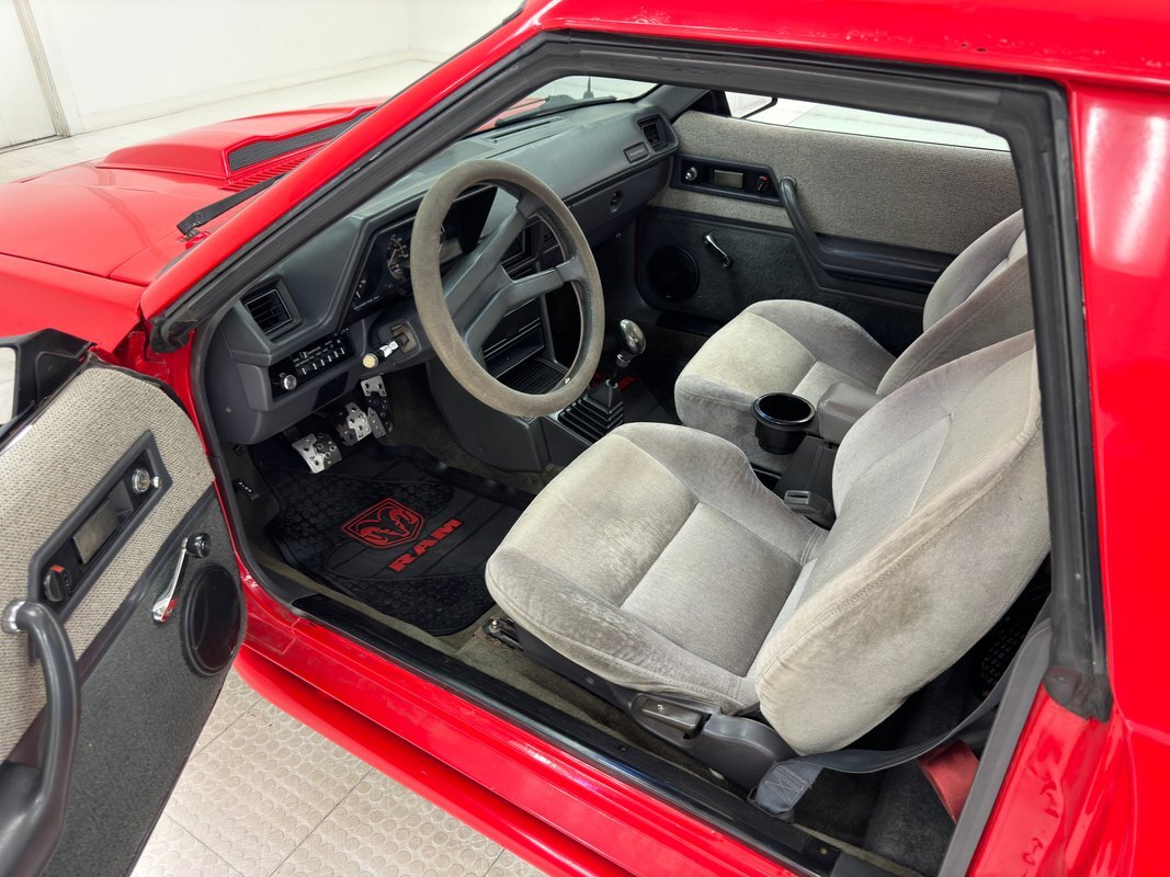 Gray tweed tops the door panels which also have rows of gray vinyl and a black carpet base in good condition. The gray cloth bucket seats are high backed and in decent condition providing some lateral support and behind them, an amp and speakers are mounted on the wall. A 4 spoke steering fronts a simple angular dashboard with three gauge behind plexiglass providing eight bits of information and the A/C push button controls live to the left of the column. An AM/FM/CD radio with removable face is in the center stack along with a storage cubby and lighter. The shifter emerges from a plastic box base with accordion style rubber boot and gray carpet covers the floor under Dodge branded rubber mats. The headliner surrounds a sunroof with red film applied to it.