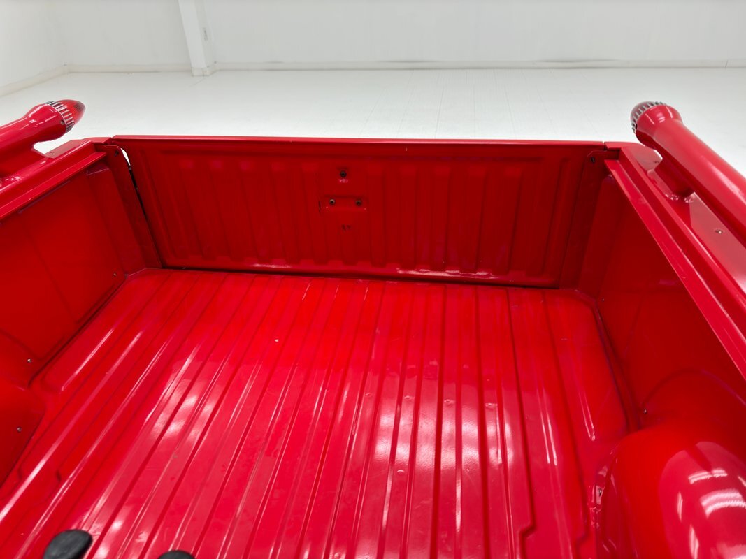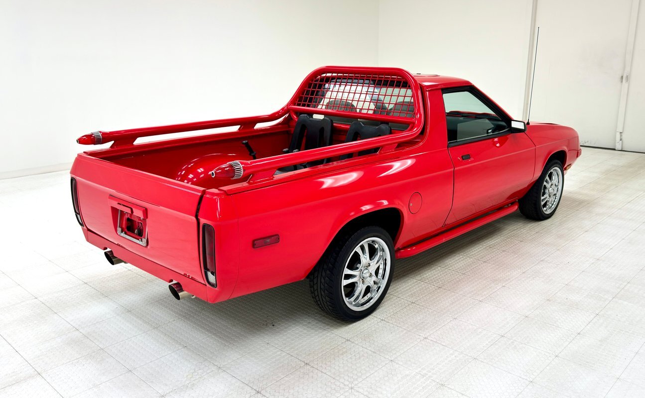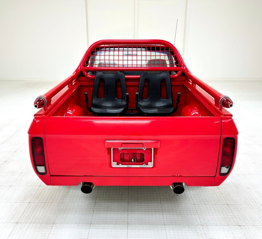 Red, and lots of it, cover the exterior of the car and everything from the nerf bar to the bed to the bar and cage around the bed wear a bright hue. An added hood bulge wears red as well and has mesh on the cowl side to simulate air intake. Perhaps the most notable features are the Eldorado-like torpedo lights at the end of the bed bar and the big dual exhaust pushing through the sculpted rear valance, hinting at perhaps a bigger engine in the bay. There are also a pair of seats in the bed, Brat style, and a cage behind the rear window to prevent cargo, and maybe craniums, from breaking the glass. 16-inch chrome wheels, looking period aftermarket, are rocking 195/50R16 tires with plenty of room to spare in the wells. The bed is red and clean and panel gaps are mostly well minded with a little misalignment on the tailgate. Other imperfections include invasive rust on the quarter panels and door corners, bubbling on others, chips and missing paint, and bubbling and invasive rust on the roof near the rain rail.