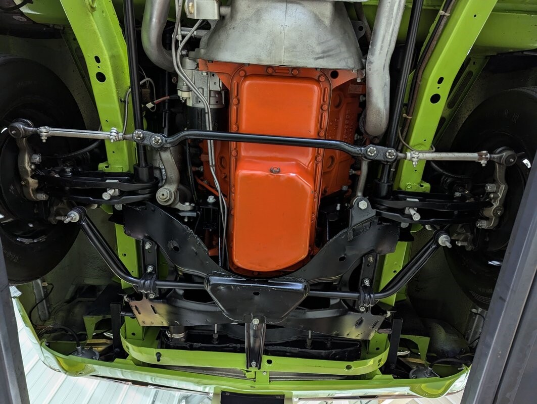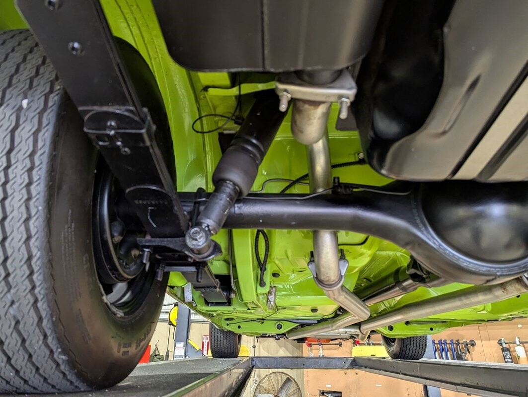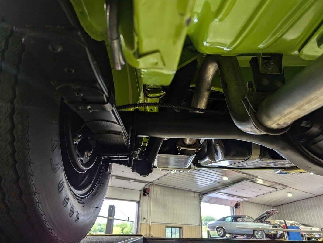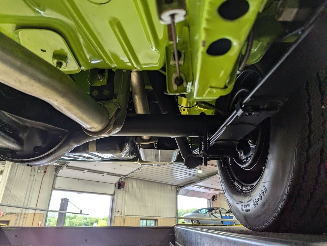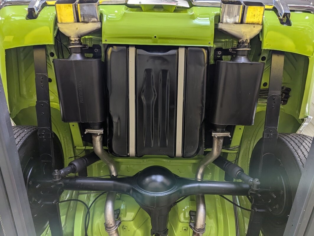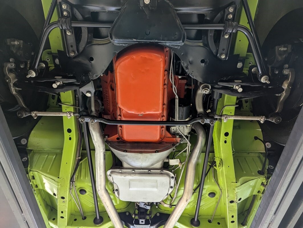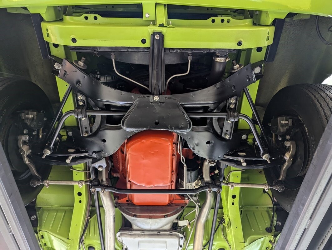 UNDERSIDE: Wow, this is highly detailed underneath! It was flipped on a rotisserie; every component was removed. It has all clean frame rails, floors, rockers etc. painted a gloss sublime green. All the suspension and steering was completely rebuilt. It has the correct factory type dual exhaust system with the square tips going through the valance. The fuel system was replaced including the tank. The brakes were completely rebuilt, lines replaced, e-brake is hooked, up it has disc in front. Looking up at the motor it is spotless, the VIN number by the oil pan matches the car. It also has a VIN number matching 727 Torqueflite automatic trans, it was restored. The drive shaft was rebuilt, and it's hooked to an 8 3/4 rear with 3.23 Sure Grip gears.