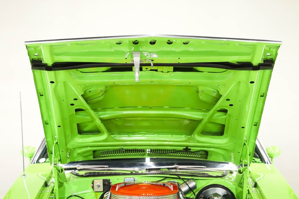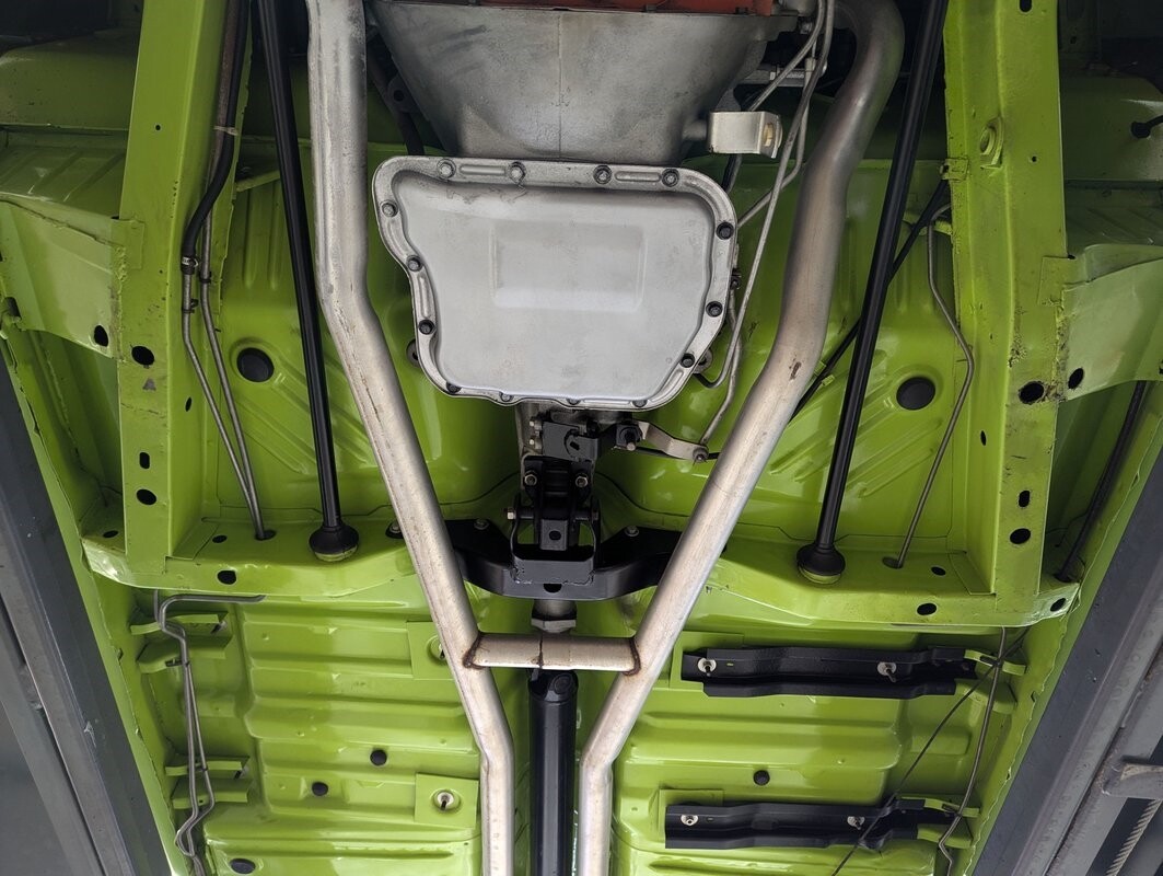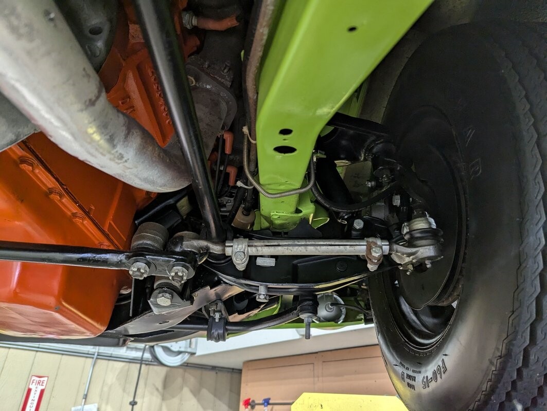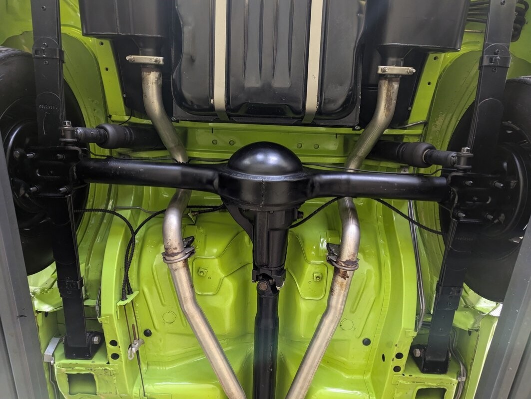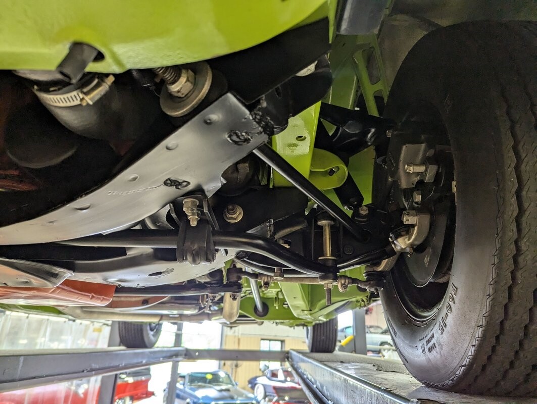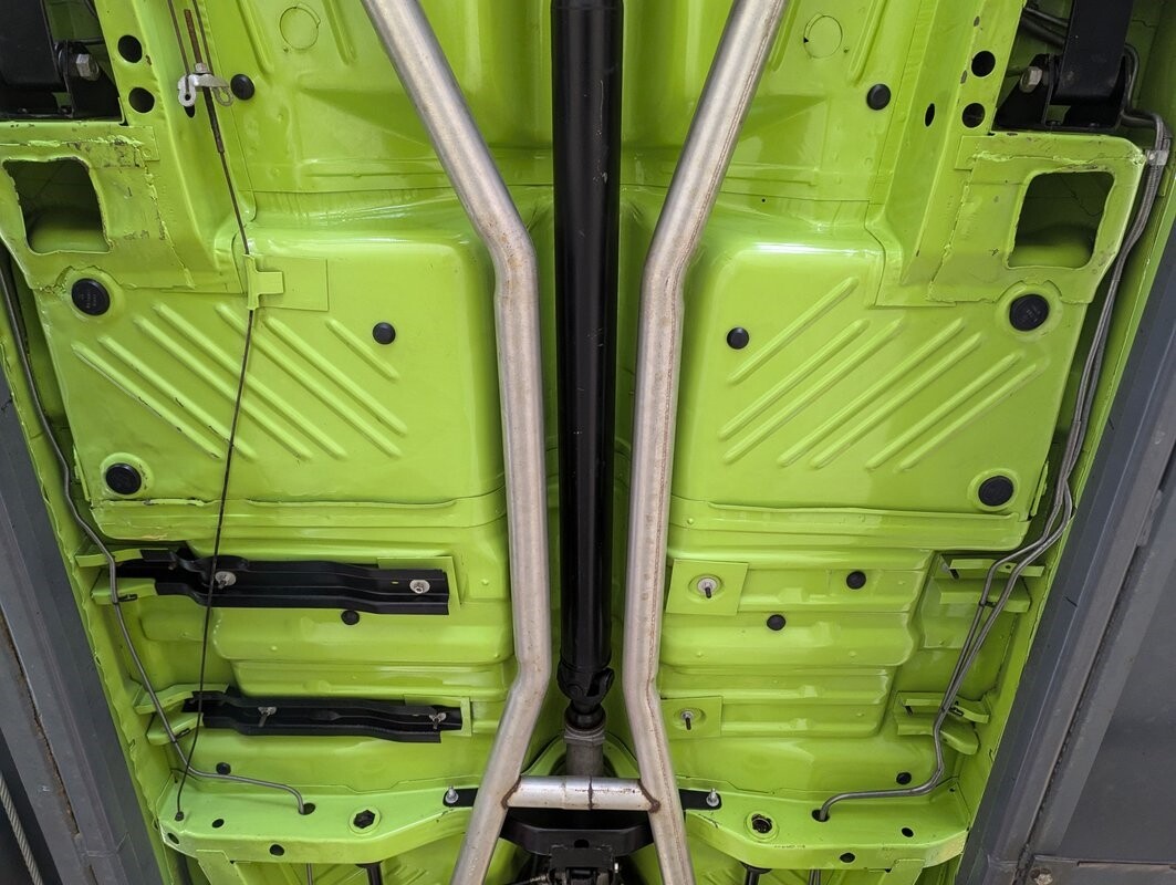 UNDERSIDE: Wow, this is highly detailed underneath! It was flipped on a rotisserie; every component was removed. It has all clean frame rails, floors, rockers etc. painted a gloss sublime green. All the suspension and steering was completely rebuilt. It has the correct factory type dual exhaust system with the square tips going through the valance. The fuel system was replaced including the tank. The brakes were completely rebuilt, lines replaced, e-brake is hooked, up it has disc in front. Looking up at the motor it is spotless, the VIN number by the oil pan matches the car. It also has a VIN number matching 727 Torqueflite automatic trans, it was restored. The drive shaft was rebuilt, and it's hooked to an 8 3/4 rear with 3.23 Sure Grip gears.