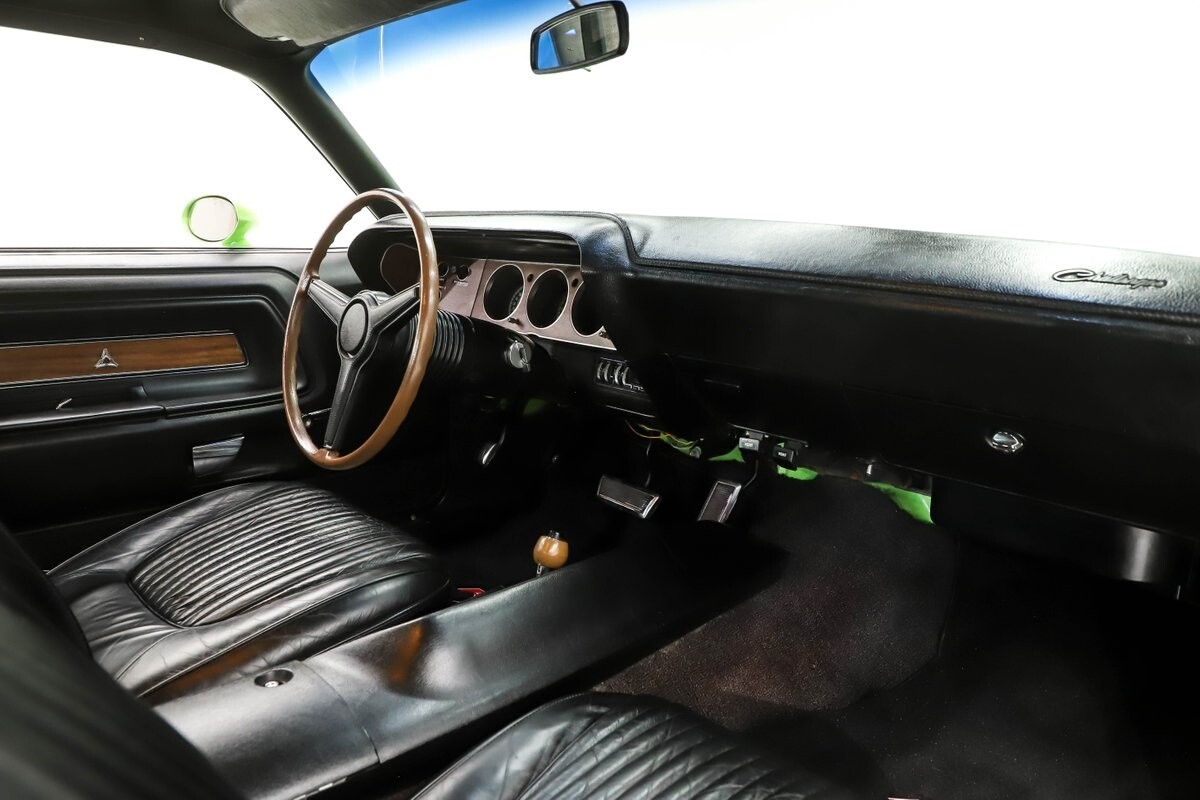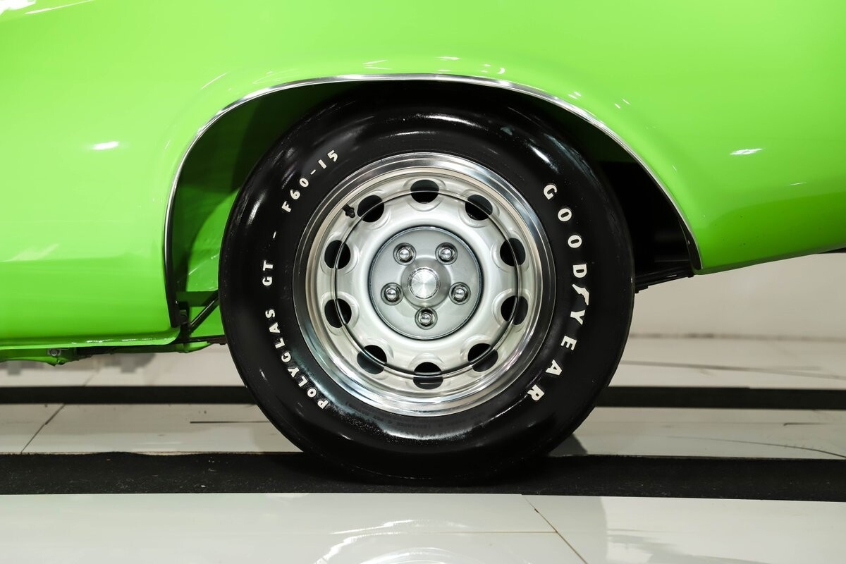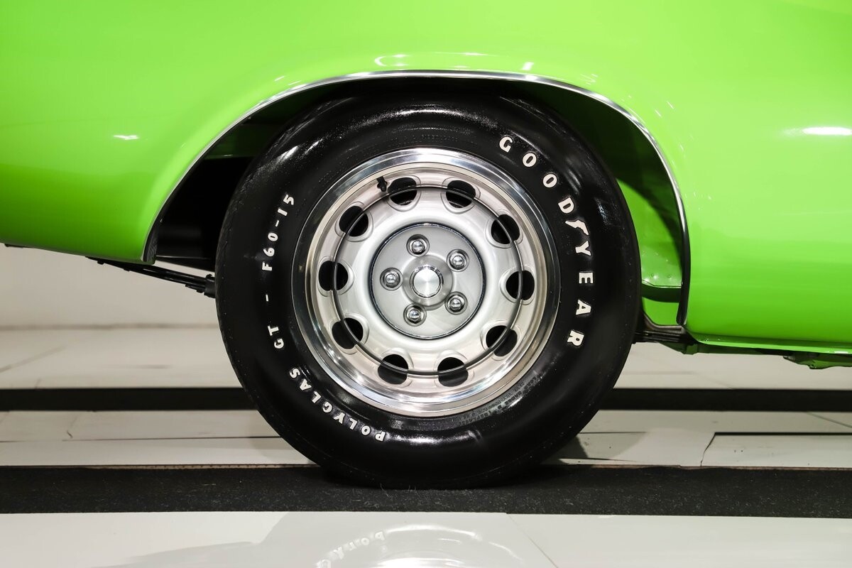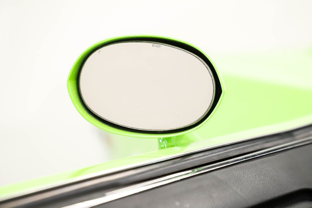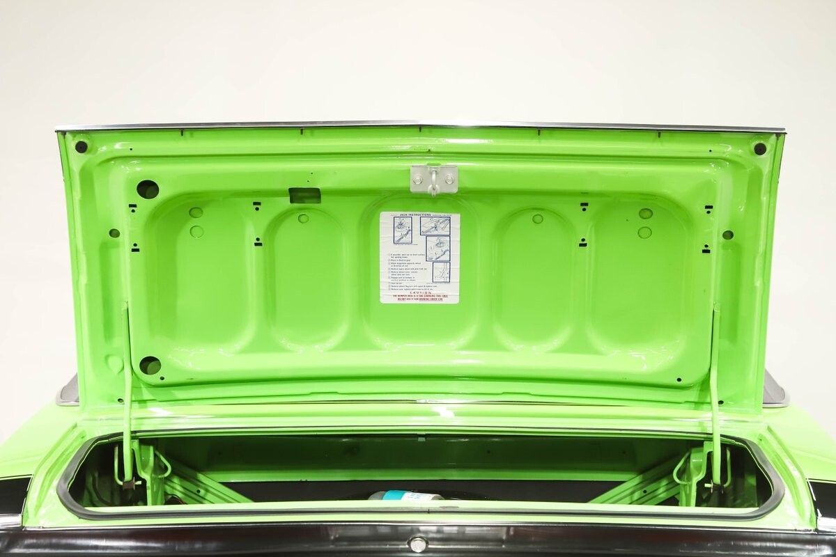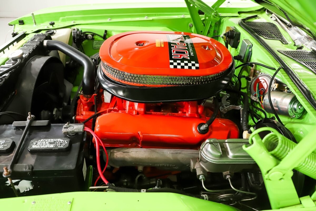 EXTERIOR: It's better than the assembly line made it! The body is laser straight, the gaps are square and flush. There's no rust, bubbles, or damage. The power bulge hood and racing mirrors are an indication of what this car is about. According to the tag it was born this high impact Sublime Green and it is polished like glass. It also has the painted gloss black tail stripe. The black hood patch and vinyl top are like new. All the chrome and trim is straight and shiny, even the racing style gas cap. New hood pins and wheel opening moldings. It sits proud on a set of 15 inch Rallye wheels and reproduction tires.