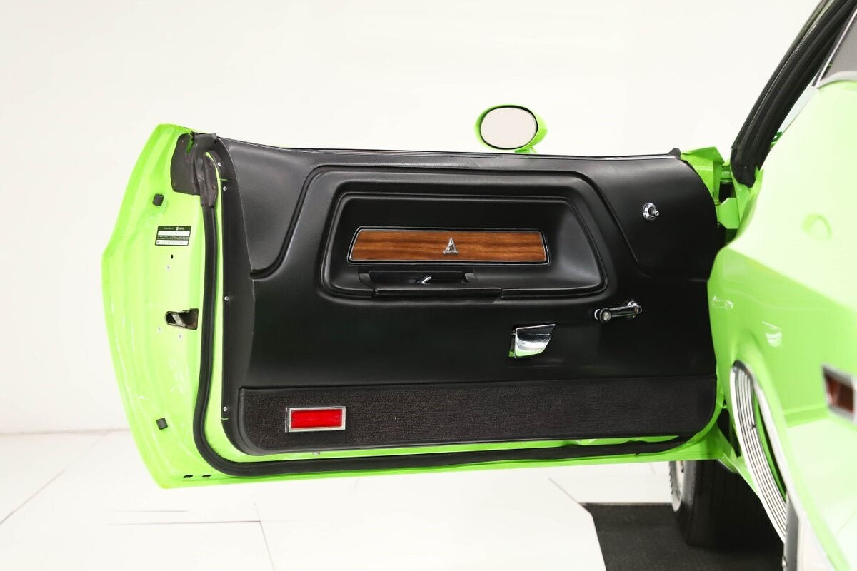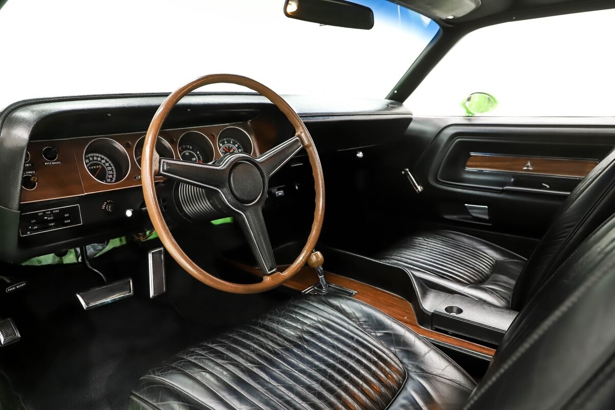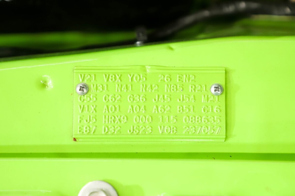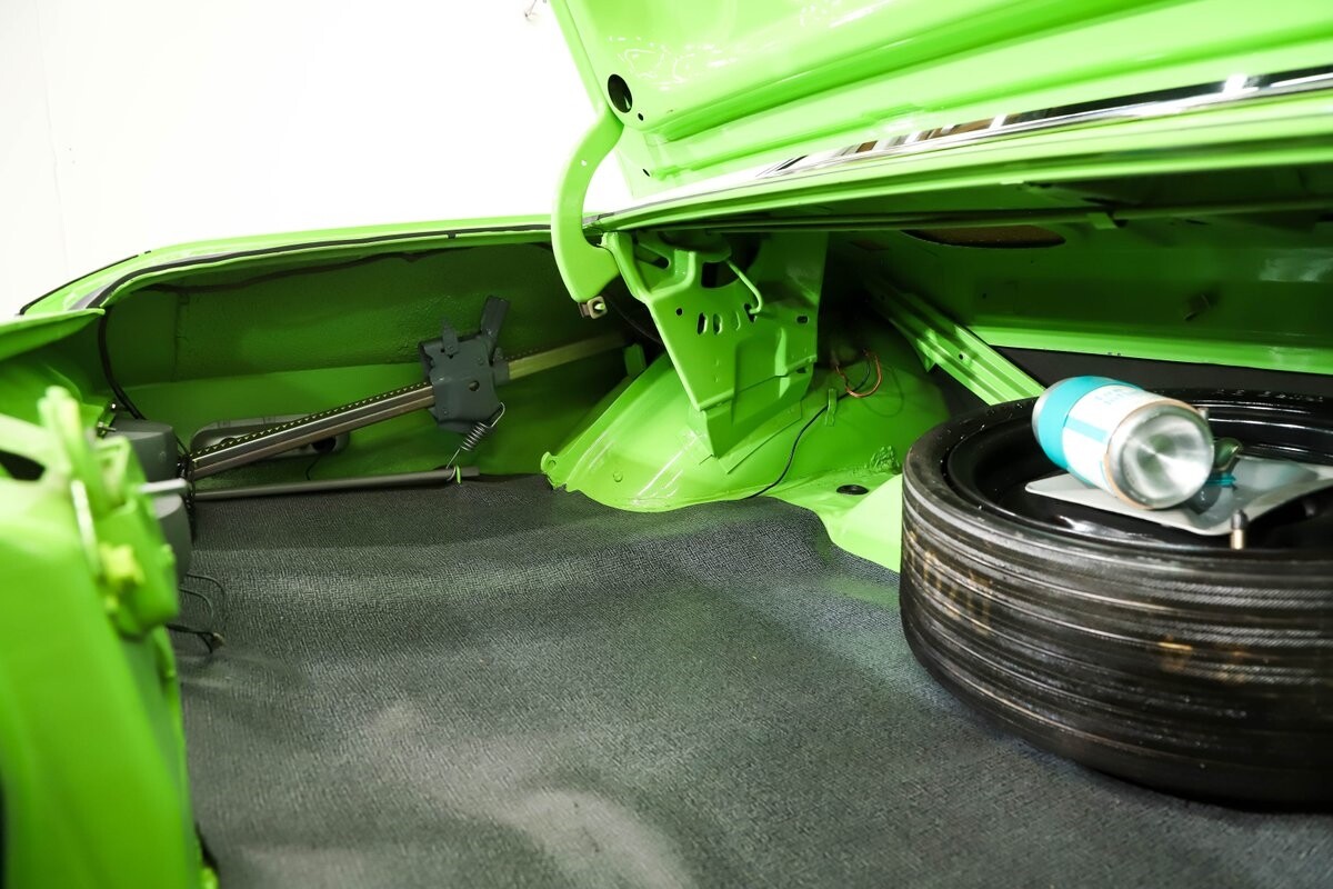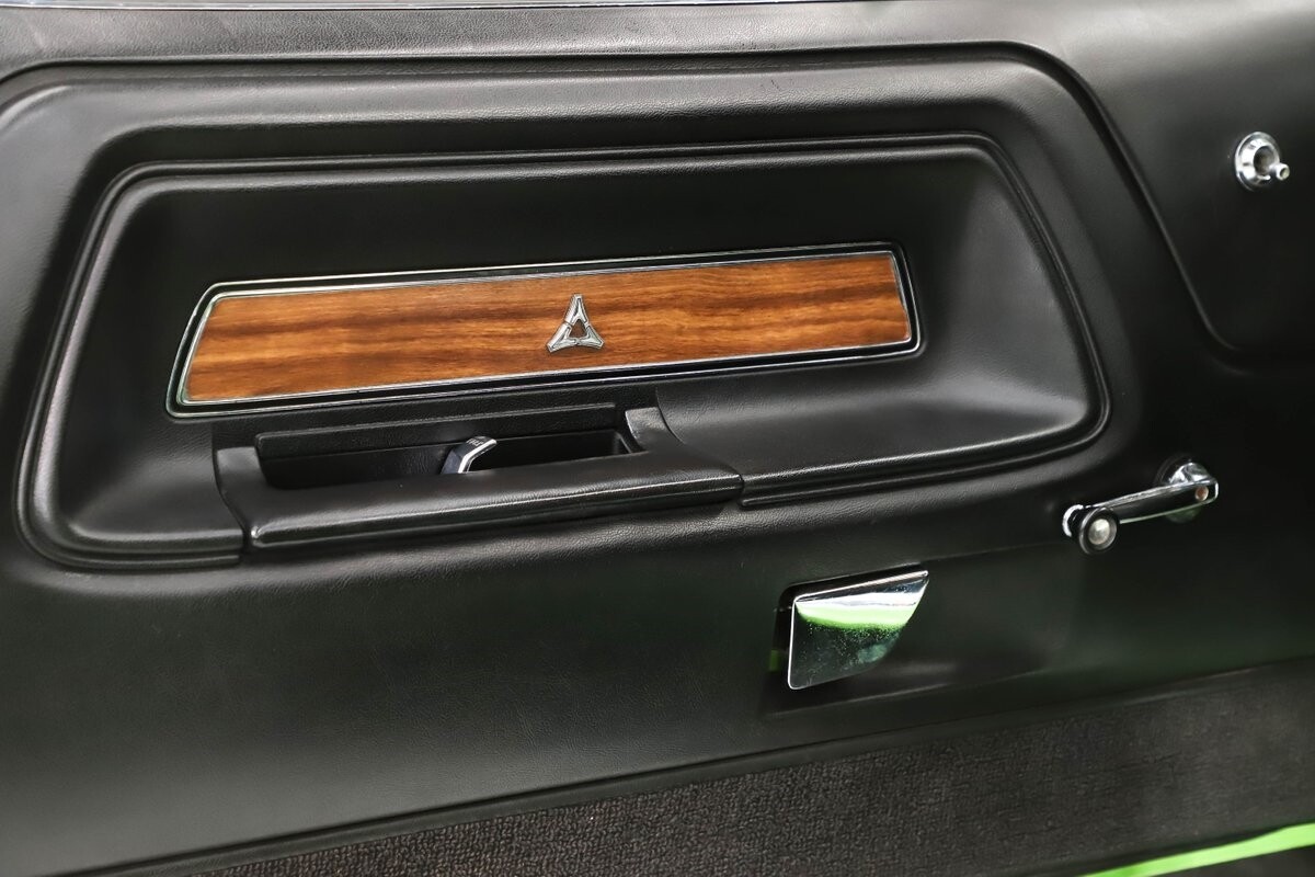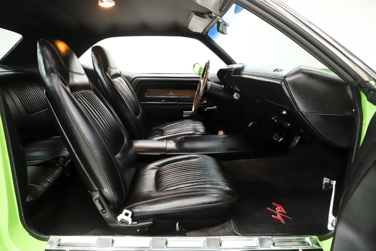 EXTERIOR: It's better than the assembly line made it! The body is laser straight, the gaps are square and flush. There's no rust, bubbles, or damage. The power bulge hood and racing mirrors are an indication of what this car is about. According to the tag it was born this high impact Sublime Green and it is polished like glass. It also has the painted gloss black tail stripe. The black hood patch and vinyl top are like new. All the chrome and trim is straight and shiny, even the racing style gas cap. New hood pins and wheel opening moldings. It sits proud on a set of 15 inch Rallye wheels and reproduction tires.