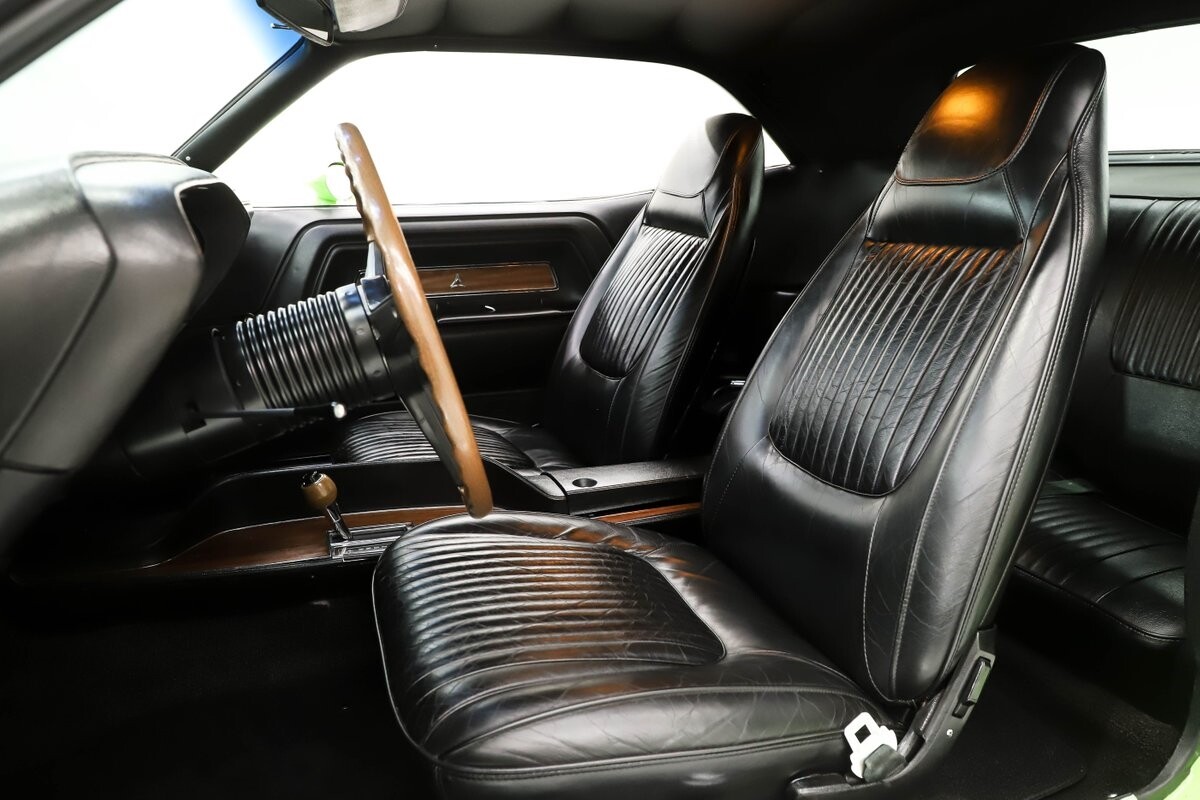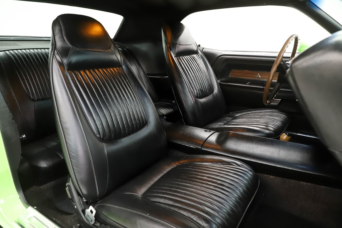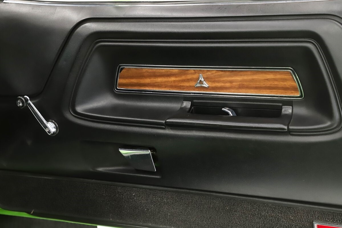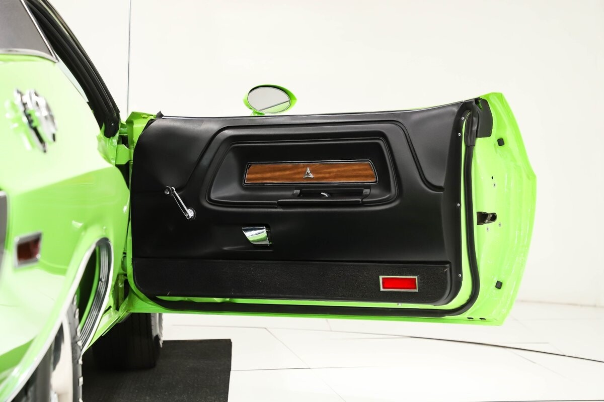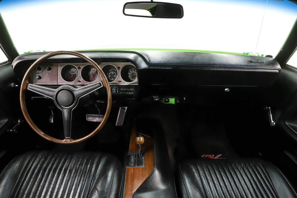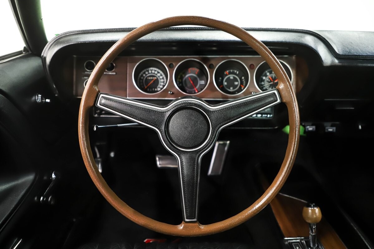 EXTERIOR: It's better than the assembly line made it! The body is laser straight, the gaps are square and flush. There's no rust, bubbles, or damage. The power bulge hood and racing mirrors are an indication of what this car is about. According to the tag it was born this high impact Sublime Green and it is polished like glass. It also has the painted gloss black tail stripe. The black hood patch and vinyl top are like new. All the chrome and trim is straight and shiny, even the racing style gas cap. New hood pins and wheel opening moldings. It sits proud on a set of 15 inch Rallye wheels and reproduction tires.