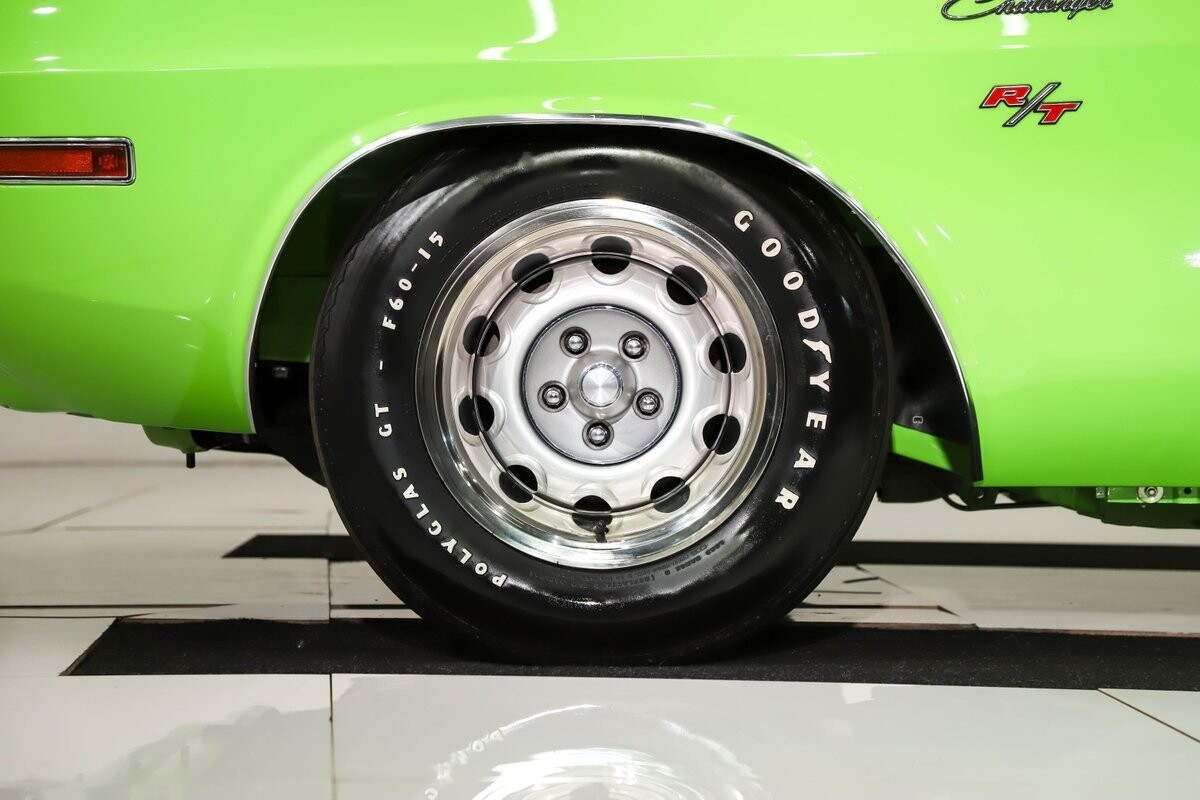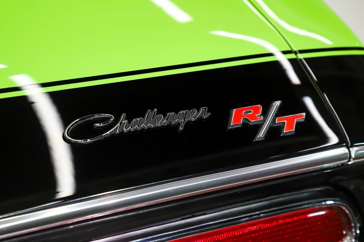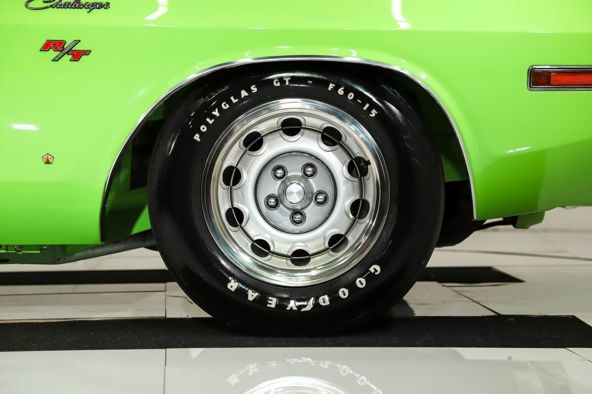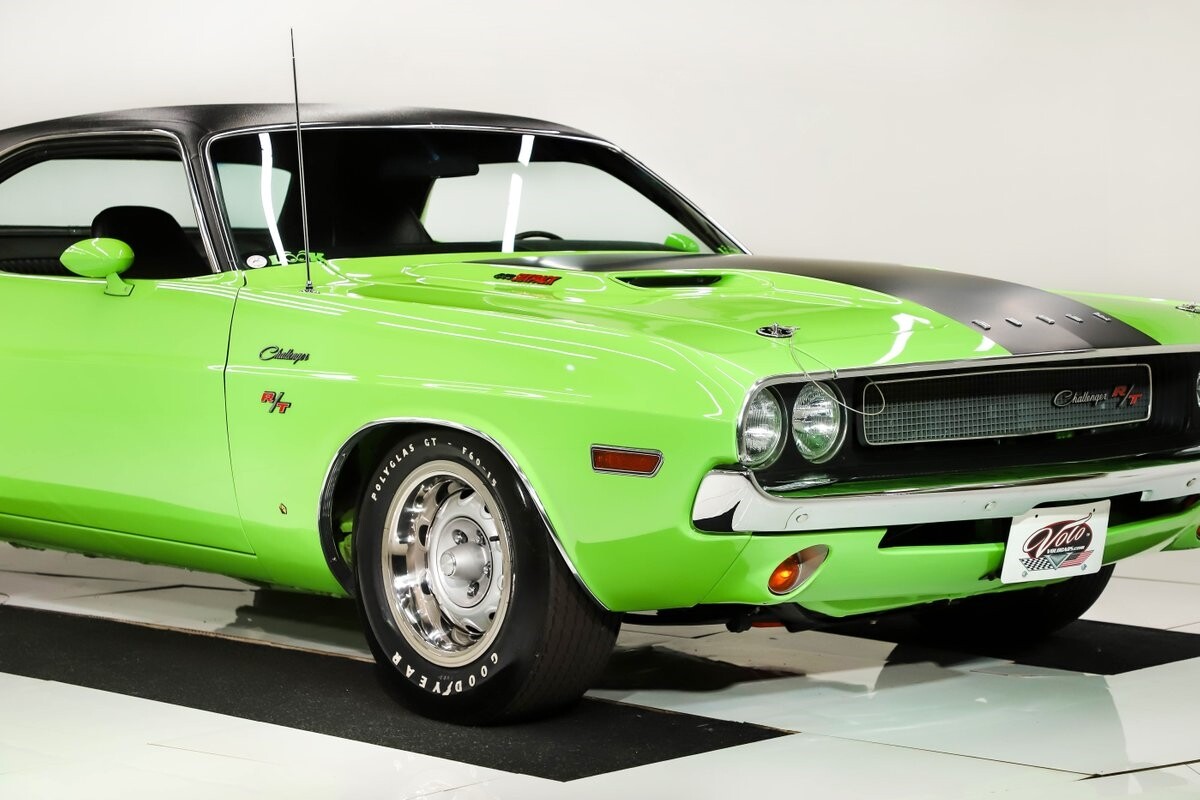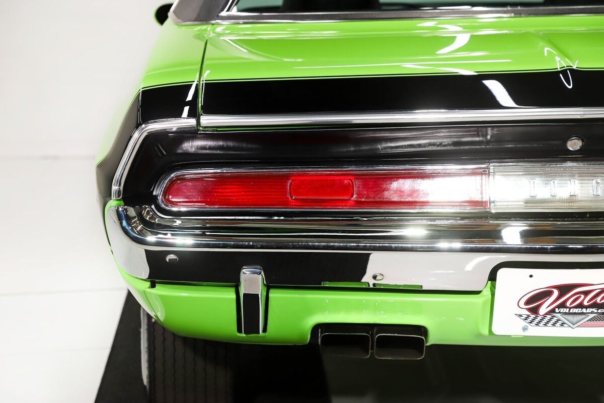 EXTERIOR: It's better than the assembly line made it! The body is laser straight, the gaps are square and flush. There's no rust, bubbles, or damage. The power bulge hood and racing mirrors are an indication of what this car is about. According to the tag it was born this high impact Sublime Green and it is polished like glass. It also has the painted gloss black tail stripe. The black hood patch and vinyl top are like new. All the chrome and trim is straight and shiny, even the racing style gas cap. New hood pins and wheel opening moldings. It sits proud on a set of 15 inch Rallye wheels and reproduction tires.
