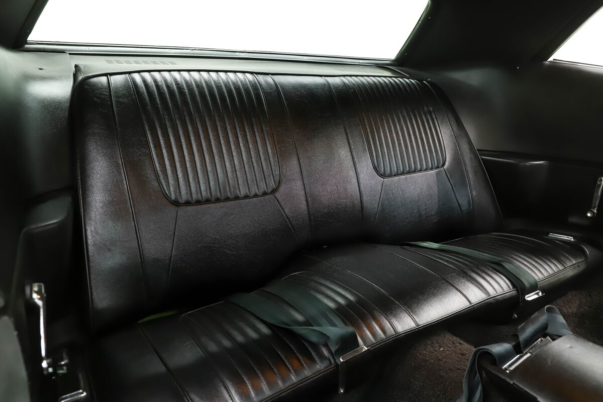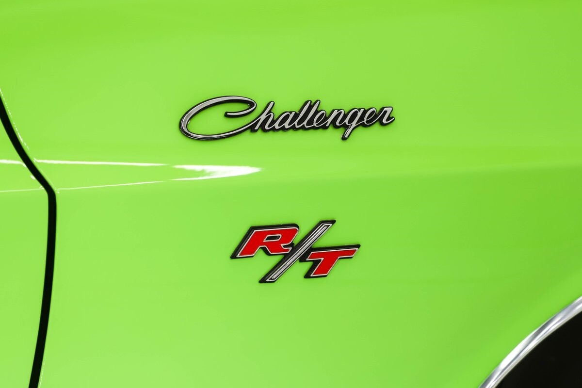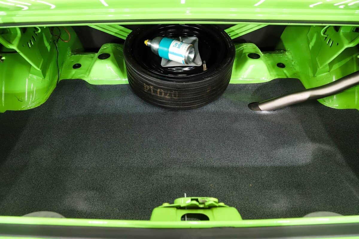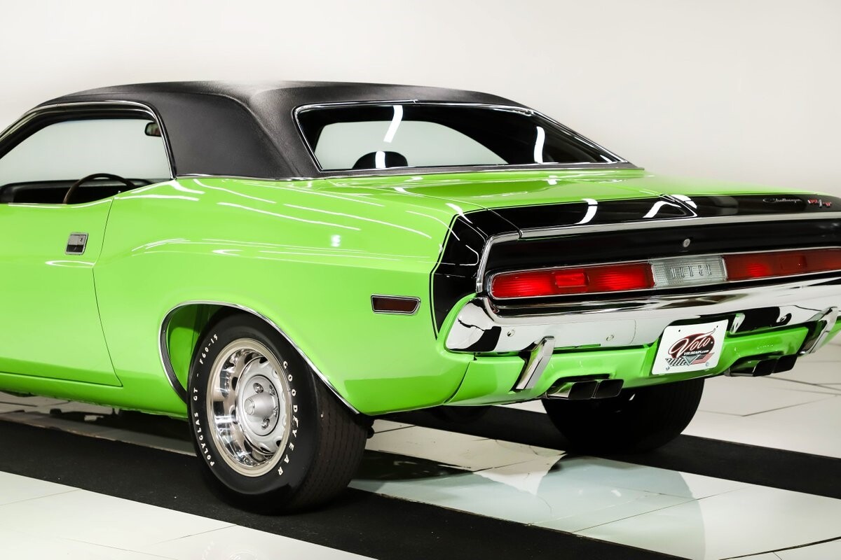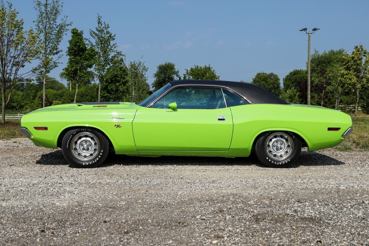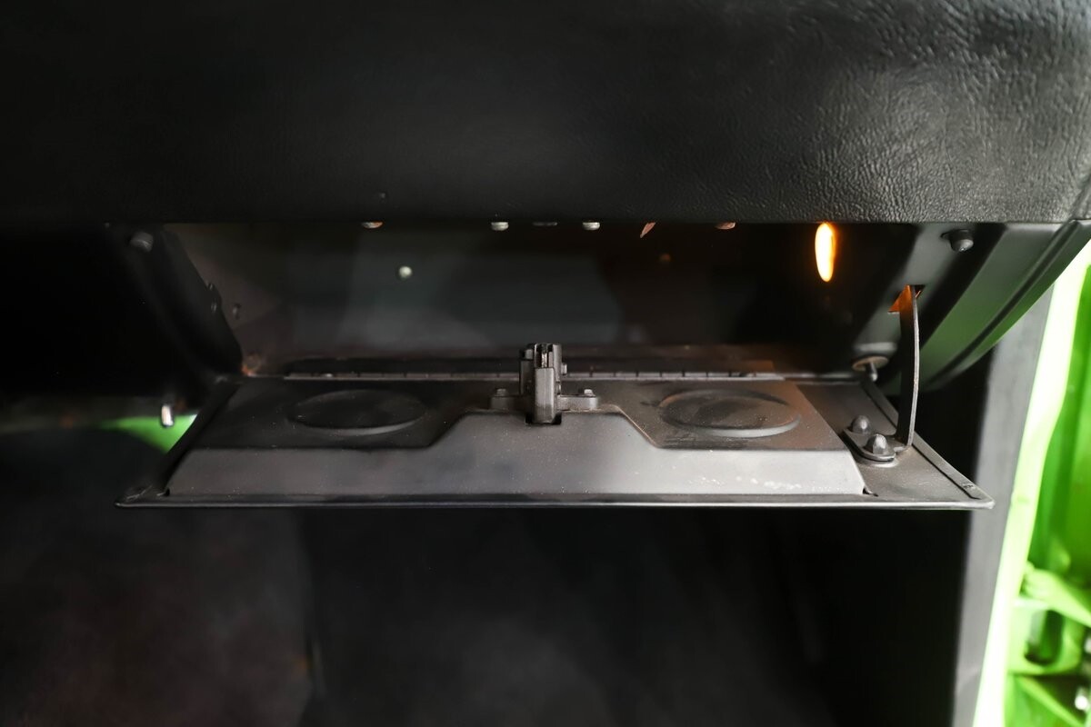 EXTERIOR: It's better than the assembly line made it! The body is laser straight, the gaps are square and flush. There's no rust, bubbles, or damage. The power bulge hood and racing mirrors are an indication of what this car is about. According to the tag it was born this high impact Sublime Green and it is polished like glass. It also has the painted gloss black tail stripe. The black hood patch and vinyl top are like new. All the chrome and trim is straight and shiny, even the racing style gas cap. New hood pins and wheel opening moldings. It sits proud on a set of 15 inch Rallye wheels and reproduction tires.