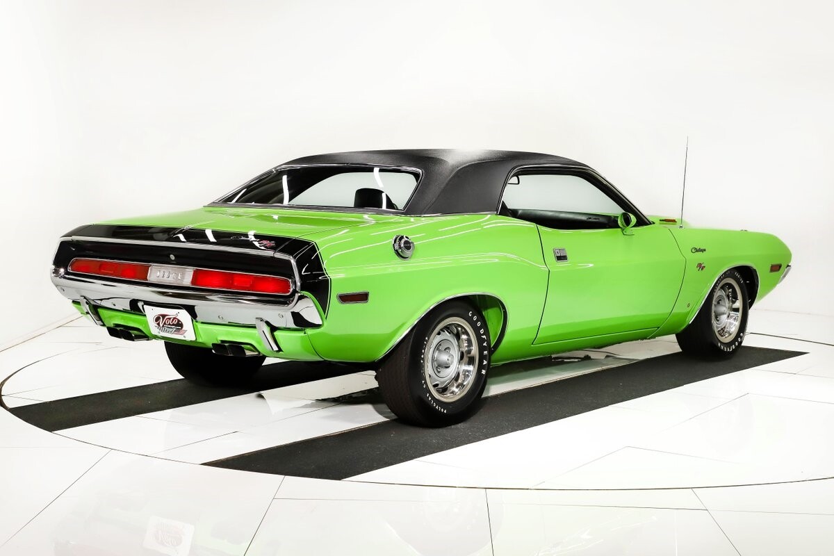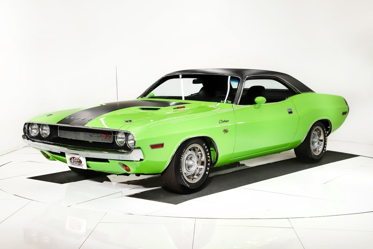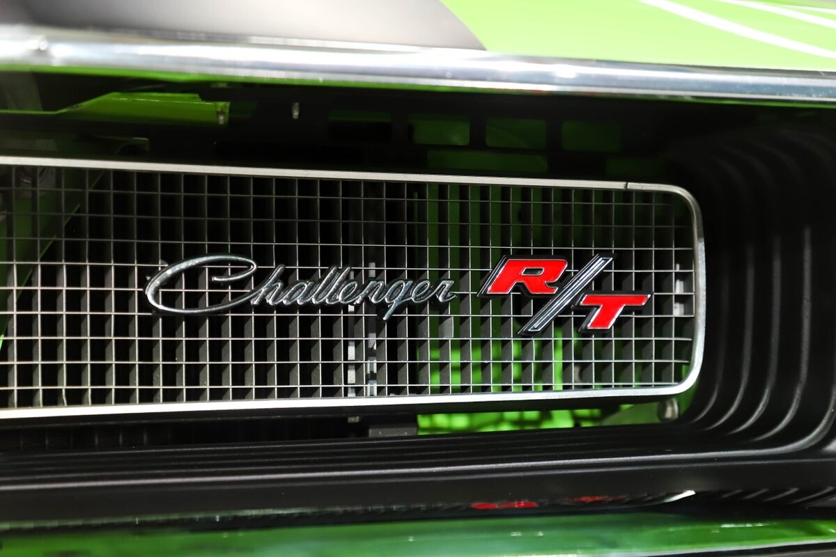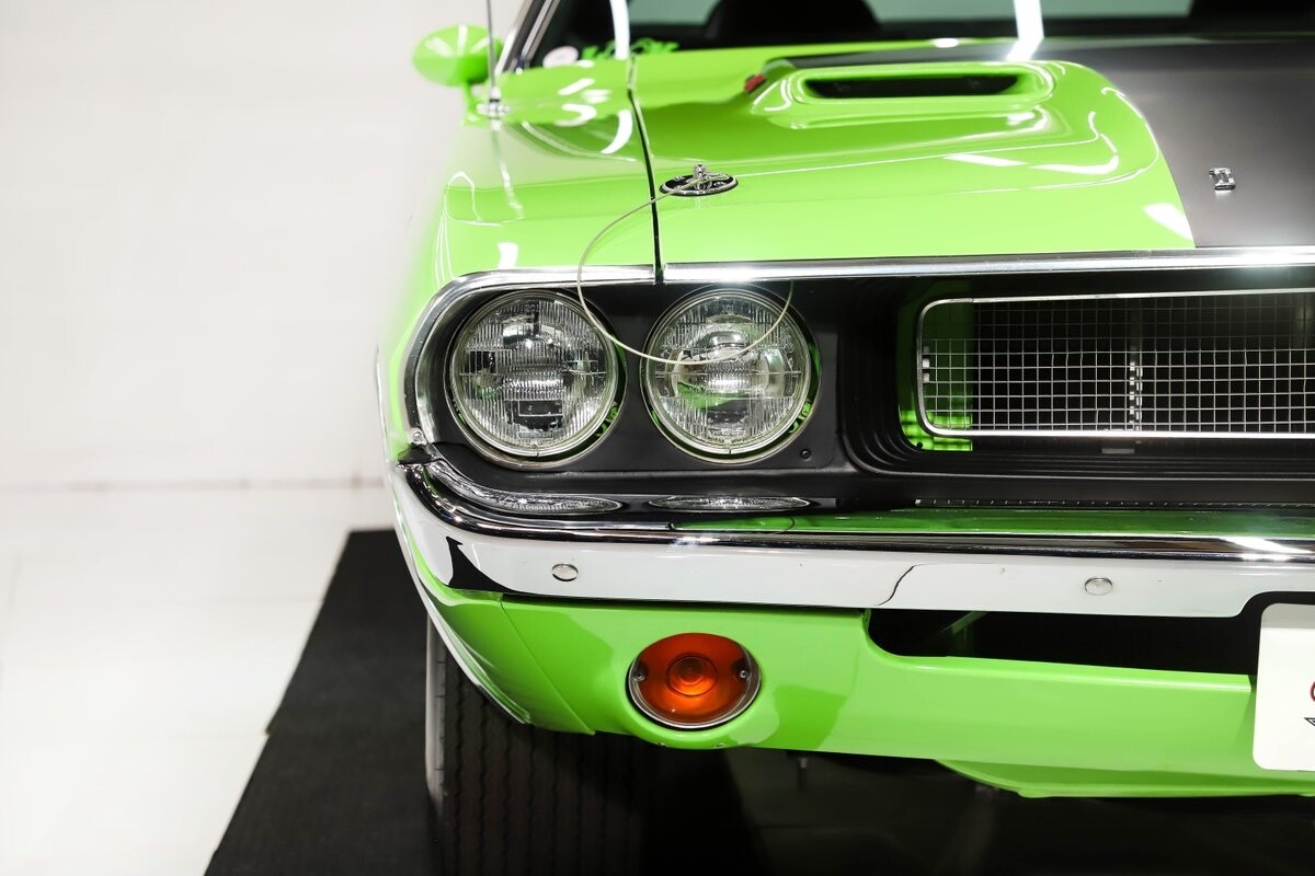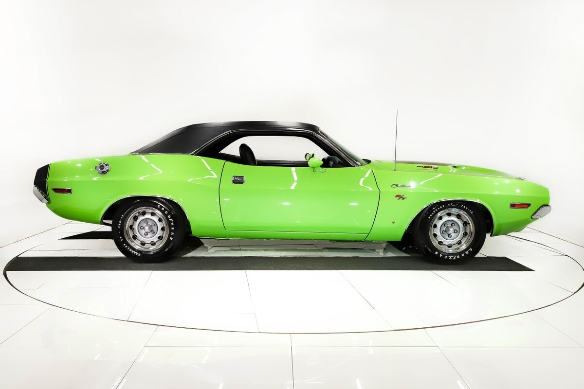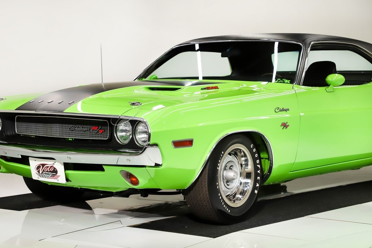 EXTERIOR: It's better than the assembly line made it! The body is laser straight, the gaps are square and flush. There's no rust, bubbles, or damage. The power bulge hood and racing mirrors are an indication of what this car is about. According to the tag it was born this high impact Sublime Green and it is polished like glass. It also has the painted gloss black tail stripe. The black hood patch and vinyl top are like new. All the chrome and trim is straight and shiny, even the racing style gas cap. New hood pins and wheel opening moldings. It sits proud on a set of 15 inch Rallye wheels and reproduction tires.