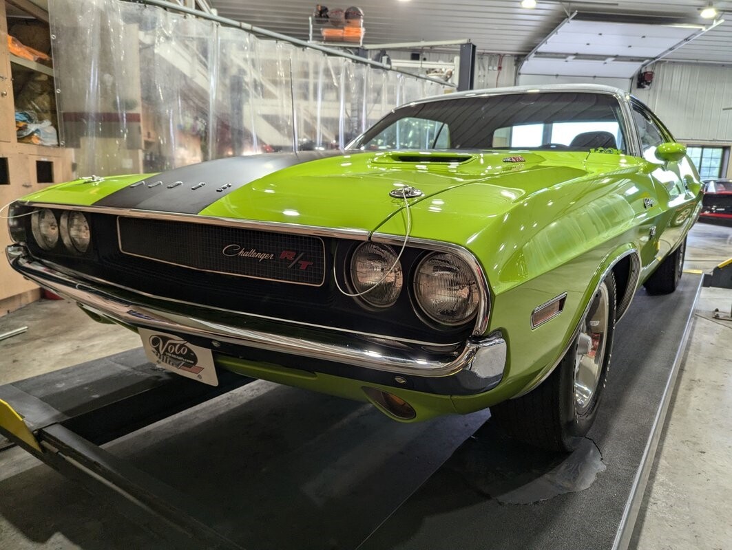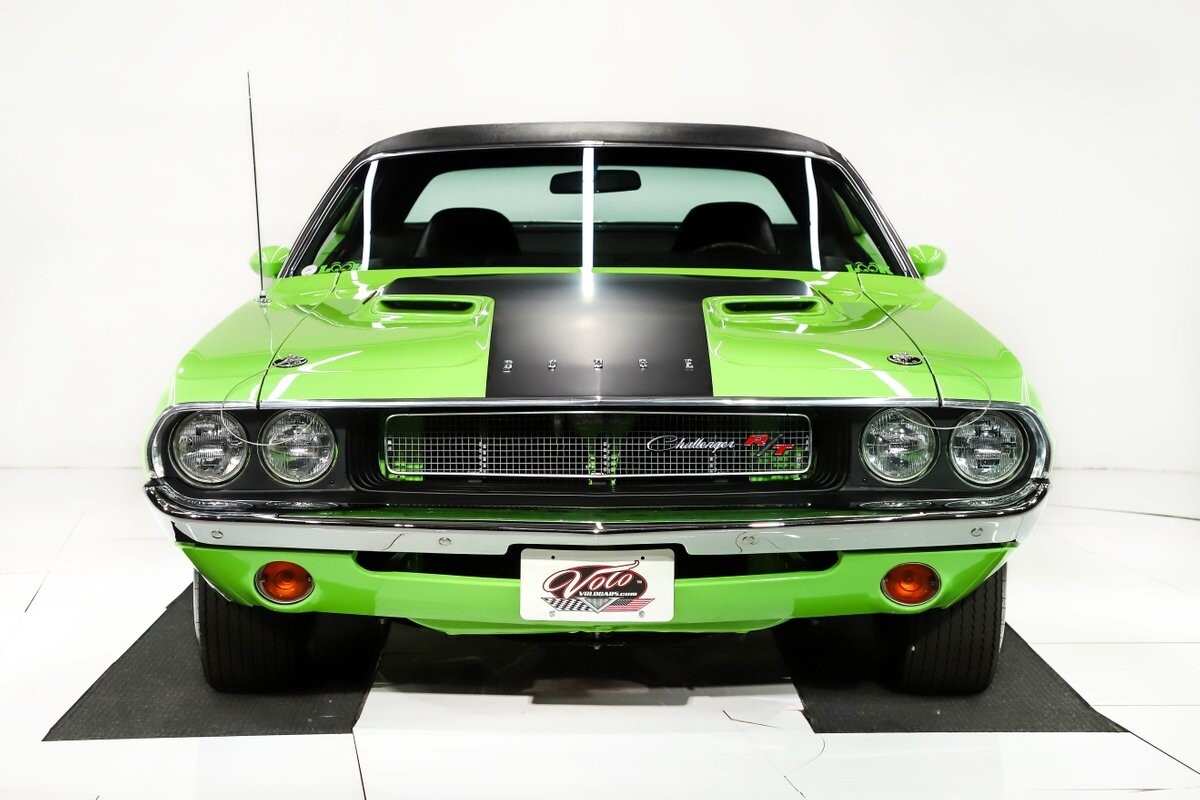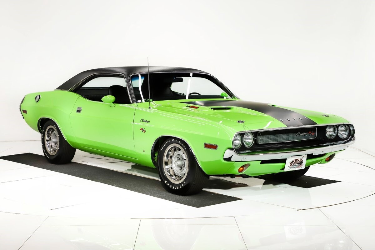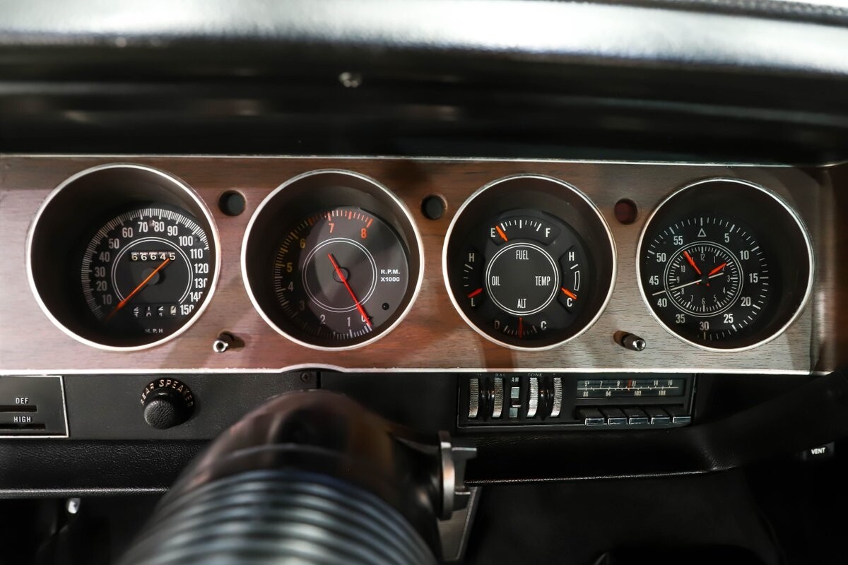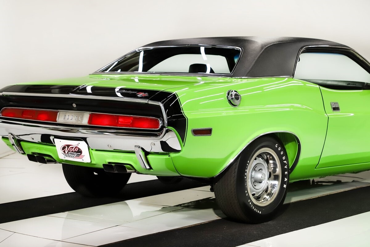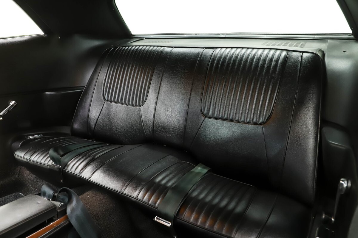 EXTERIOR: It's better than the assembly line made it! The body is laser straight, the gaps are square and flush. There's no rust, bubbles, or damage. The power bulge hood and racing mirrors are an indication of what this car is about. According to the tag it was born this high impact Sublime Green and it is polished like glass. It also has the painted gloss black tail stripe. The black hood patch and vinyl top are like new. All the chrome and trim is straight and shiny, even the racing style gas cap. New hood pins and wheel opening moldings. It sits proud on a set of 15 inch Rallye wheels and reproduction tires.