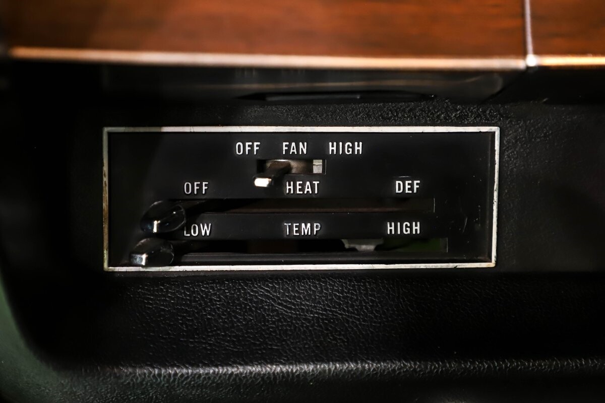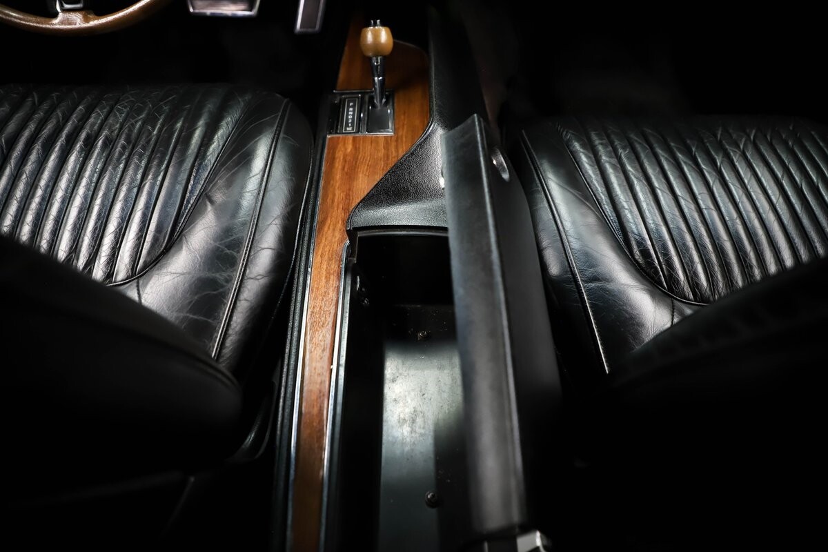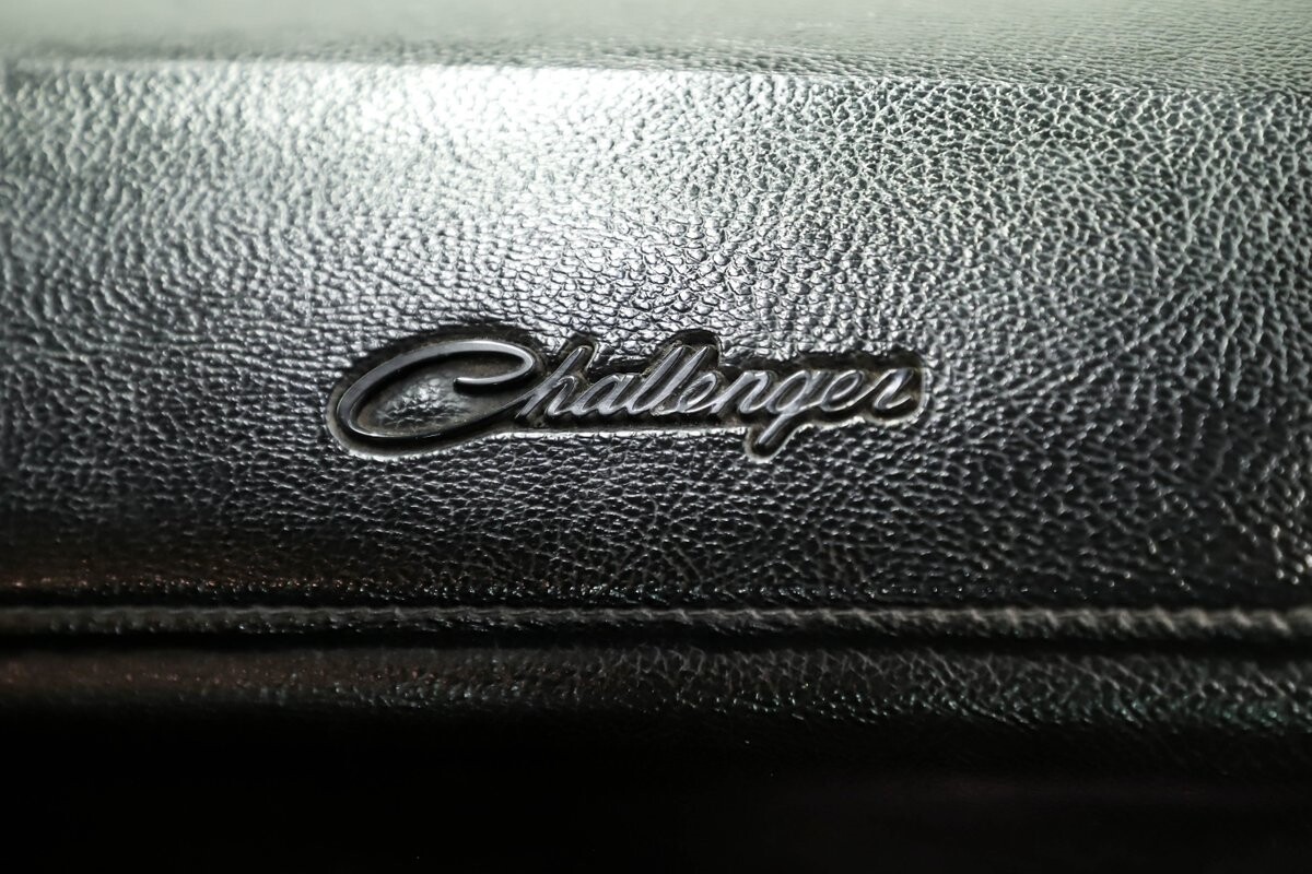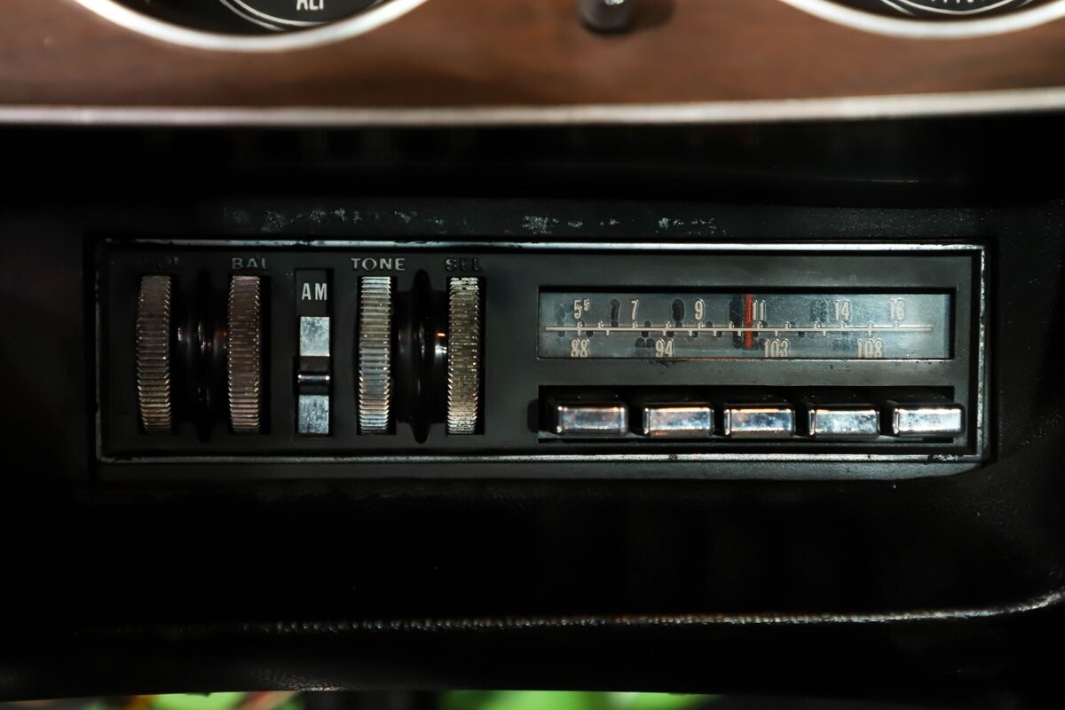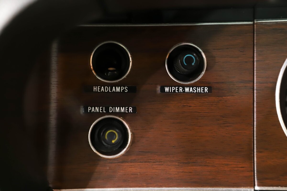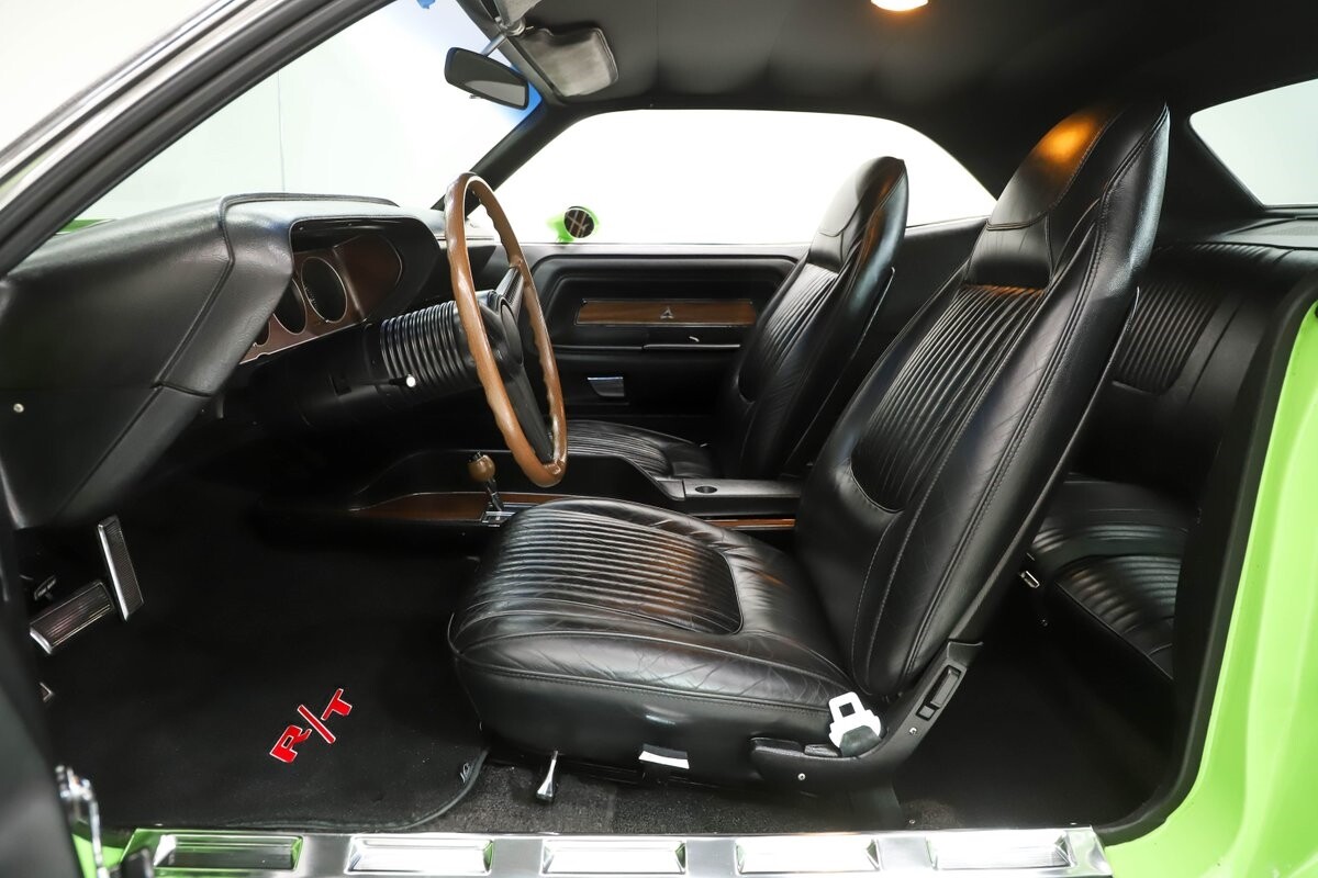 INTERIOR: Right now I'm sitting inside a beautifully restored, well optioned R/T. Down on the floor the carpet was replaced and it has R/T embroidered mats. The bucket seats are optional genuine soft leather. The driver side has the optional six-way adjuster. The center console is original and in very good shape with the slapstick shifter. It has a complete set of seat belts. In front of me is a real nice dash pad with the stereo speakers. It also has Rallye instrument panel with the full set of gauges including tachometer. All the wood grain, knobs, heater controls, glove box, steering wheel look great. It has a factory AM/FM stereo with a rear speaker control. The door panels and all the plastic trim are excellent. The headliner was replaced and is tight as a drum. The interior lights work.