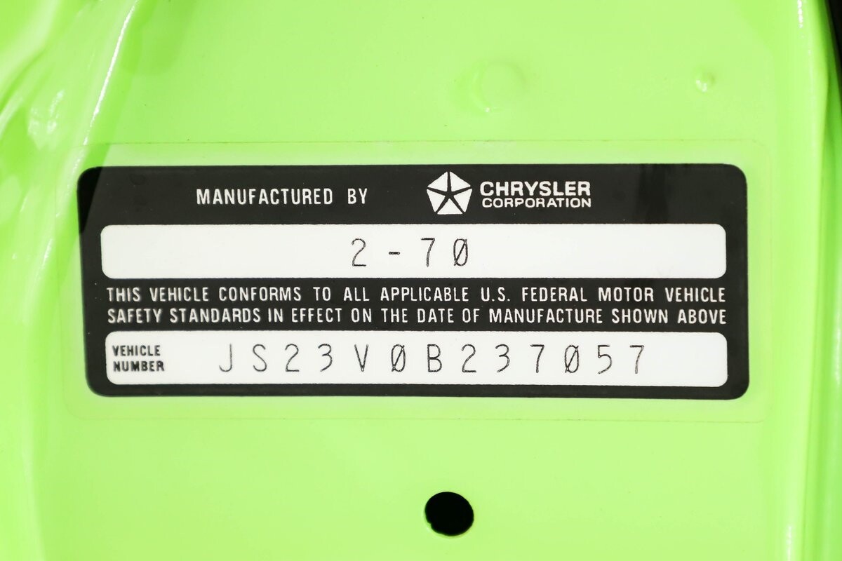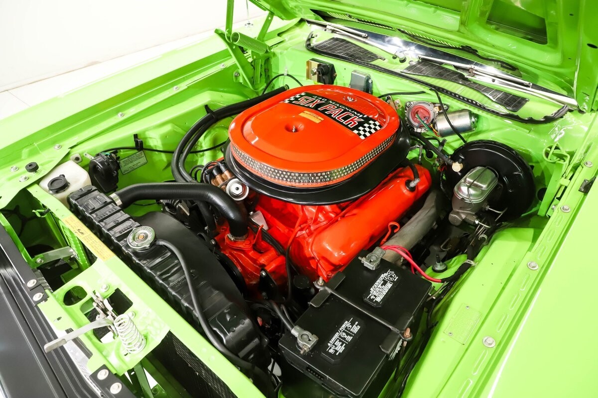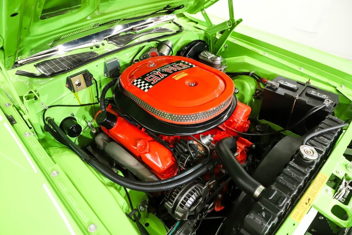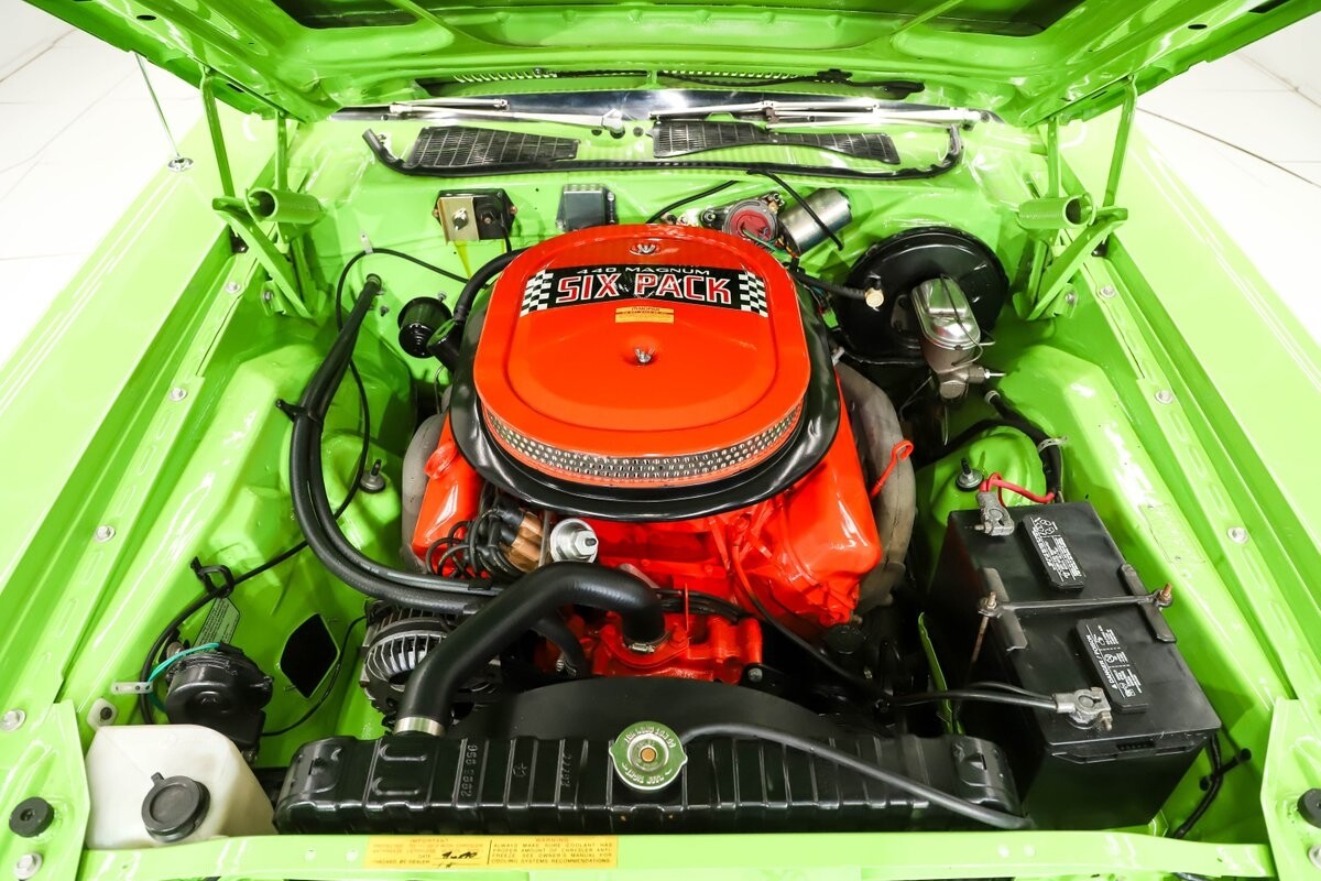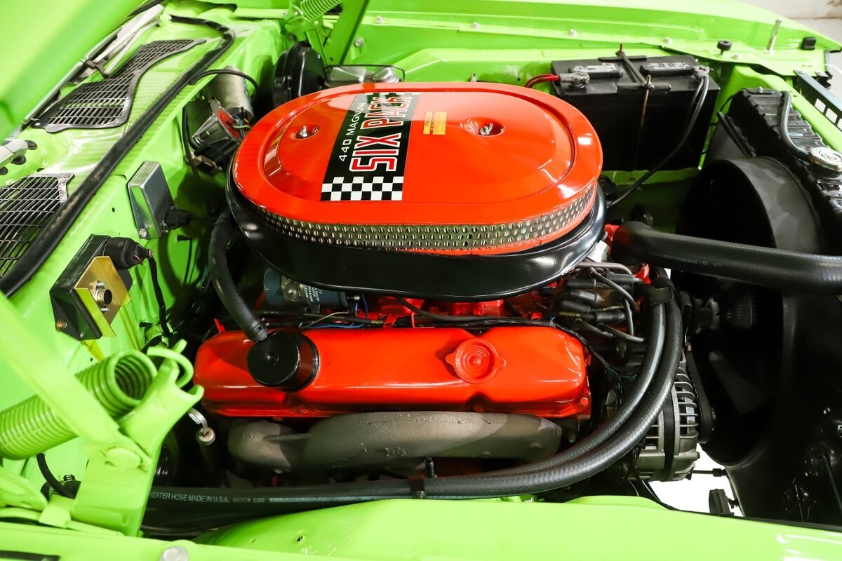 ENGINE COMPARTMENT: This has the VIN number matching 440-390 hp Magnum 6-pack engine. The casting codes and dates lineup. It's completely stock: the manifolds, valve covers, air cleaner and the 3 Holley carbs. It even has date coded spark plug wires. It also features power steering and power brakes. All the components were restored or replaced: wiper motor, alternator, master cylinder etc. It has, horns, Chrysler washer bottle, the battery is bolted down properly. Correct Mopar radiator, shroud, and fan. The entire engine bay is painted gloss sublime green. The VIN number on the cowl, core support and fender tag match the car.